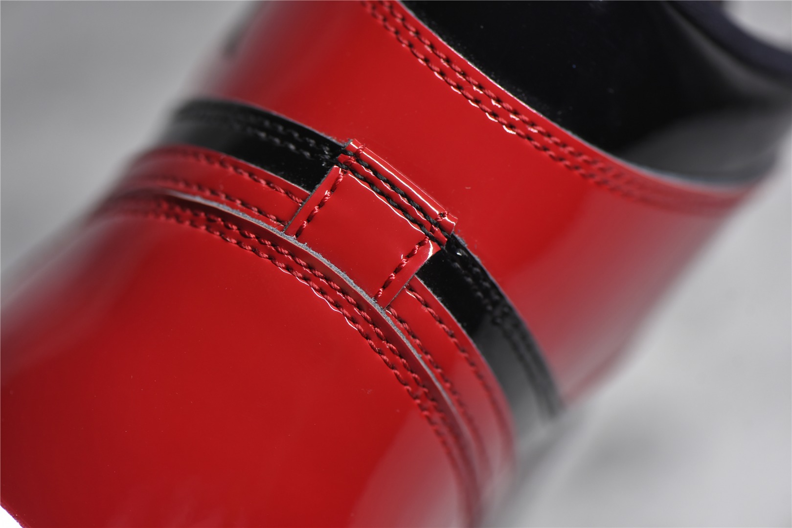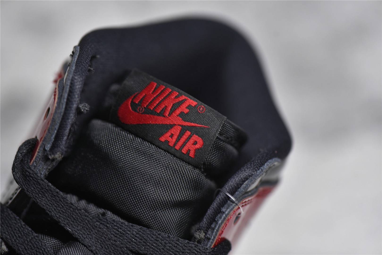 Detail appraisal Air Jordan 1 High OG "Bred Patent" patent leather black red gold man tag