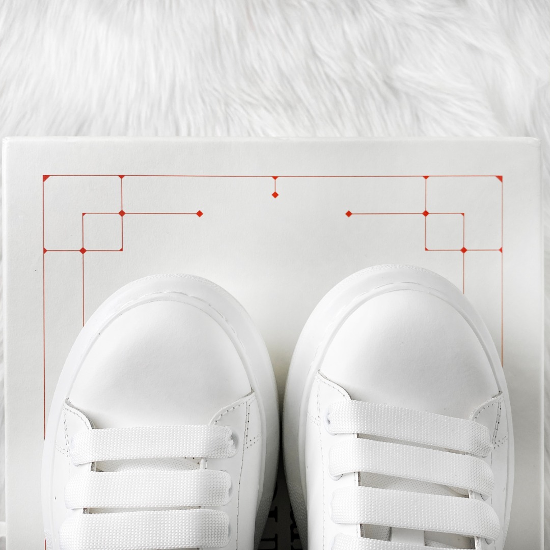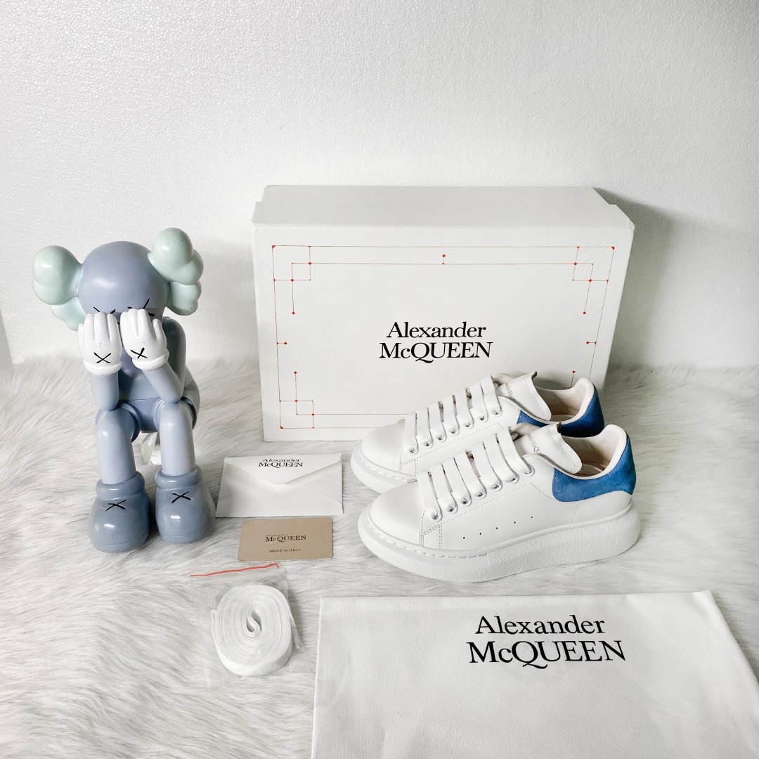 ??Alexan-der MQ white shoes series Top-quality ivory white leather, GUI-level stitching, exquisite workmanship, clear layers and textures, TPU anti-slip mold, outsole, cowhide foot pads, white series and blue tail perfectly blend, perfect details, including original shoe box and dust bag