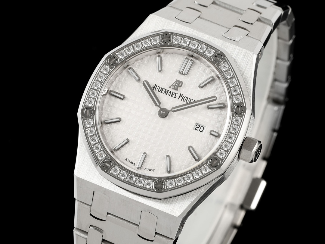 AUDEMARS PIGUET Royal Oak Series 67651OR Ladies' Quartz Watch ~ Shining debut! Goddess versatile style, sparkling and charming! The genuine product purchased through the APP is disassembled and mold-made. The entire process is CNC polished, and the pattern is checked and adjusted multiple times, with distinct edges and corners. The case diameter is 33MM. The multi-faceted bezel precisely fits the case. The bezel is fixed to the case with hexagonal screws (the bezel opening is set with exquisite Swarovski diamonds, dazzling and brilliant). The bracelet links are exquisitely and neatly arranged. The links have undergone hundreds of meticulous polishing processes, presenting a perfect texture. The folding clasp is easy to open and close and convenient to wear. The lugs of the watch are curved, which can ensure a better fit between the watch and the wrist. The dial is engraved with the "Grande Tapisserie" large checkered pattern decoration, paired with fluorescent three-dimensional hour markers and Royal oak hands. The wide hands and hour markers make reading the time simple and clear. The date display window at the three o 'clock position is shown in Arabic numerals. The wristwatch has a sealed case back, on which the English name of the Royal Oak series, "Royal Oak", is engraved. It is equipped with a Swiss F04111 quartz movement inside. Accurate timekeeping! APP production, making goddesses also very royal!