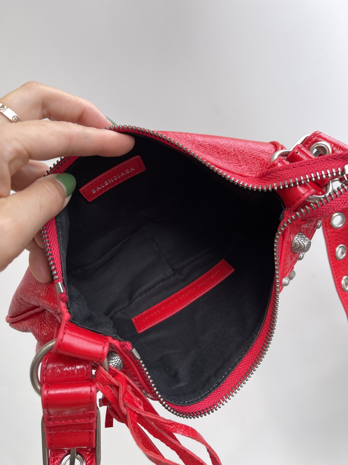 Balenciag BalenciAG SX SMALL 21 year EXCLUSIVE cabinet LATEST Le cagole latest rivets three in ONE armpit dumpling ?? BAG, one shoulder crossbody dumpling crescent-shaped bag, bag body MADE of imported crackled fine sheepskin, wrinkled fabric, shiny leather surface, very GOOD hand feel very DURABLE, softer with use MORE FLAVOR with use MORE There's no bag that looks better the older it's used. It's not afraid of scratches either. It can be placed freely in daily life without any concern at all. Rivets, tassels, weaving - every element is a classic. It is equipped with a detachable zipper storage bag and a detachable heart-shaped mirror, which can be used as a pendant. The zipper opening and closing design, paired with knotted leather pull plates and canvas lining, has an extremely large capacity. It feels particularly suitable for someone like me who wants to take everything out. There's no problem with putting everything in the space. Silver aged metal fittings. The detachable and adjustable wide shoulder straps are also equipped with woven shoulder pads, making the upper body light and comfortable. The details are quite well done. The classic motorcycle bag elements combined with the unique shape of the underarm dumpling bag are super attractive and really cool. They look great when worn and can catch your eye at first sight. It is light, durable and very tough. It can be carried by hand or across the shoulder. It comes in all four seasons. Whether you are shopping or going to any occasion, it is a very eye-catching combination. It is definitely the first choice for cool and cute girls. Come and take it to create a stylish look! Size: 26X16X10cm nNumber: #93737950