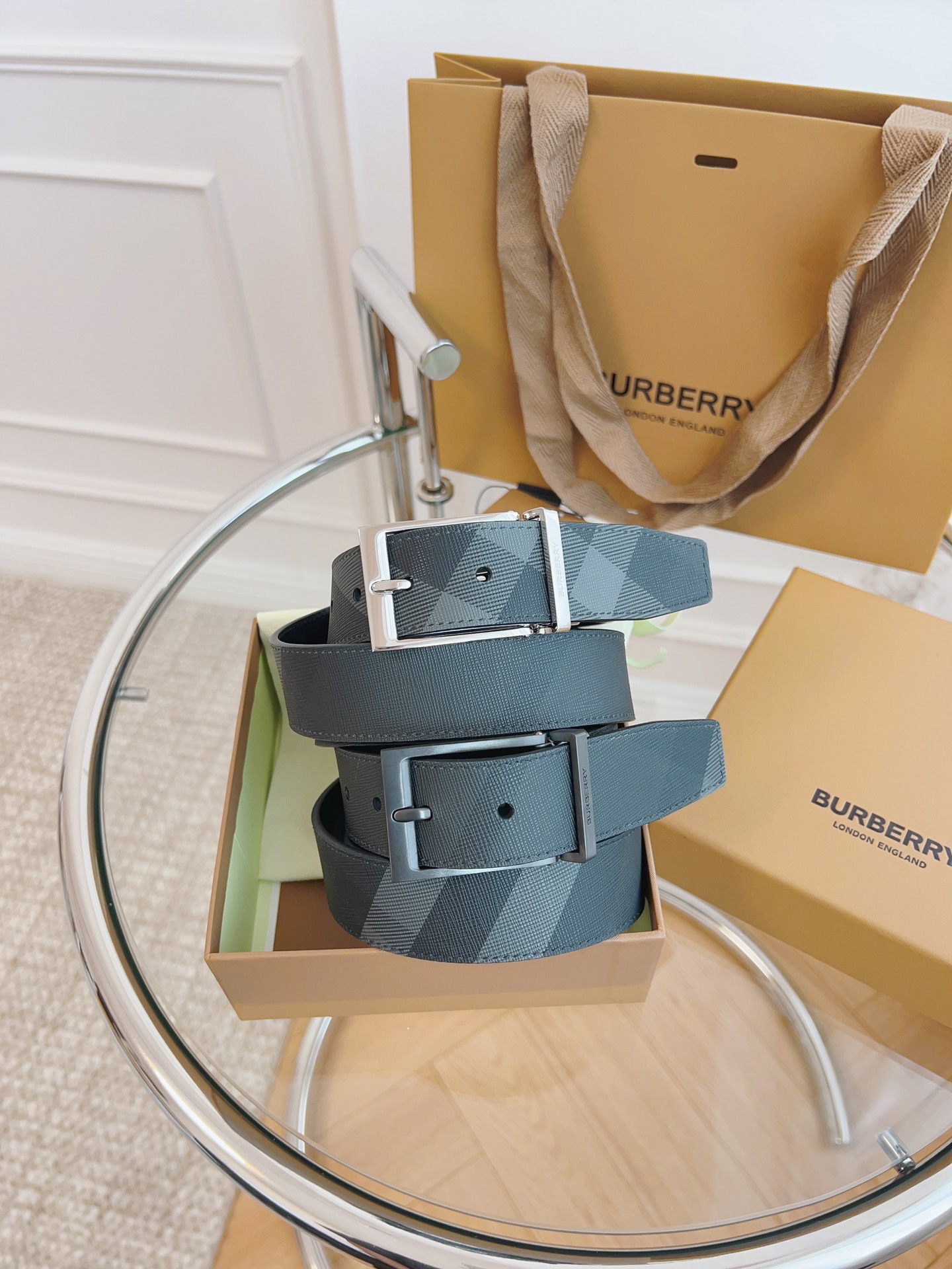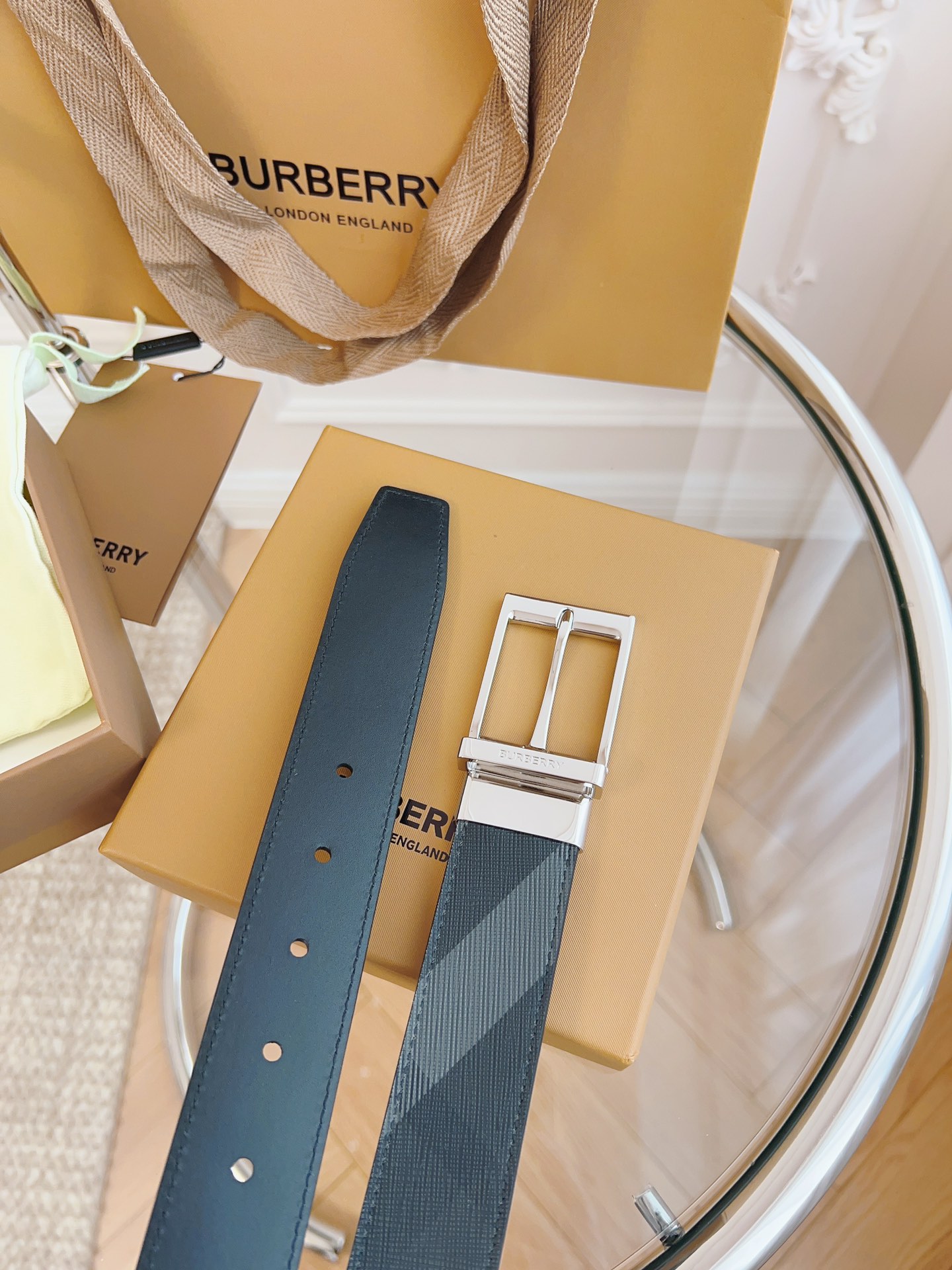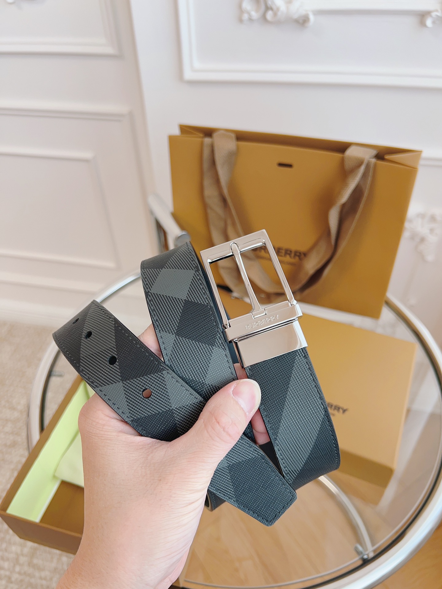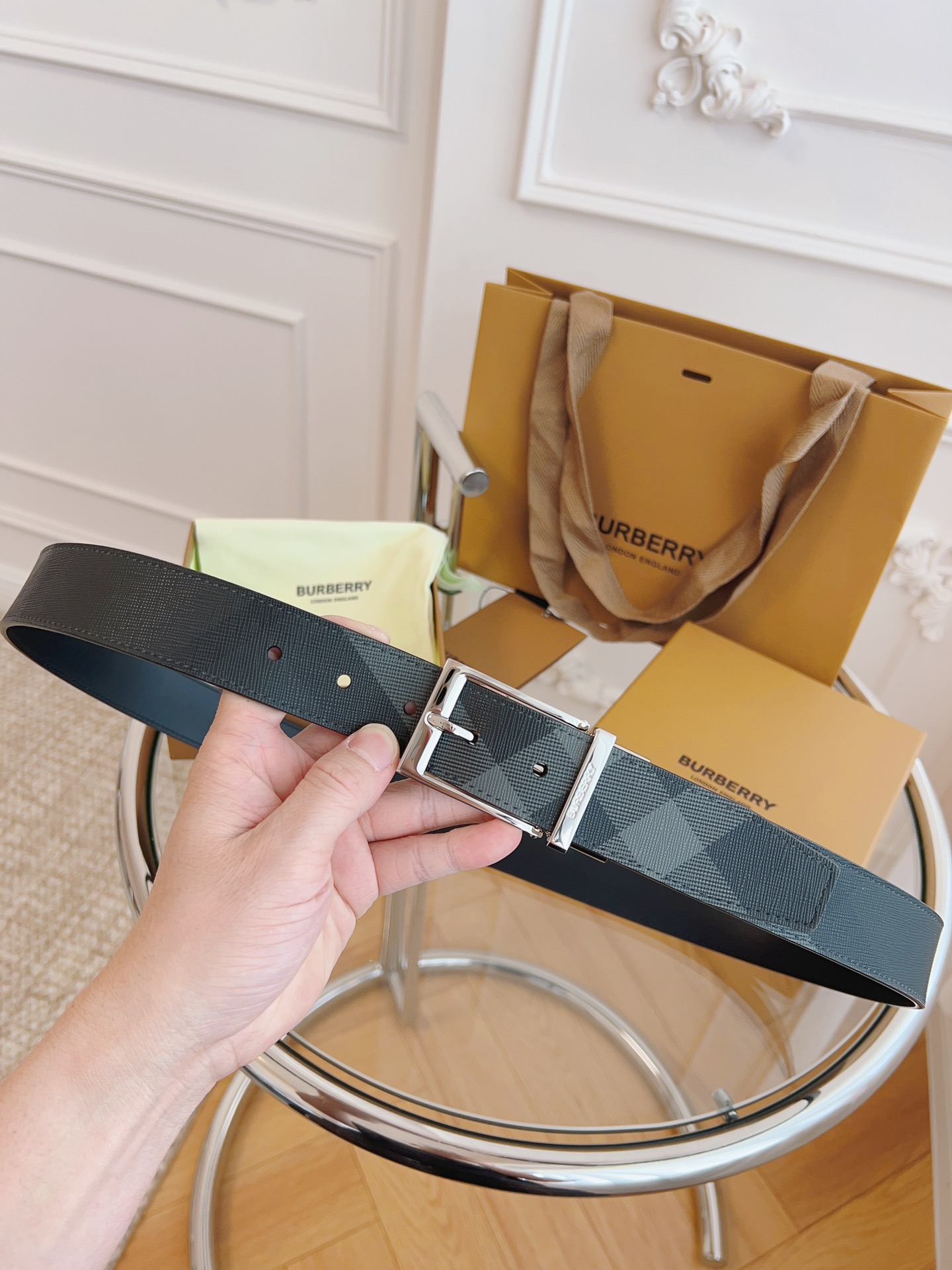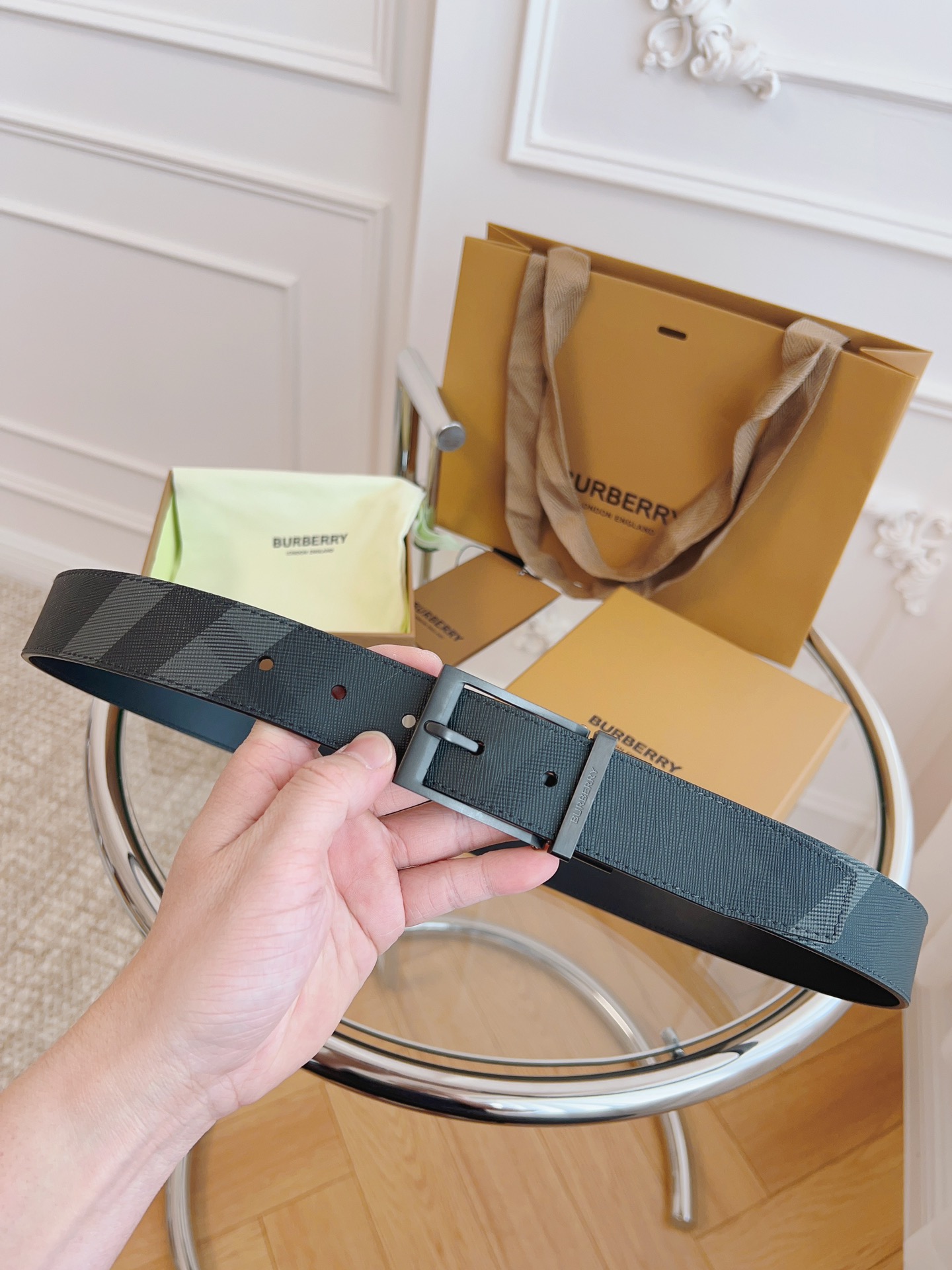 Burberry is made of top-grain leather from the original factory. The quality of the check/cowhide is beyond doubt. There is no better, only the best. The width of the belt is 3.5 cm