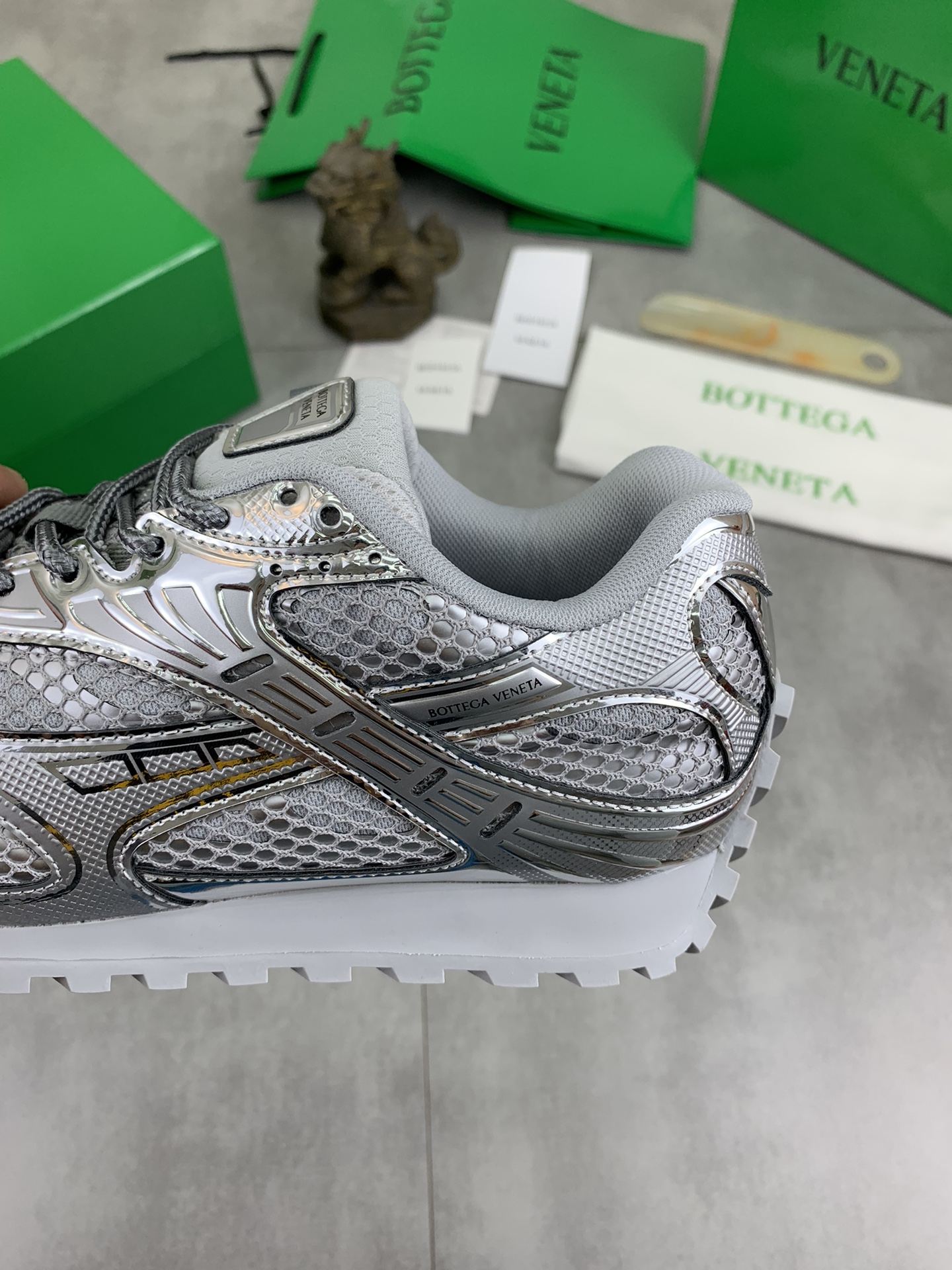 Model #3007??????Bottega Veneta new Orbit sneakers for couples This shoe model draws inspiration from the silhouette of sports shoes from the 1990s. Its distinctive feature lies in the application of a mesh texture and the cross-covered upper made of different materials, undoubtedly paying tribute to the brand's famous "Int Recciato" pattern In addition, the sole design is also relatively slender and elegant. The outsole extends to the back of the heel, ingeniously combining sporty elements with fashion inspiration It adopts lightweight technological metal leather spliced mesh fabric Women's style 35-40 (custom-made 40) Men's style 39-45 (custom-made 45) With the original packaging