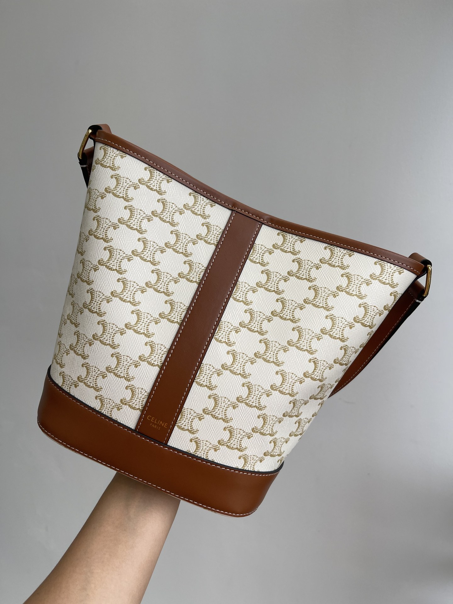 CELINE/Celine small TRIOMPHE canvas collection 19 New monogram bucket, shoulder or crossbody New monogram pattern Triumphal Arch more standing than before MORE fashionable than BEFORE, overall looks very retro SUPER GOOD to match winter with coat, Spring with trench coat, summer with skirt and so on ?? Its practicality goes without saying. The bucket bag lives up to its name and is really very spacious. The bag body is coated with canvas and comes with an adjustable leather shoulder strap. It is lined with 100% imported calfskin canvas and features a golden glossy metal snap fastener. It is both versatile and practical when opened and closed. Size: 30X22X13cm nNumber: #63947800