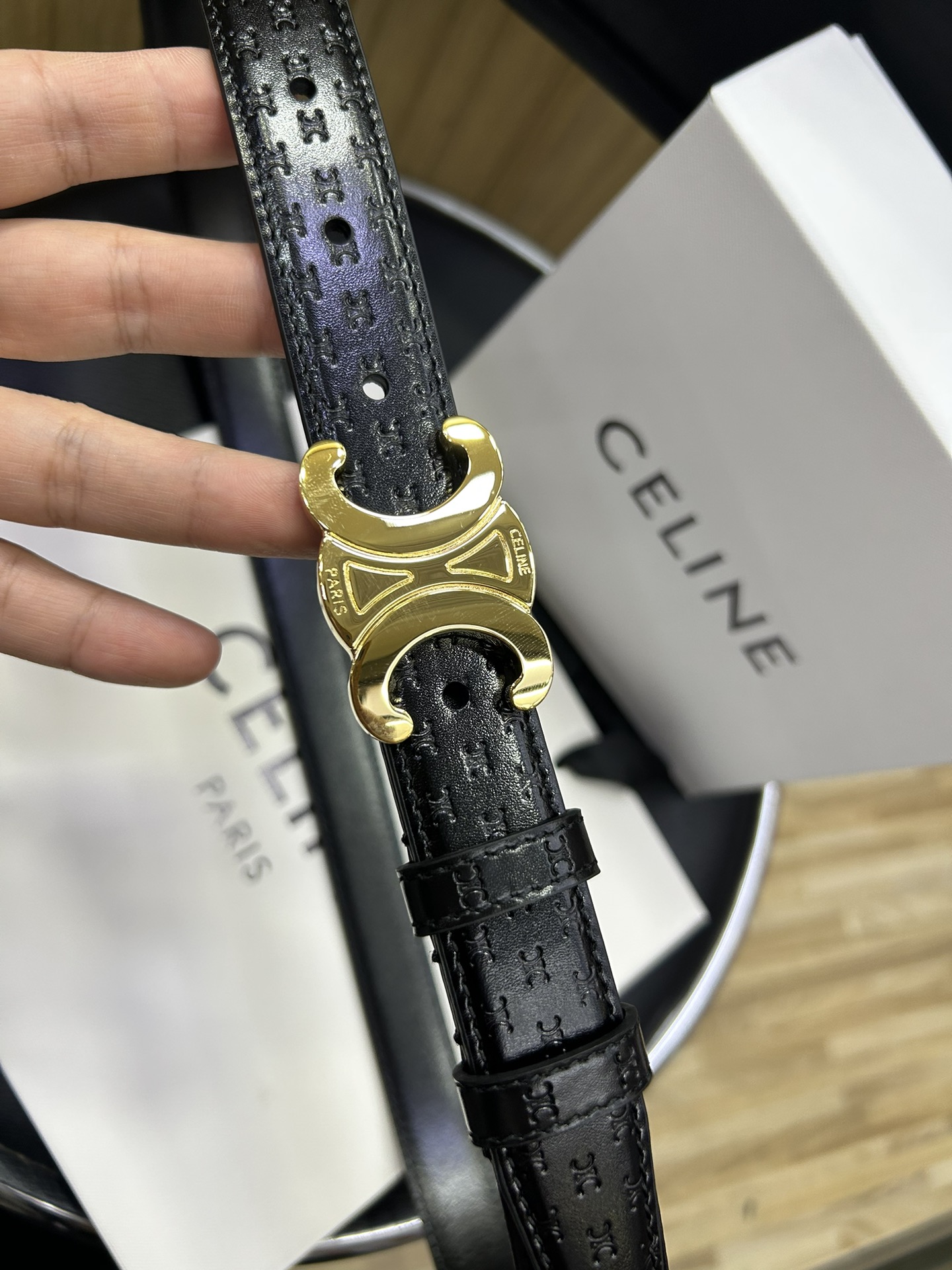 celine TRIOMPHE calfskin. Retro style pure copper gold metal parts, collar buckle buckle - belt width 2.5cm