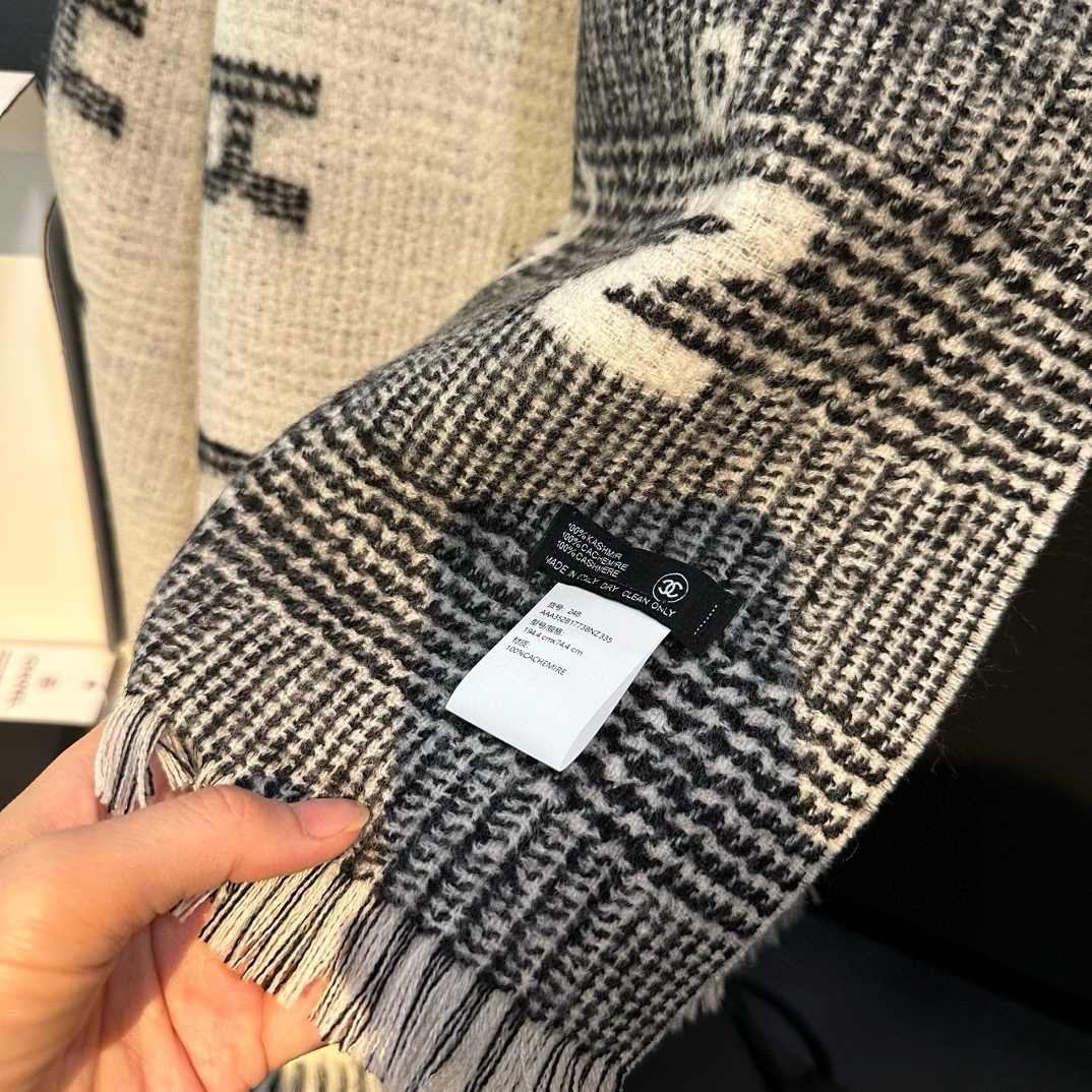 This is the latest Chanel 24cocoChanel collection from Chanel. It's the same style as Zhang Yuxi's scarf and is hailed as the most beautiful one from Chanel in 2024. It's the most worth getting. With a checkered pattern on one side and jacquard letters on the other, it serves as both a shawl and a small blanket. It looks great when worn casually. It's extremely beautiful. The coco collection has been brought to the fullest by designers, breathtakingly beautiful and timeless ? ? This Chanel style, the more I look at it, the more I love it, the more fashionable it is, the more I like it, very substantial and drape, incredibly good shape ?? Incredibly beautiful, incredibly comfortable to hold in hand ?? Purchase price 10,000 ? one piece, 100% cashmere fabric, soft and skin-friendly, size, 74.4x194.4cm with tassel length