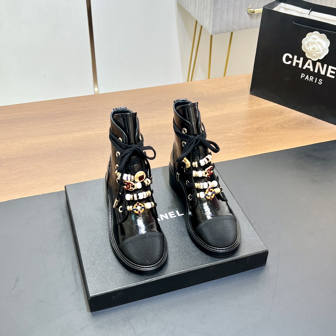 Factory PRICE ???? Women shoes factory [Top version] CHANEL CHANEL Autumn/Winter 2024 Pearl ? Metal lace-up ankle boots. Military boots, ankle boots and Dr. Martens boots ? Recognize my HOME DETAILS REAL SHOT ?? Pay attention to distinguish ORDINARY version Counter synchronization!! This series is now available for sale!! Original purchase and development! Simple small round toe design SHOE STYLE is very NICE ???? The single item that combines coolness and comfort, such as shoelaces and beaded beads, with heavy hardware embellishments, is elegant and high-end! The details and craftsmanship are all impeccable! Fabric: Original custom-made cowhide Inner lining: Silk and sheepskin for the inner lining and foot pads Code size: 35-40 (41 customized, non-refundable) Packaging: Counter original exquisite packaging ??. Chanel
