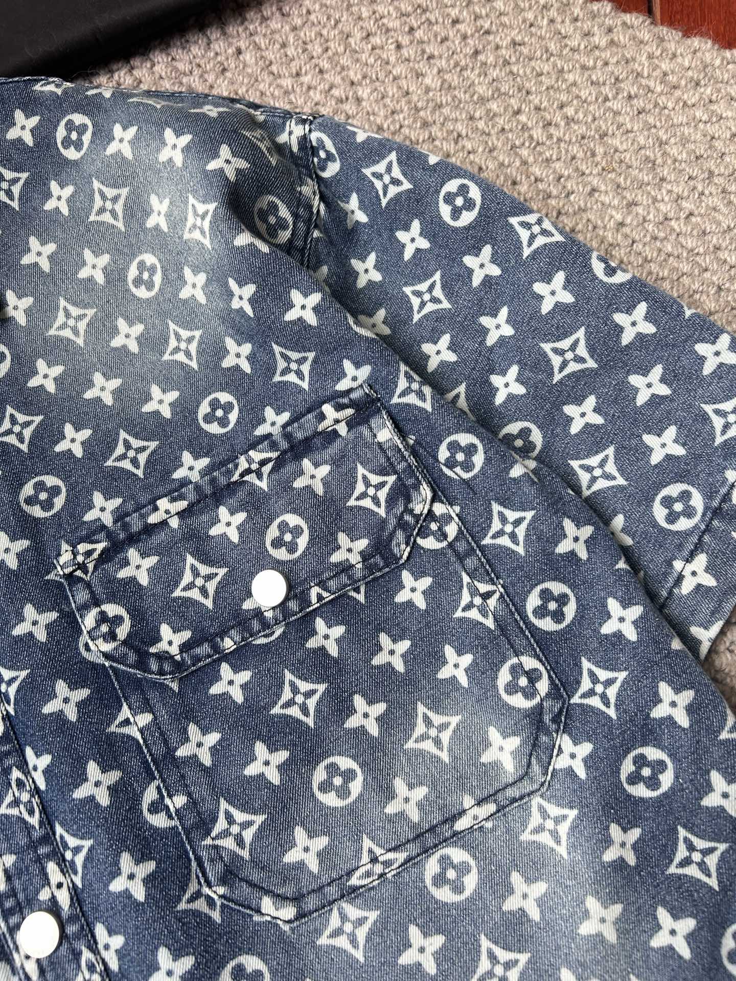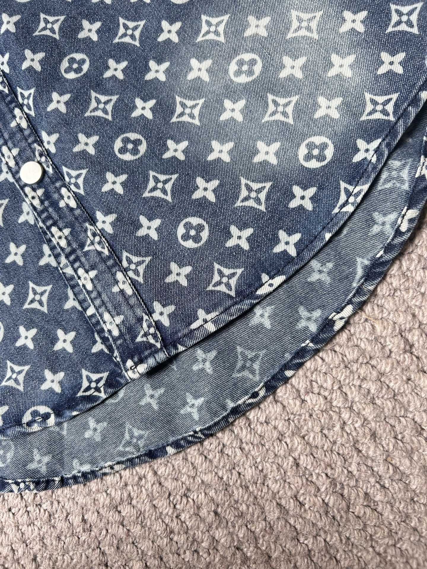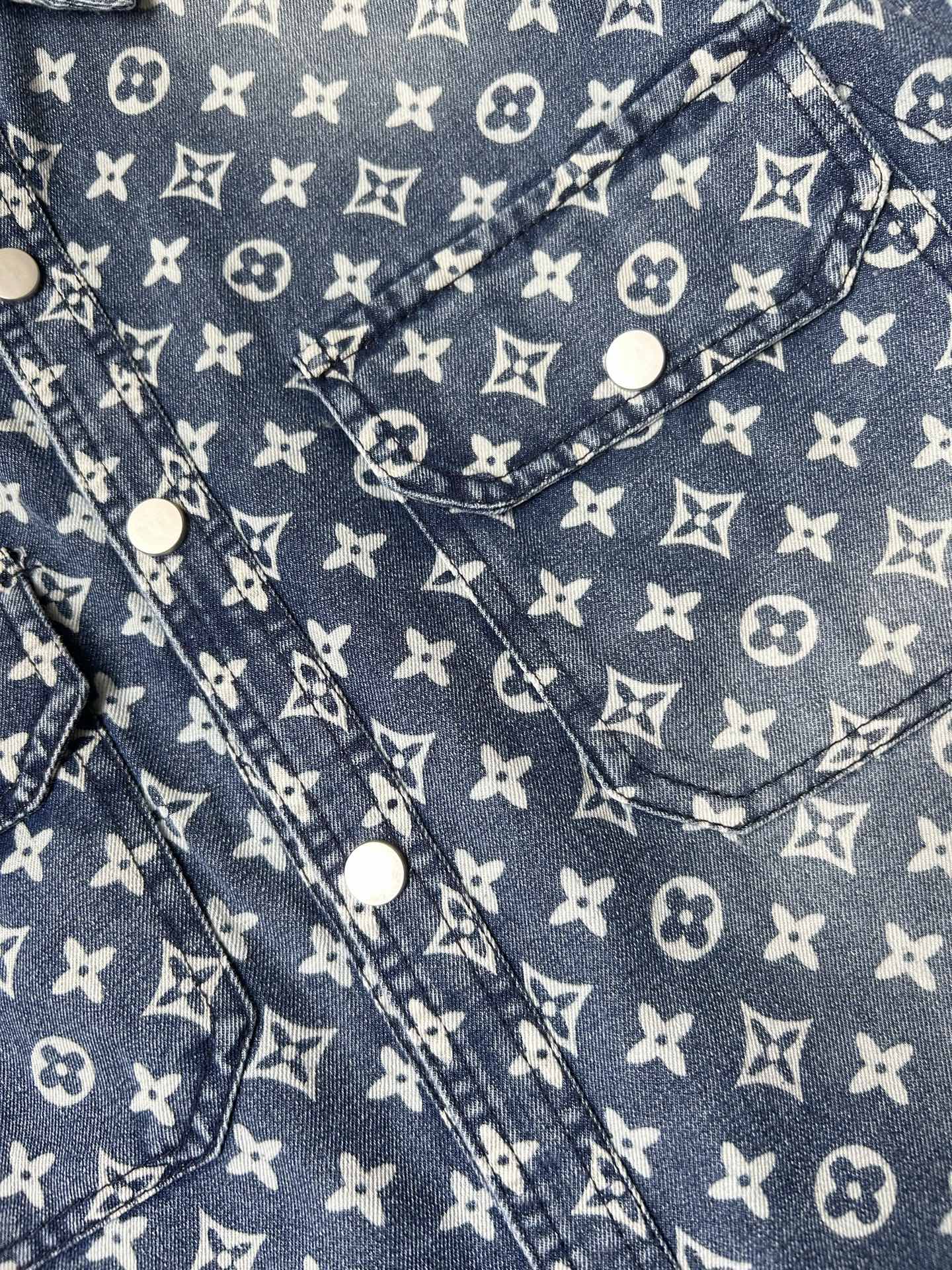 LV short-sleeved shirt denim jacket is made of imported denim fabric, featuring logo jacquard and heavy washing. It is a blouses top jacket decorated with metal buttons. It is crisp and stylish, with a unique Angle that reinterprets fashion and is a versatile choice! Size: M-3XL