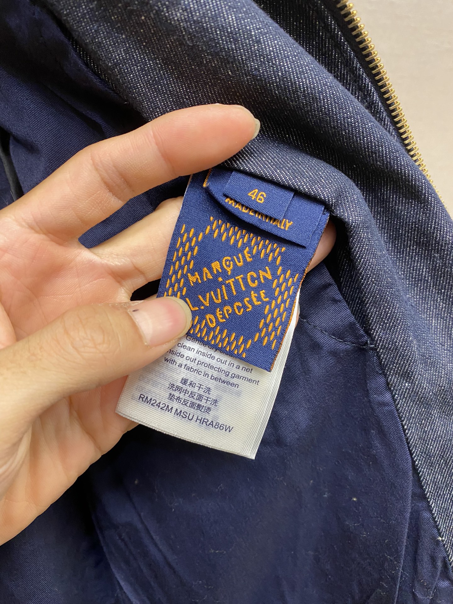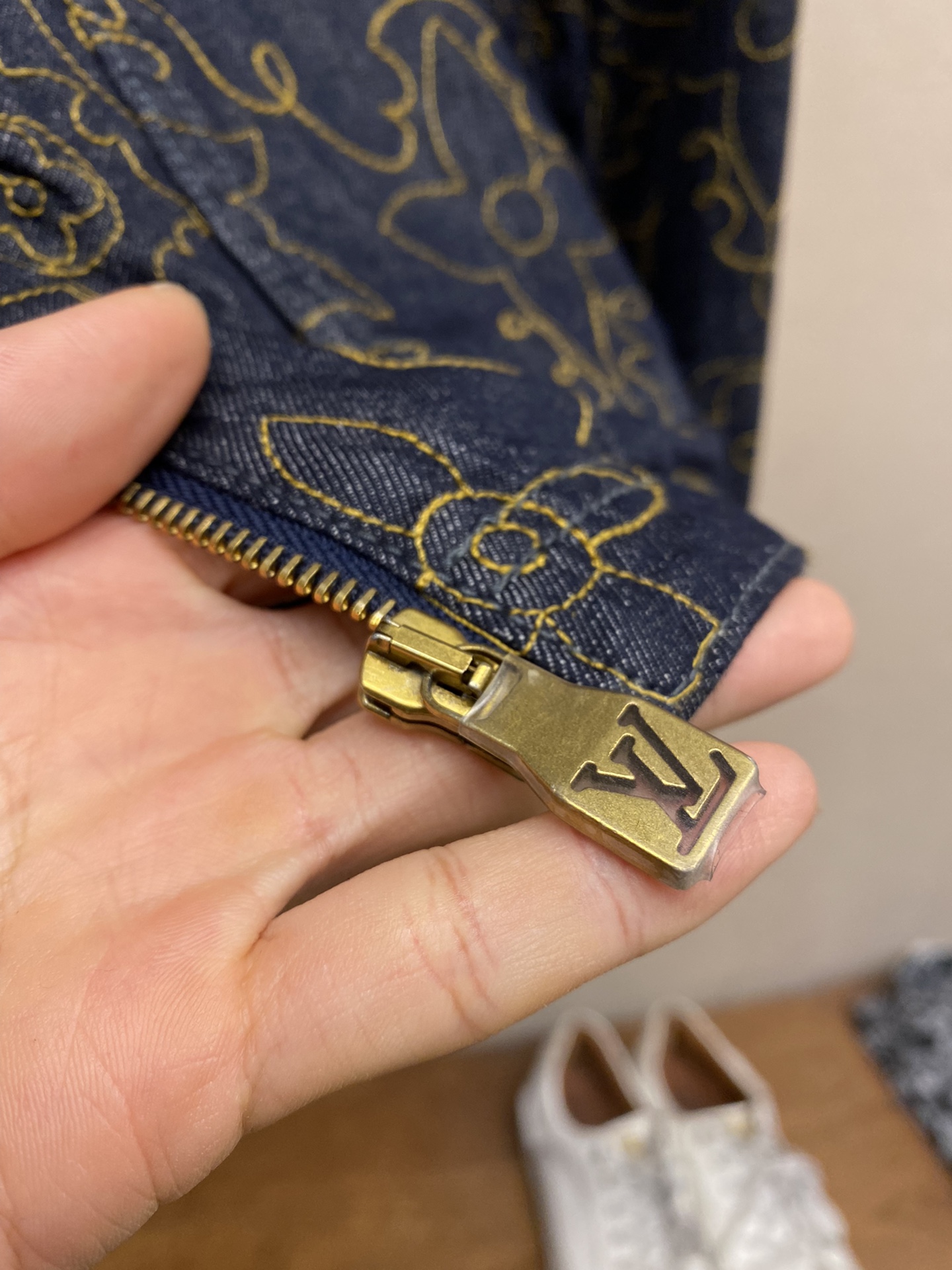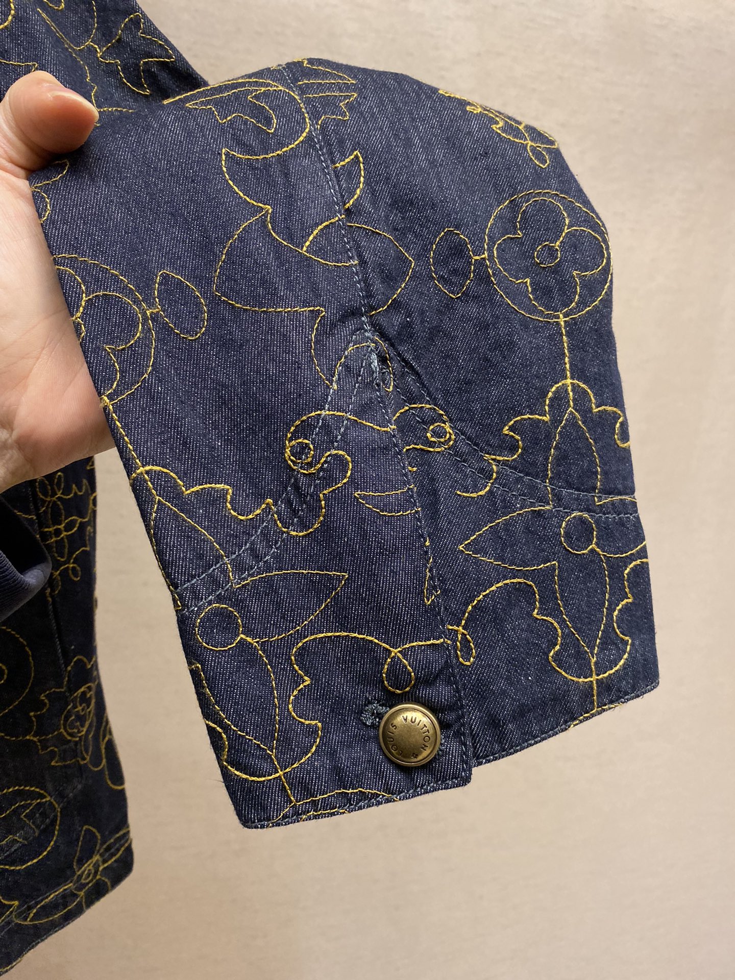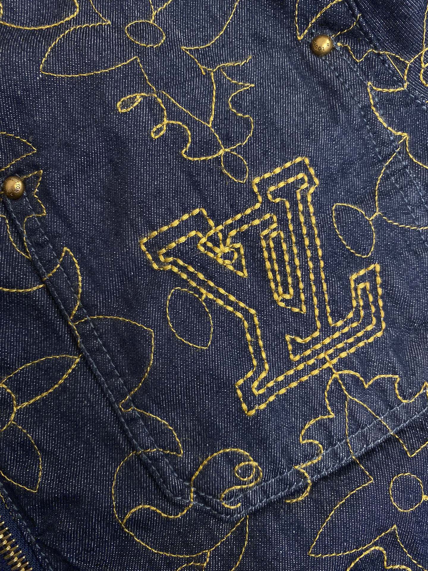 LV black and gold embroidered lapel denim jacket Process description The Monogram elements blend with the Western style The pockets and hem are embroidered with delicate patterns in contrasting color yarns The pattern sizing is precisely positioned for each cut piece. An imported extended single-arm embroidery machine is used to accurately position the flat embroidery process, ensuring that each cut piece is precisely aligned at the joint of the finished garment. The brand logo is located on the chest and back One of the Saddle embossed sticker finishing touch pockets Corduroy collar The front chest is covered with a cloth pocket The front of the zipper is equipped with an engraved zipper pull The inner lining adds comfort Unisex style Customized labels, tags and washbasin labels, high-quality products. Size: M-3XL