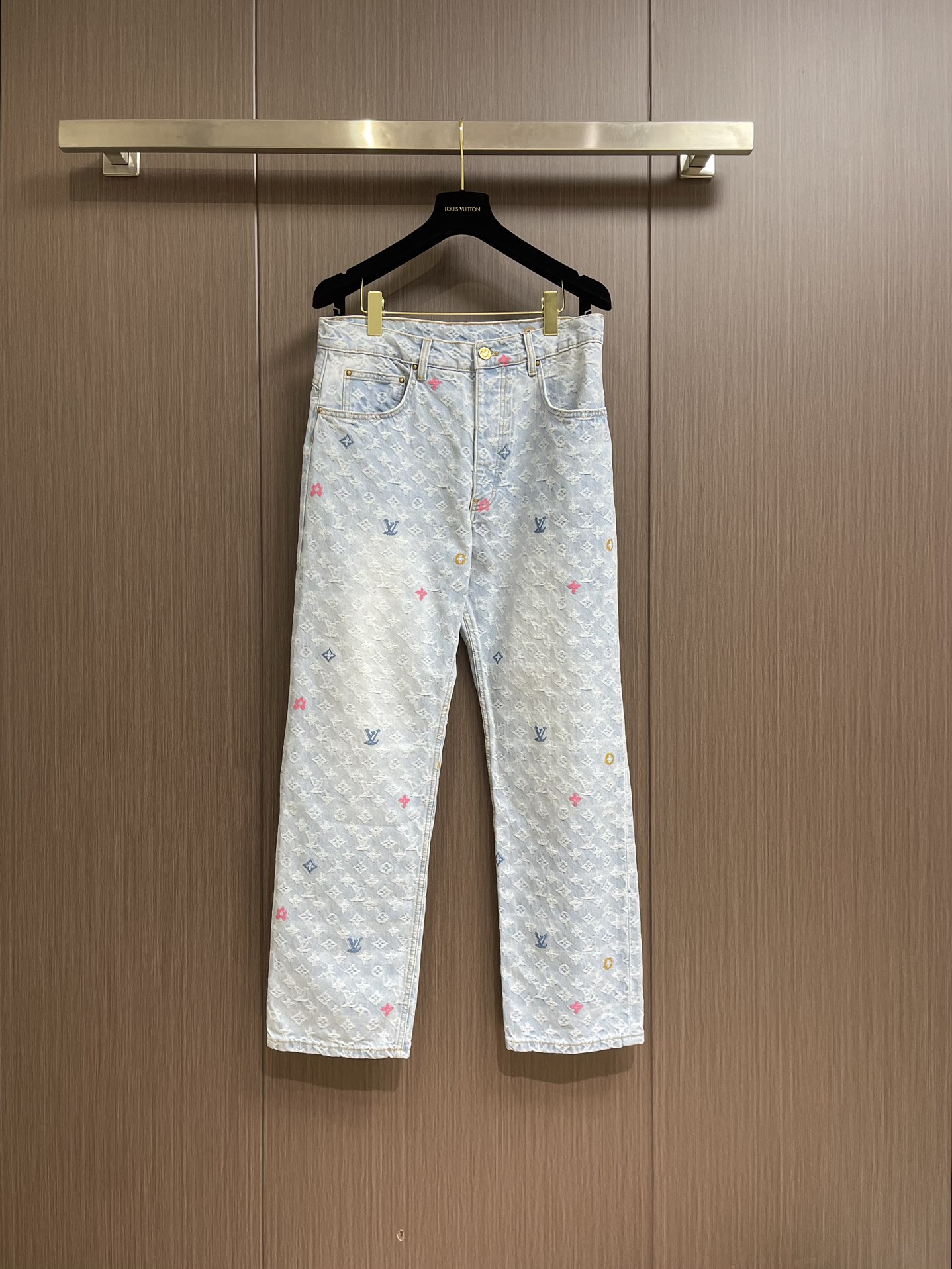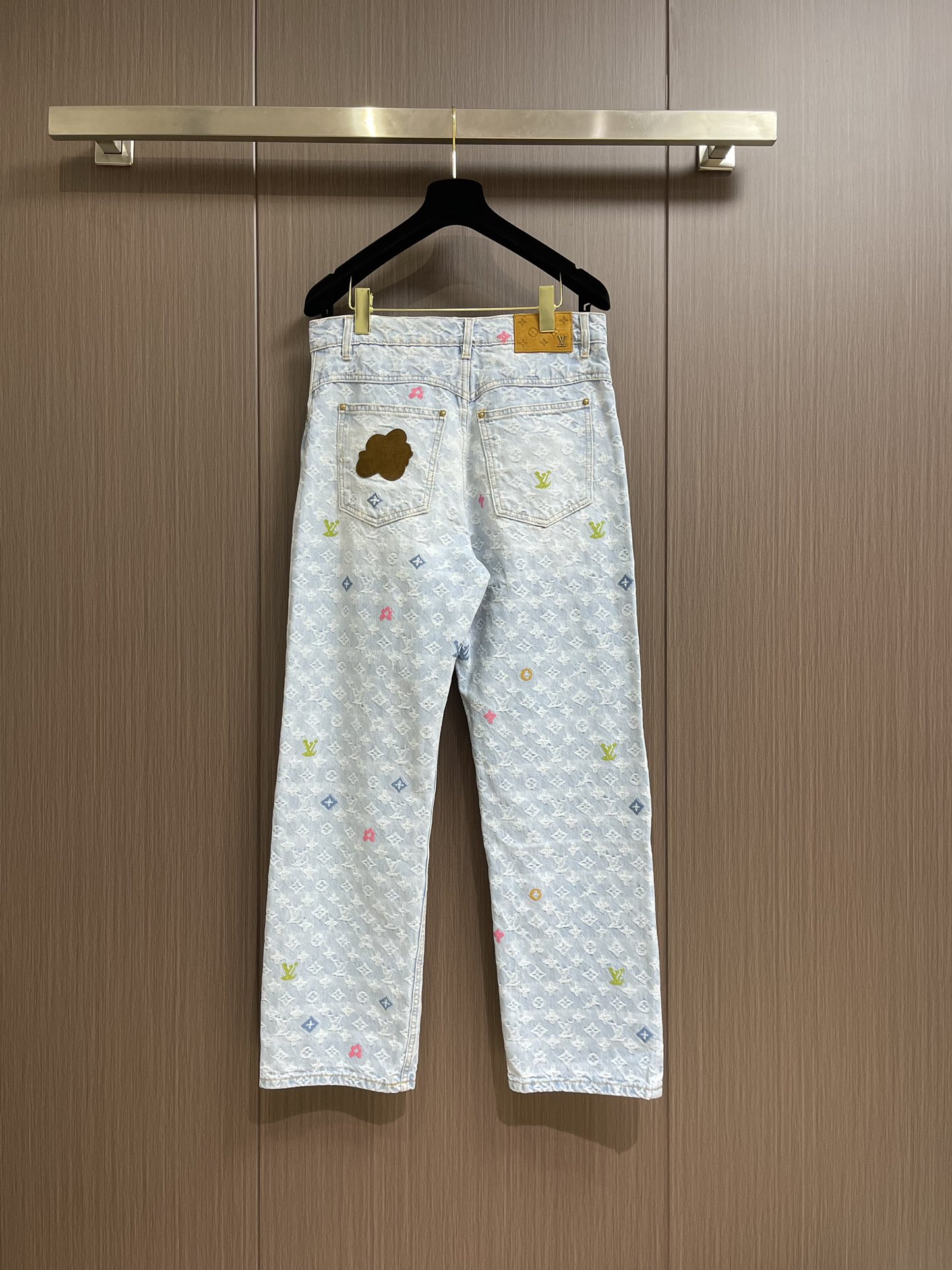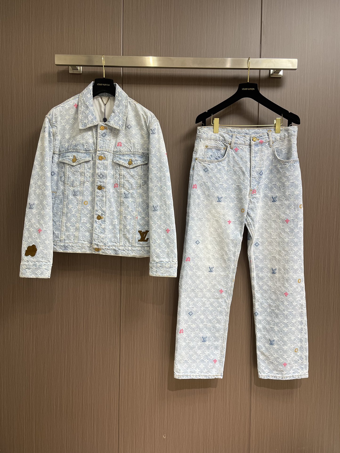Top and jeans LV 2024ss tyler Collaboration Embroidered Long-sleeved Shirt and Jeans Set, tyler collaboration series. The original version is made of twill cotton jacquard denim material. The size and spacing of the jacquard patterns are the same, and the width of the patterns is consistent, giving it a rich texture. Washed and aged in a retro light blue color, the overall decoration is decorated with old floral patterns. After weaving, it is done with positioning color embroidery (blue, pink, yellow, fluorescent green). Four colors of yarns are adjusted multiple times to achieve perfect color matching. The monogram full logo and macaron candy-colored embroidered logo are both fashionable and high-end in craftsmanship. After the finishing process is completed, it enters the washing water. Spray the horse to make the fabric naturally fade and present a whitening effect. The back waist leather plate features a color-matched iron mold pattern and is made of genuine top-grain cowhide suede. The threshold is equipped with 1 large and 4 small process buckles for opening and closing with baked paint hardware buckles. The back pocket is made of suede color-matched mold suede badges. The entire set of new auxiliary materials is customized simultaneously, with perfect detail processing. Jeans: 30-32-34-36 Denim jacket: 46-48-50-52