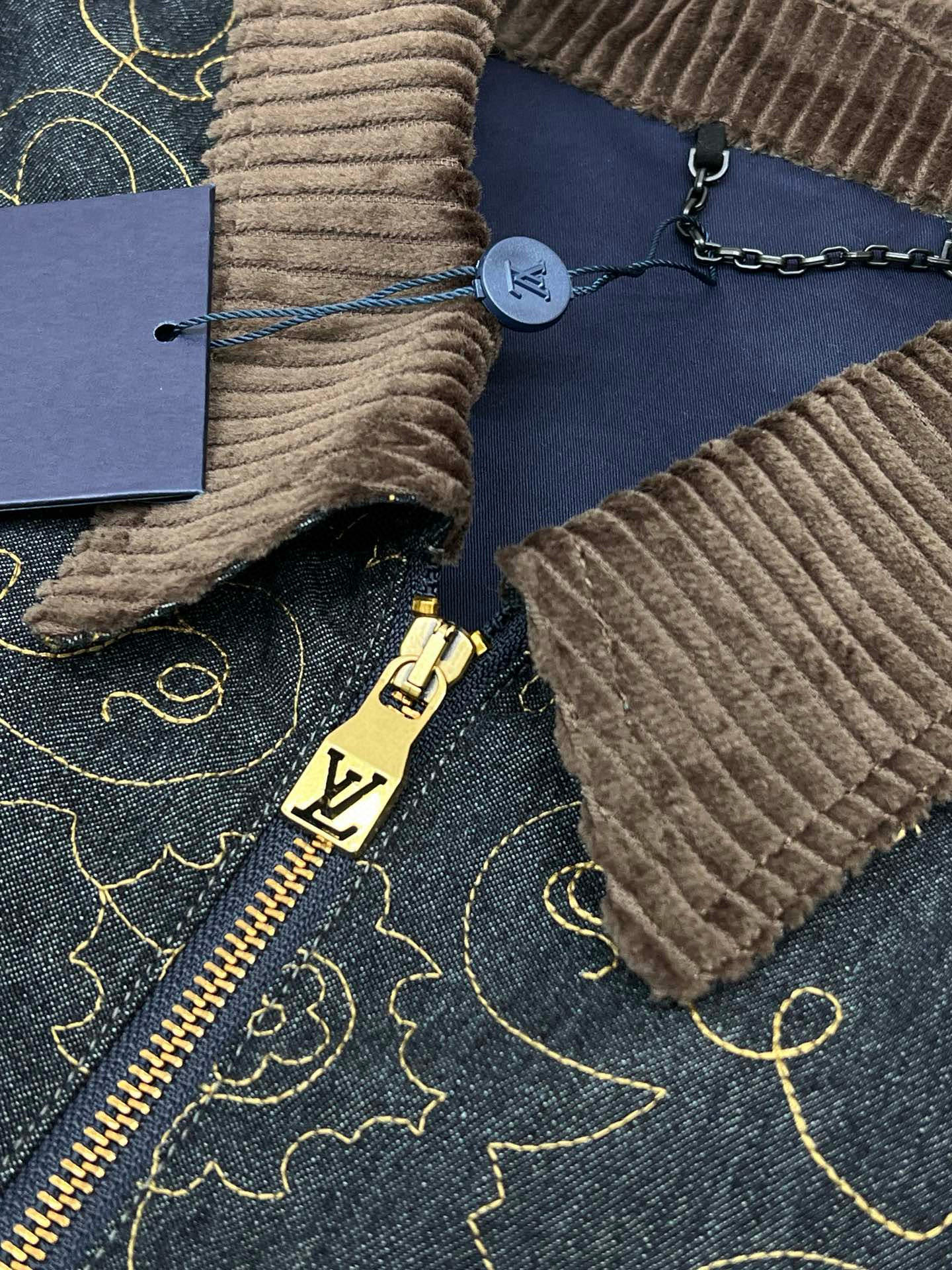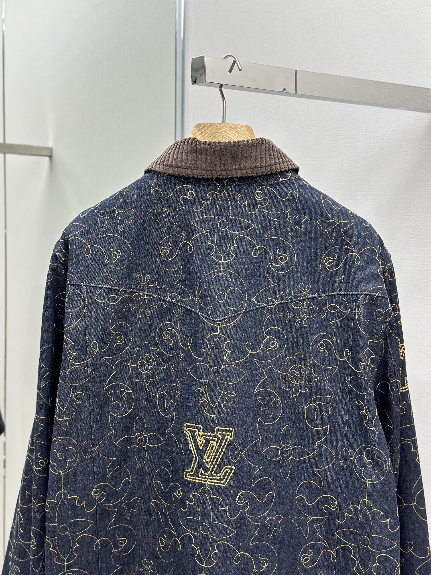 LV black and gold embroidered lapel denim jacket Process description The Monogram elements blend with the Western style The pockets and hem are embroidered with delicate patterns in contrasting color yarns The pattern sizing is precisely positioned for each cut piece. An imported extended single-arm embroidery machine is used to accurately position the flat embroidery process, ensuring that each cut piece is precisely aligned at the joint of the finished garment. The brand logo is located on the chest and back One of the Saddle embossed sticker finishing touch pockets Corduroy collar The front chest is covered with a cloth pocket The front of the zipper is equipped with an engraved zipper pull The inner lining adds comfort Unisex style Customized labels, tags and washbasin labels, high-quality products. Size: M-3XL