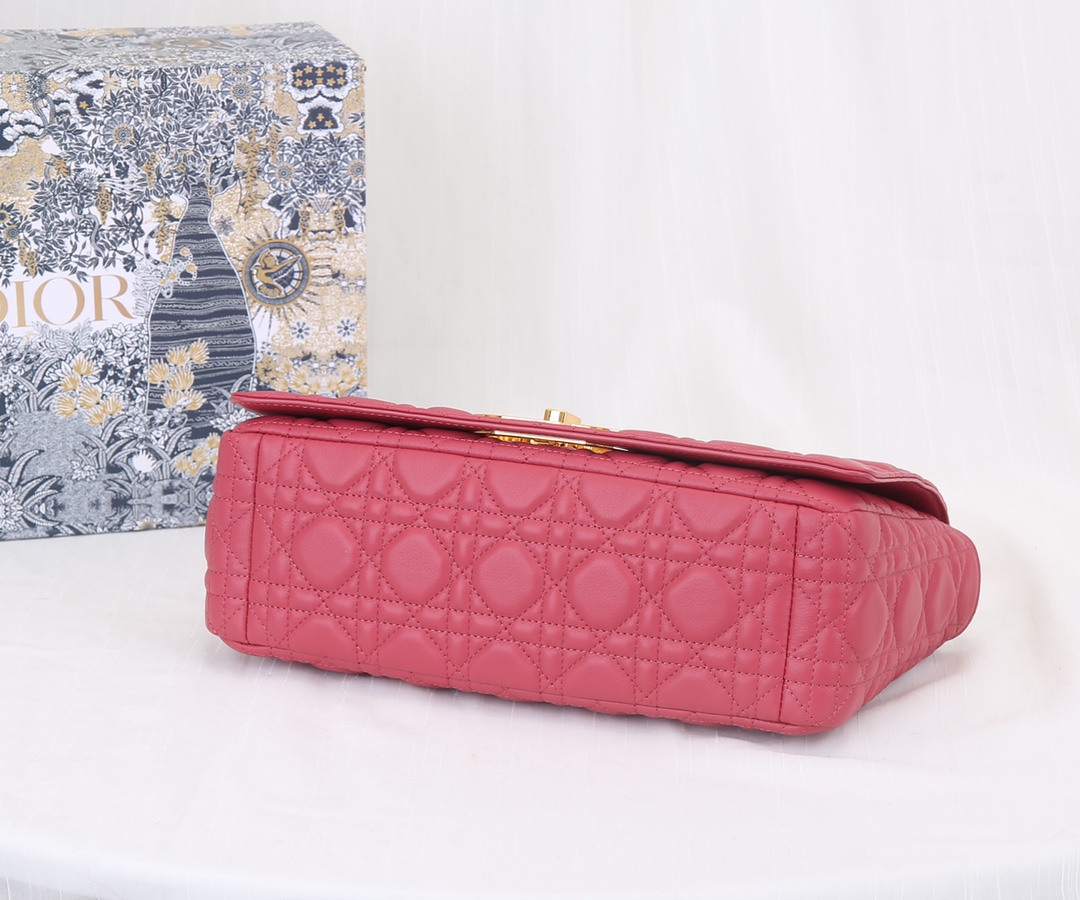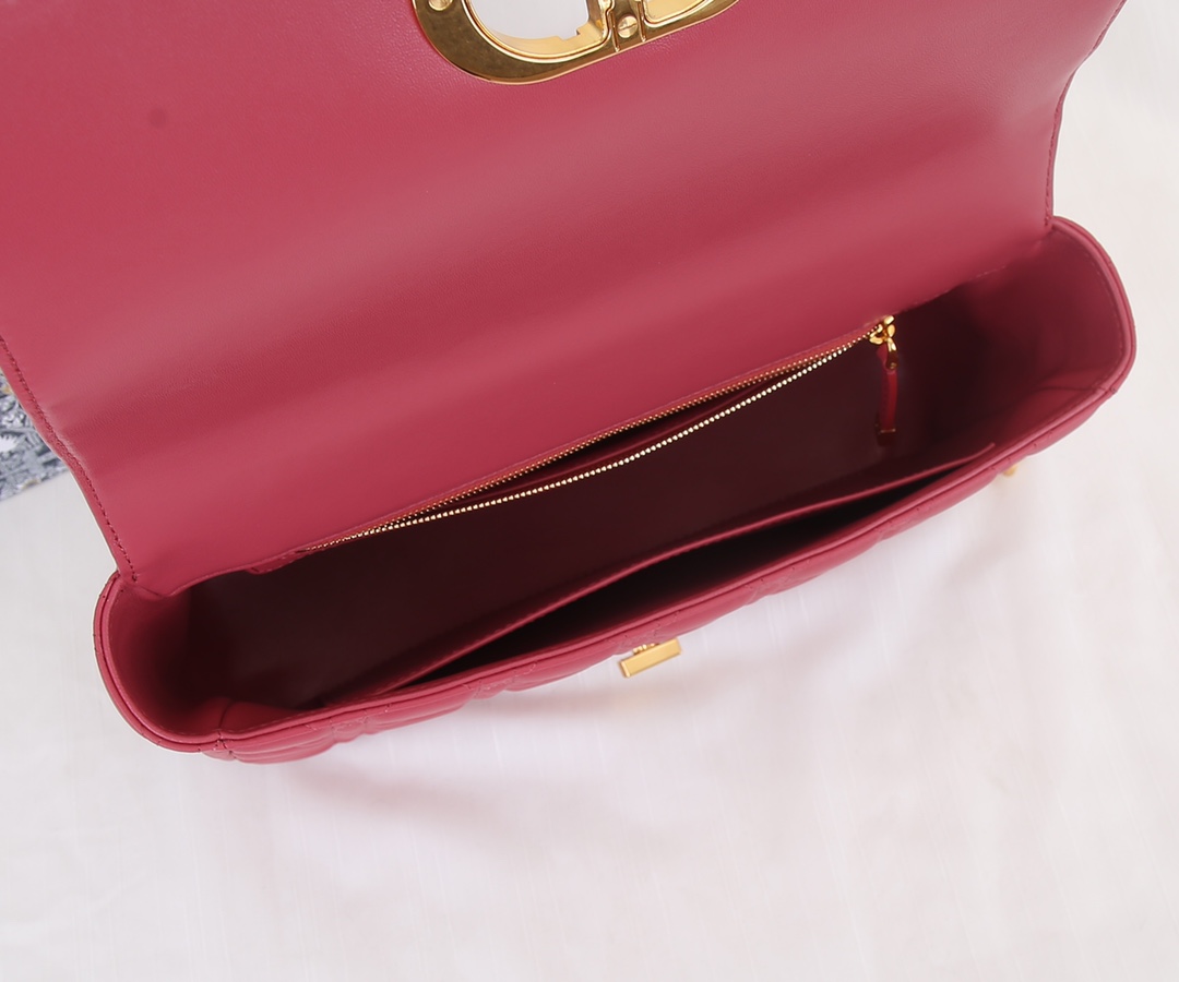 Dior has imported sheepskin inside The Dior Caro handbag is elaborately crafted from moldy red cowhide and decorated with the signature rattan checkered stitches. The material is soft. The flip cover is decorated with a retro gold finish metal "CD" clasp, inspired by the seal of Christian Dior perfume bottles. The small-sized style comes with a detachable signature "CD" chain shoulder strap, which can also be replaced with an embroidered wide shoulder strap for a more elegant and fashionable look. Whether it's a daily look or a dinner party Dimensions: 28x17x9CM
