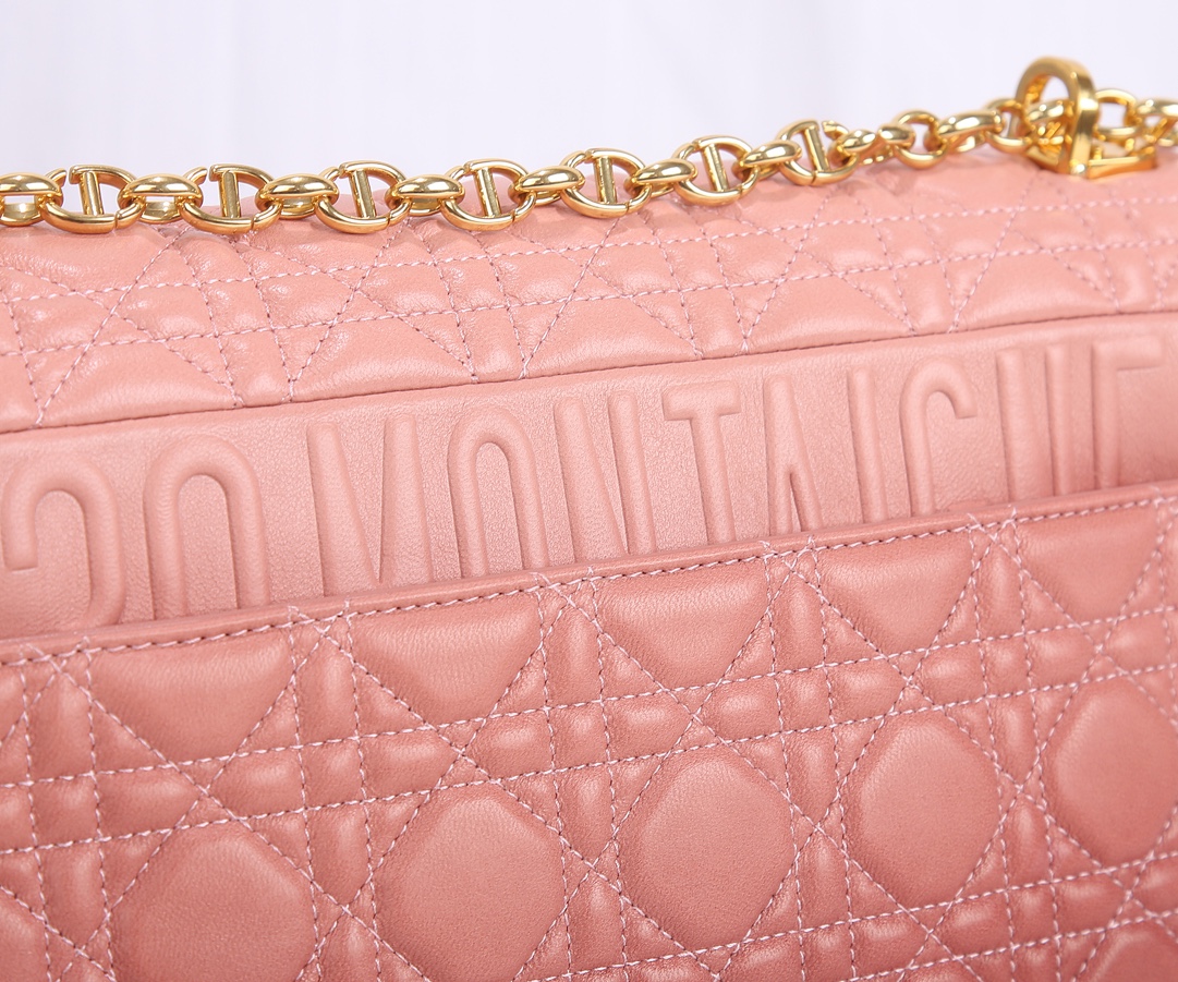 Dior large-sized inner lining imported sheepskin with gradient color The Dior Caro handbag is elaborately crafted from pink cowhide and decorated with the signature rattan checkered stitches. The material is soft. The flip cover is decorated with a retro gold finish metal "CD" clasp, inspired by the seal of Christian Dior perfume bottles. The small-sized style comes with a detachable signature "CD" chain shoulder strap, which can also be replaced with an embroidered wide shoulder strap for a more elegant and fashionable look. Whether it's a daily look or a dinner party Dimensions: 28x17x9CM