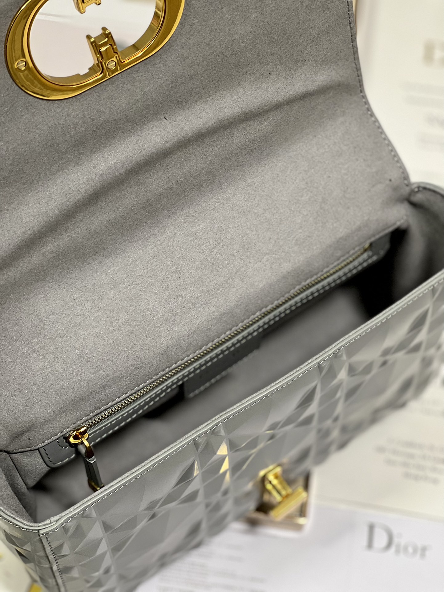 Dior top imported original factory leather Montaigne chain bag Caro handbag medium size ?? "grey pressed diamond gold buckle" The outer shell is made of cowhide with diamond texture and paired with a velvet lining The flip cover is decorated with a golden metal 'CD' clasp The detachable bracelet and shoulder strap can be used to replace the embroidered wide shoulder strap Model :1200 Medium # Size :25cm