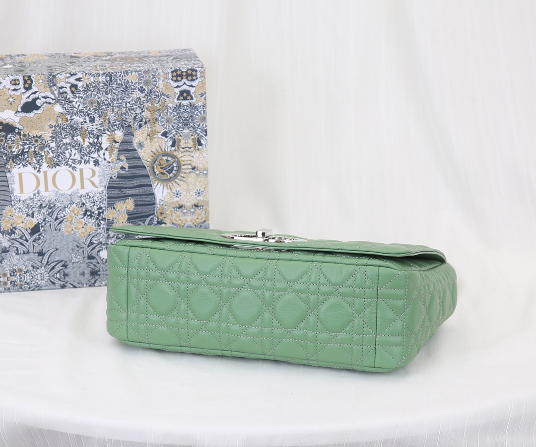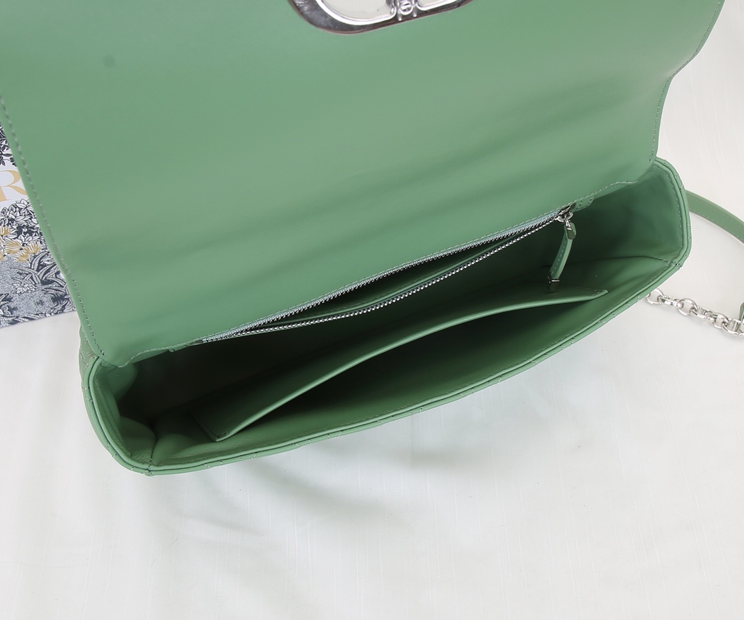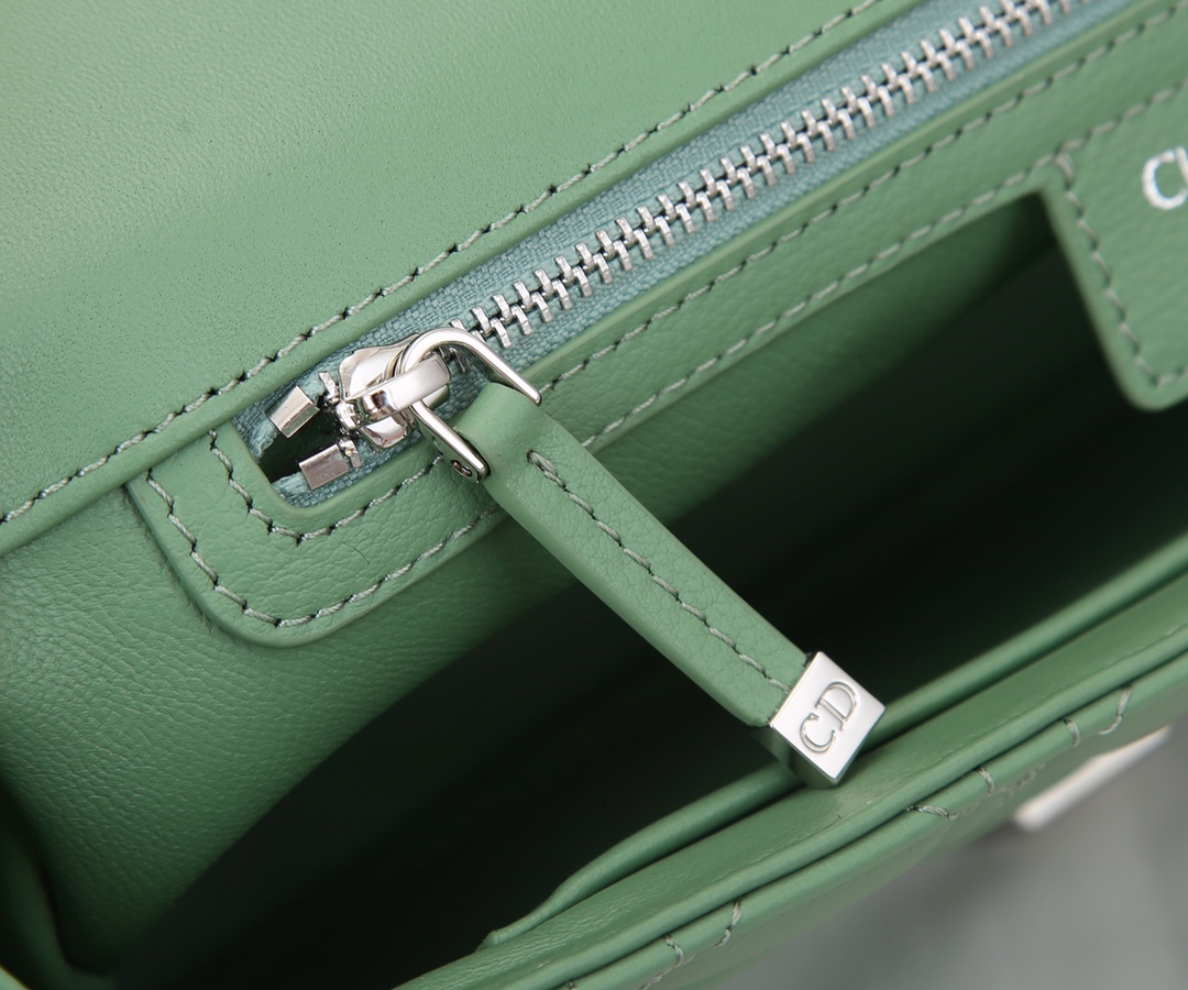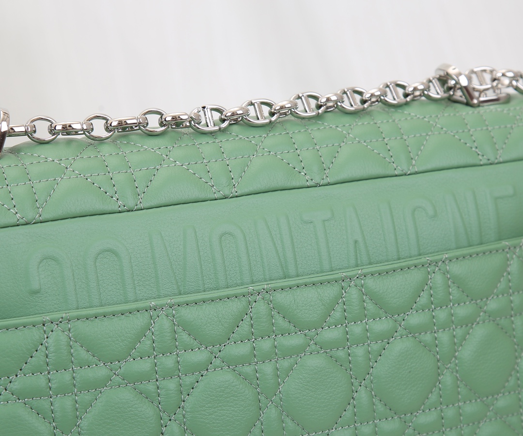 Dior's large inner lining is made of imported sheepskin The Dior Caro handbag is elaborately crafted from green silver-buttoned cowhide and decorated with the signature rattan checkered stitches. The material is soft. The flip cover is decorated with a retro gold finish metal "CD" clasp, inspired by the seal of Christian Dior perfume bottles. The small-sized style comes with a detachable signature "CD" chain shoulder strap, which can also be replaced with an embroidered wide shoulder strap for a more elegant and fashionable look. Whether it's a daily look or a dinner party Dimensions: 28x17x9CM
