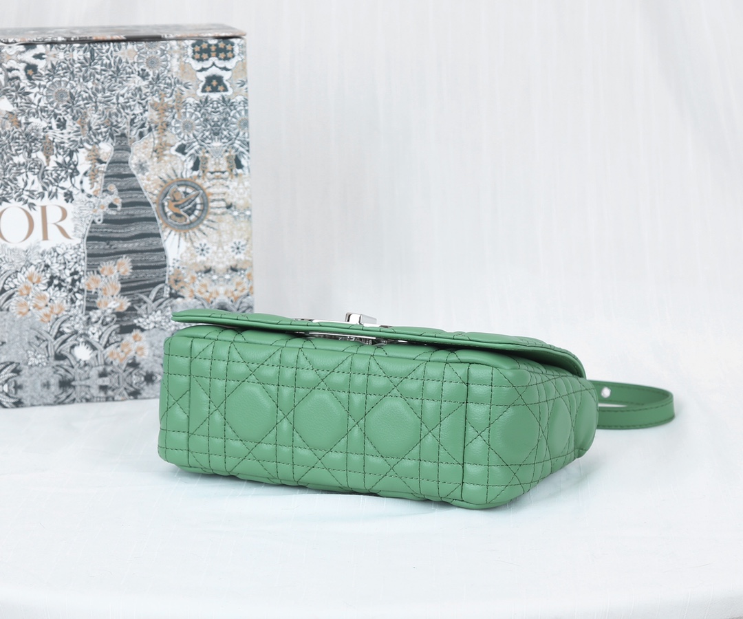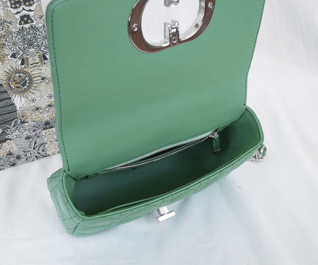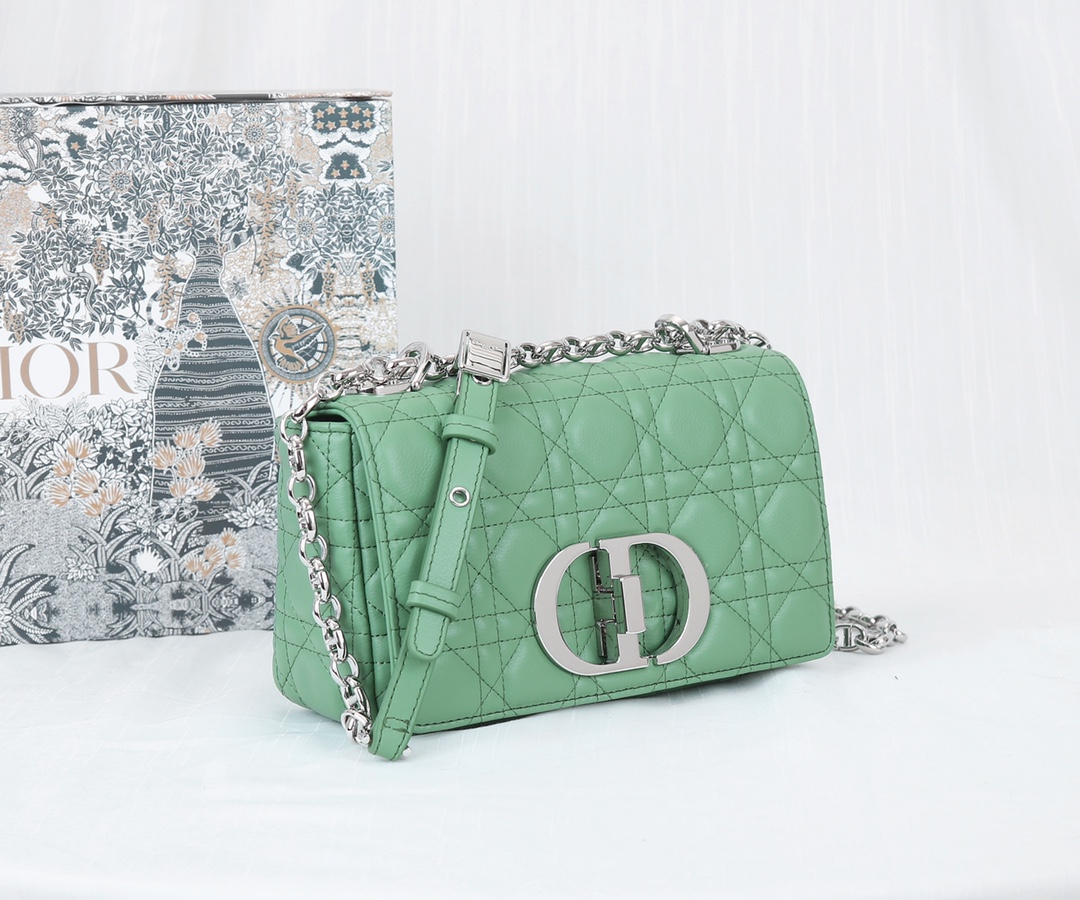 The inner lining of the Dior trumpet is made of imported sheepskin The Dior Caro handbag is elaborately crafted from green cowhide and decorated with the signature rattan checkered stitches. The material is soft. The flip cover is decorated with a retro gold finish metal "CD" clasp, inspired by the seal of Christian Dior perfume bottles. The small-sized style comes with a detachable signature "CD" chain shoulder strap, which can also be replaced with an embroidered wide shoulder strap for a more elegant and fashionable look. Whether it's a daily look or a dinner party Dimensions: 20x12x7CM