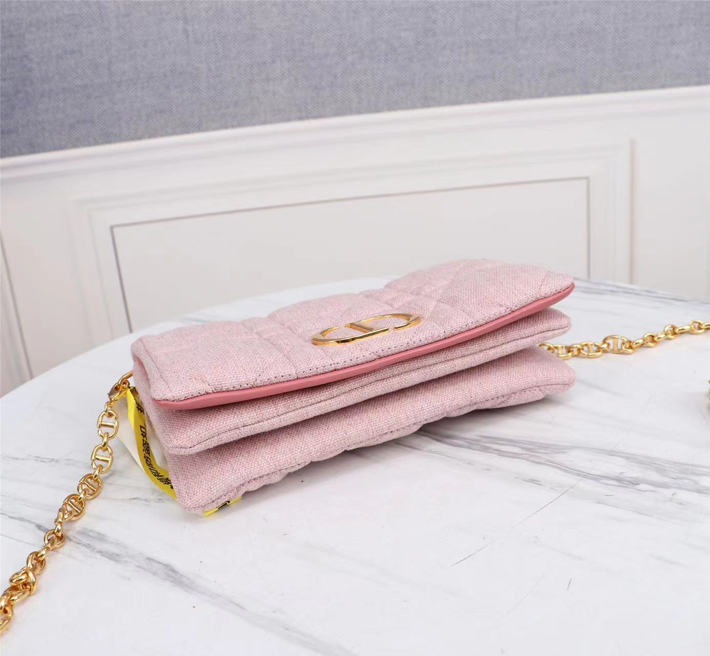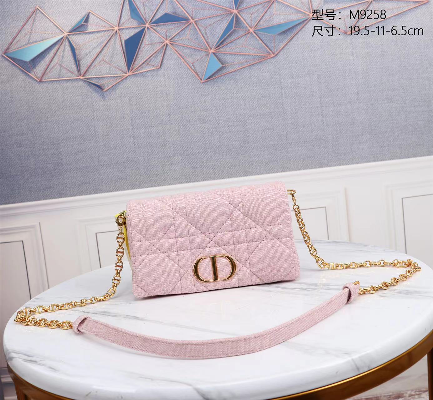 Dior top imported original factory sheepskin three-layer DIOR CARO chain handbag 9258 Plant-based linen fabric + pink cowhide quilted large rattan check pattern The new Dior Caro chain handbag of this season showcases the spirit of Dior Haute couture with its practical design. Crafted from pink cowhide, it is decorated with a unique quilted effect and a large rattan check pattern. The flip cover is decorated with a metal cladding metal "CD" logo, and the inner compartments can store various daily necessities. The detachable leather and "CD" chain shoulder strap can be wound around the flip cover, making it convenient to carry by hand, shoulder or crossbody. It is an ideal daily item. The front is decorated with the "CD" logo Flip cover opening and closing Two compartments One zipper pocket Three card slots One arc-shaped sticker bag on the rear side Detachable chain and leather shoulder strap Dimensions: 19.5 x 11 x 6.5 cm It can store various models of iphones
