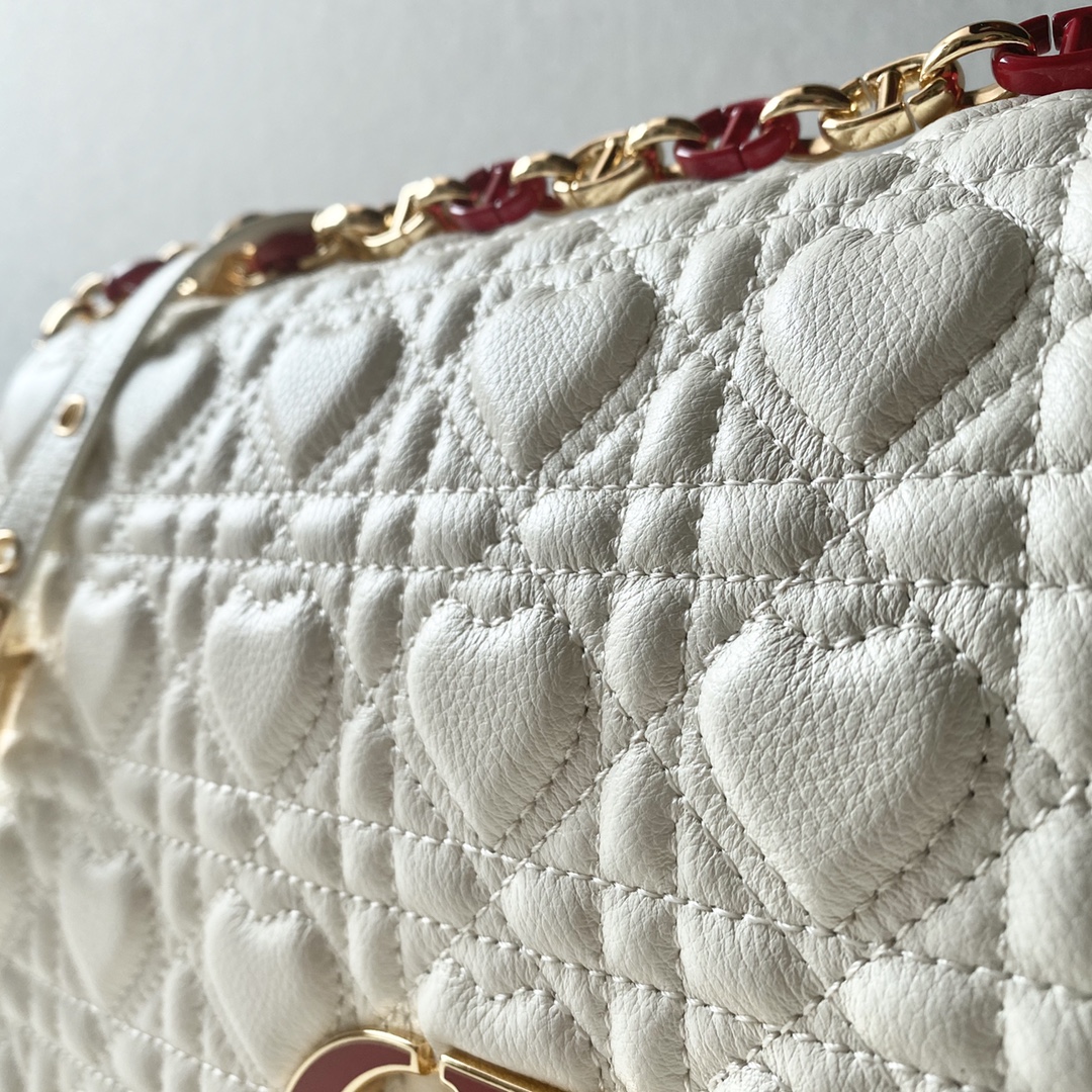 Dior imported sheepskin original cowhide Caro DIOR AMour limited Edition collection ?? Crafted from cowhide with meticulous care, it features heart-shaped pattern rattan checkered stitching, combining elegance with modern style. The flip cover is decorated with an enamel rotary "CD" clasp, and is paired with a detachable "CD" logo chain shoulder strap as the finishing touch. It can be carried by hand, over the shoulder or crossbody, and can also be replaced with an embroidered wide shoulder strap for a bright and eye-catching appearance. It can be matched with daily looks or evening wear. Model Number 2023 (The picture is in large size) Large size: 28x17x9cm Medium size: 25.5x15.5x8cm Small size: 20x12x7cm