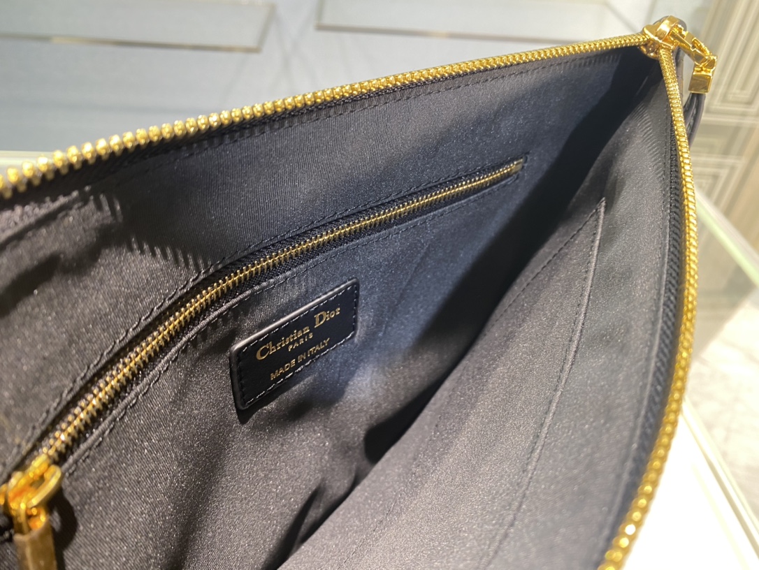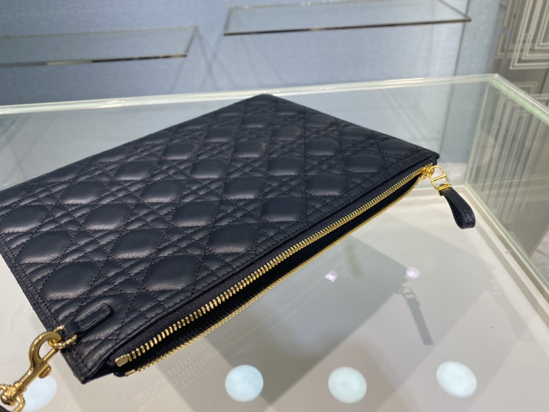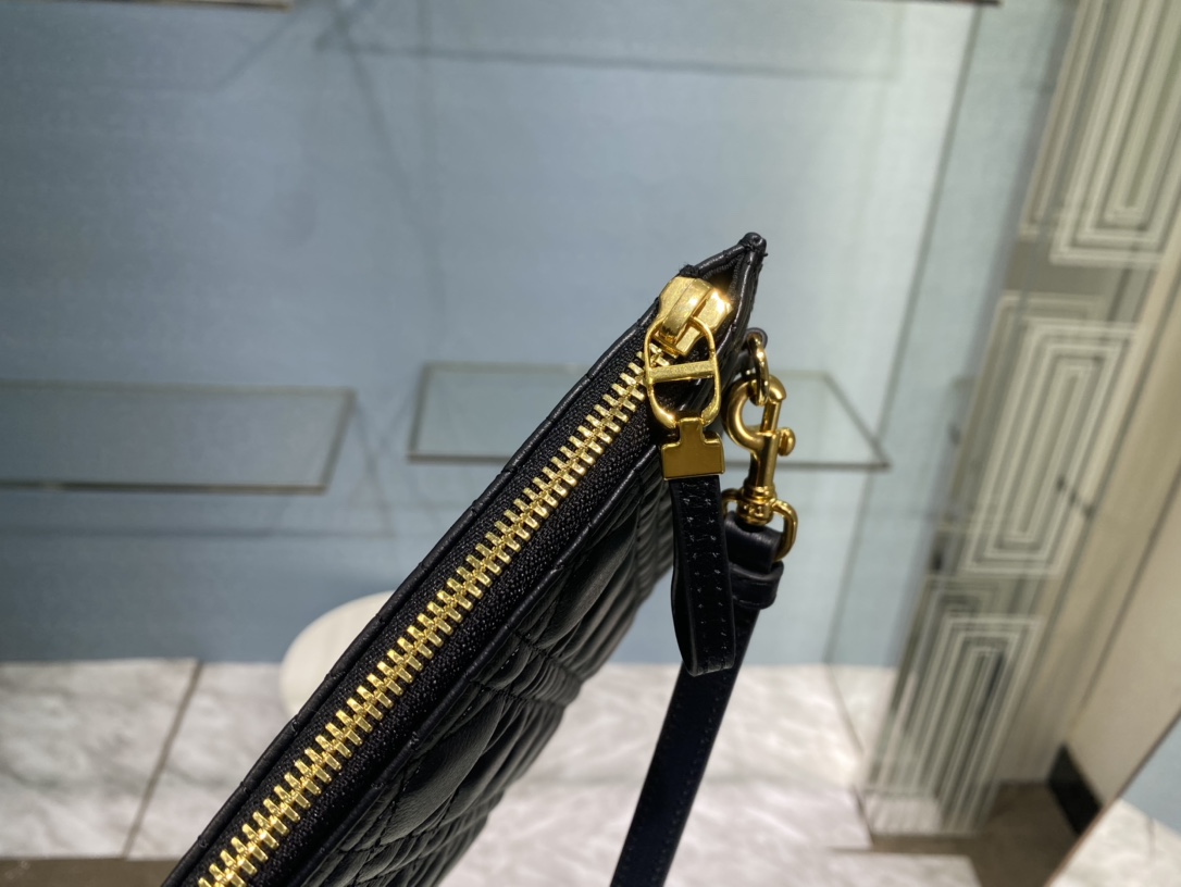 The Dior Caro everyday clutch is an elegant and practical item. Crafted from black soft cowhide, it is adorned with the signature rattan checkered stitching and the "CD" logo on the front. The large size style can store various daily necessities. It comes with a detachable hand strap and can be held by hand or put in a pocket. The front is decorated with the "CD" logo One large zipper compartment One internal sticker bag One detachable hand strap Made in Italy. Size: 30 centimeters