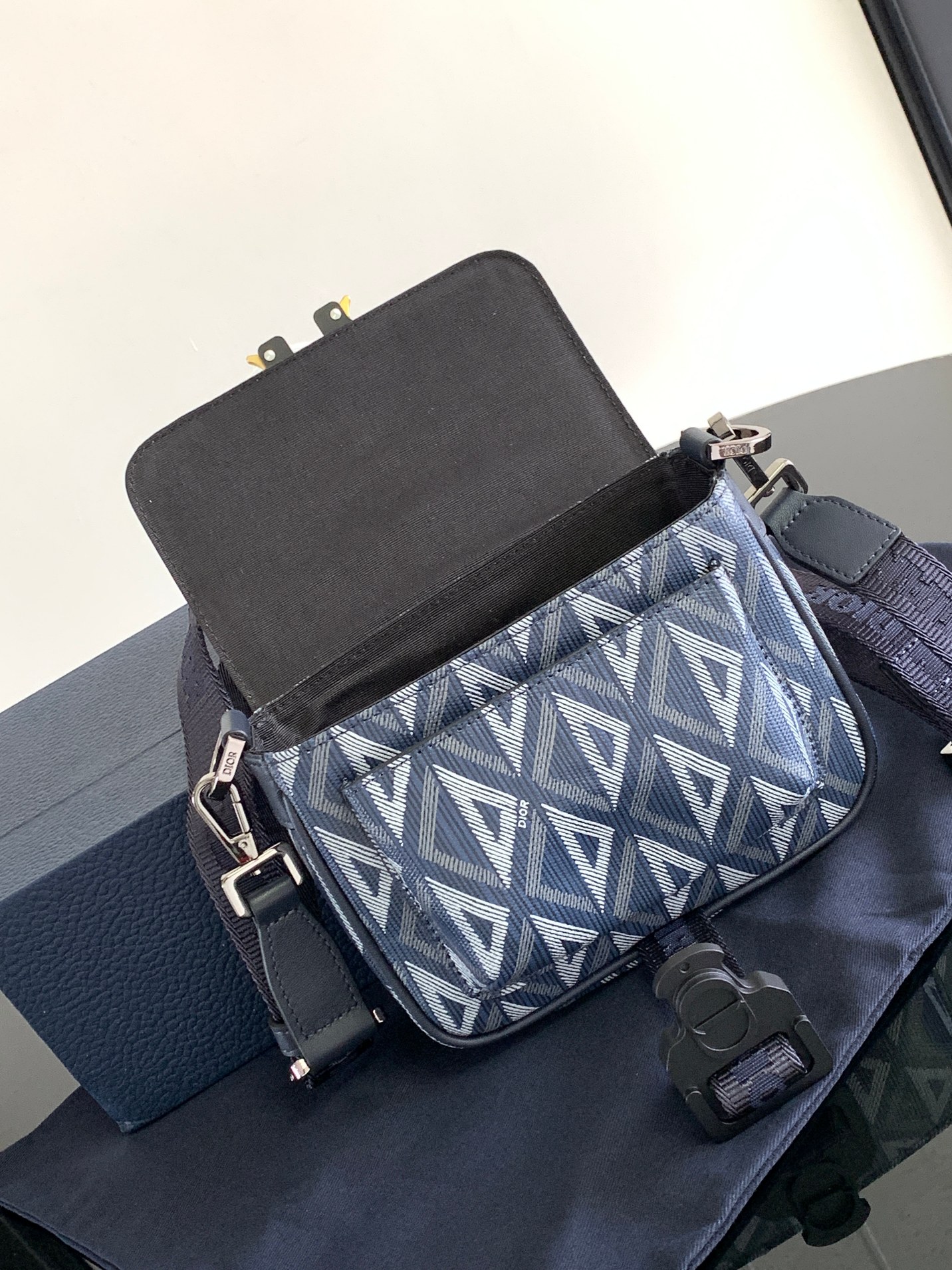 This Dior Hit the Road handbag integrates modern style with Dior's haute couture spirit. Crafted with navy blue CD Diamond pattern canvas, drawing inspiration from Dior archives, and decorated with smooth cowhide details of the same tone. The flip cover is paired with an aluminum clasp decorated with the Christian Dior logo and the initials of CD, which can easily store the mobile phone. There is a sticker bag on the front. Mini style, practical and easy to match. Paired with detachable and adjustable shoulder straps, it can add the finishing touch to all kinds of casual outfits. Navy blue CD Diamond pattern canvas. The CD Diamond pattern designed by Marc Bohan in 1974 reinterprets the initials of CD in a three-dimensional diamond-shaped pattern and is presented on cotton canvas fabric Navy blue smooth cowhide leather, with the Dior logo decorated on the inside The flip cover opens and closes, paired with an aluminum clasp decorated with the Christian Dior logo and the initials of CD Adjustable and detachable Christian Dior nylon jacquard shoulder strap Front flip pocket Rear side sticker bag Contains a dust-proof bag