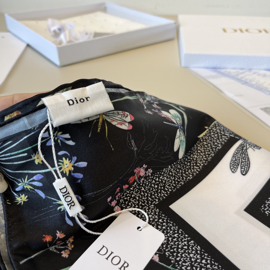 The new Dior silk handkerchief floral collection is brimming with vitality This handkerchief is decorated with Dior Herbarium pattern prints, paying tribute to Mr. Dior's love for plants. Drawing inspiration from the Dior archive, it showcases vivid and beautiful designs of wild plants and flowers, embellished with details of dragonflies and bees to enhance the style. It couldn't be more beautiful when made into a wall painting and paired with soft furnishings The interplay of reality and illusion, layer upon layer of natural elements, integrates these elements in a stacked manner, creating a simple line design sense. It not only fully echoes the silk scarf, but also showcases the exquisite details and noble texture of the silk scarf. Material :100% silk, size 90*90cm