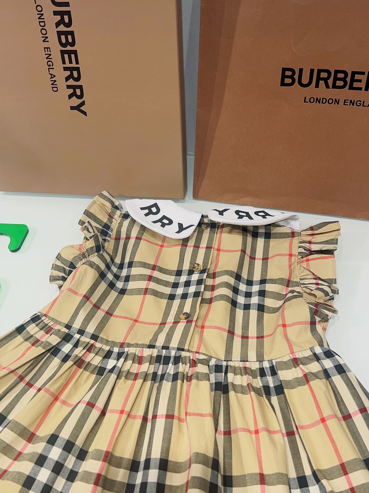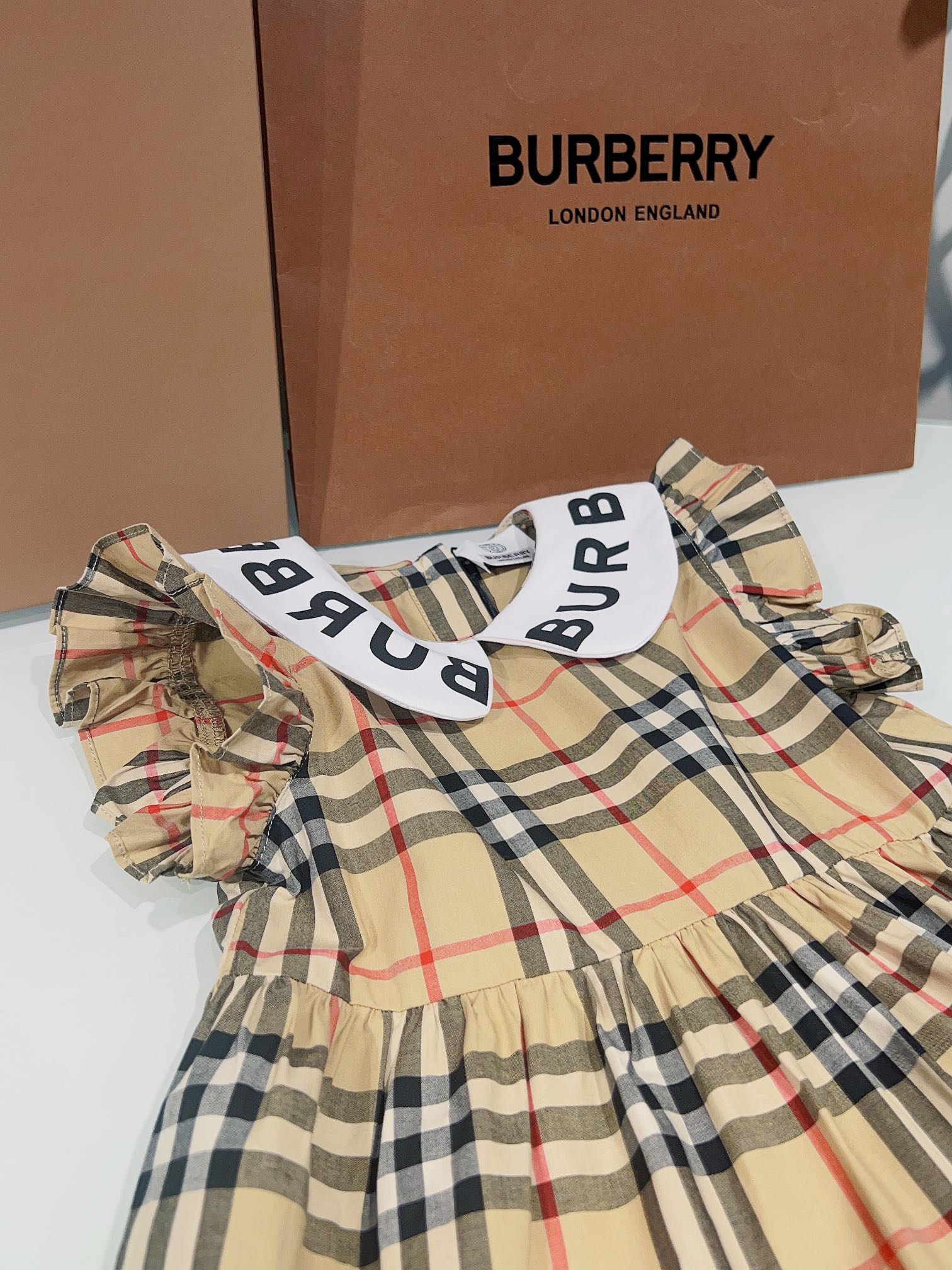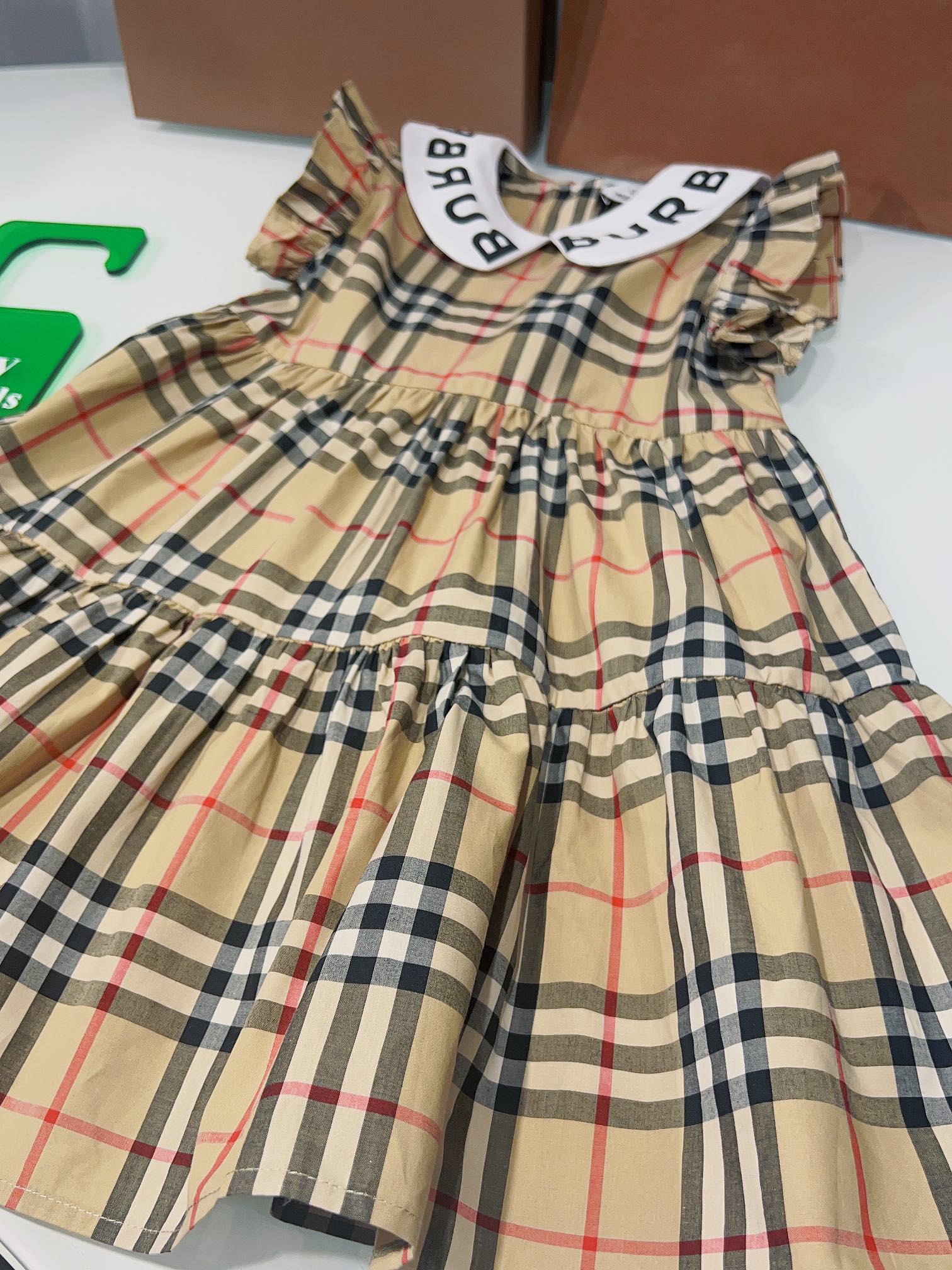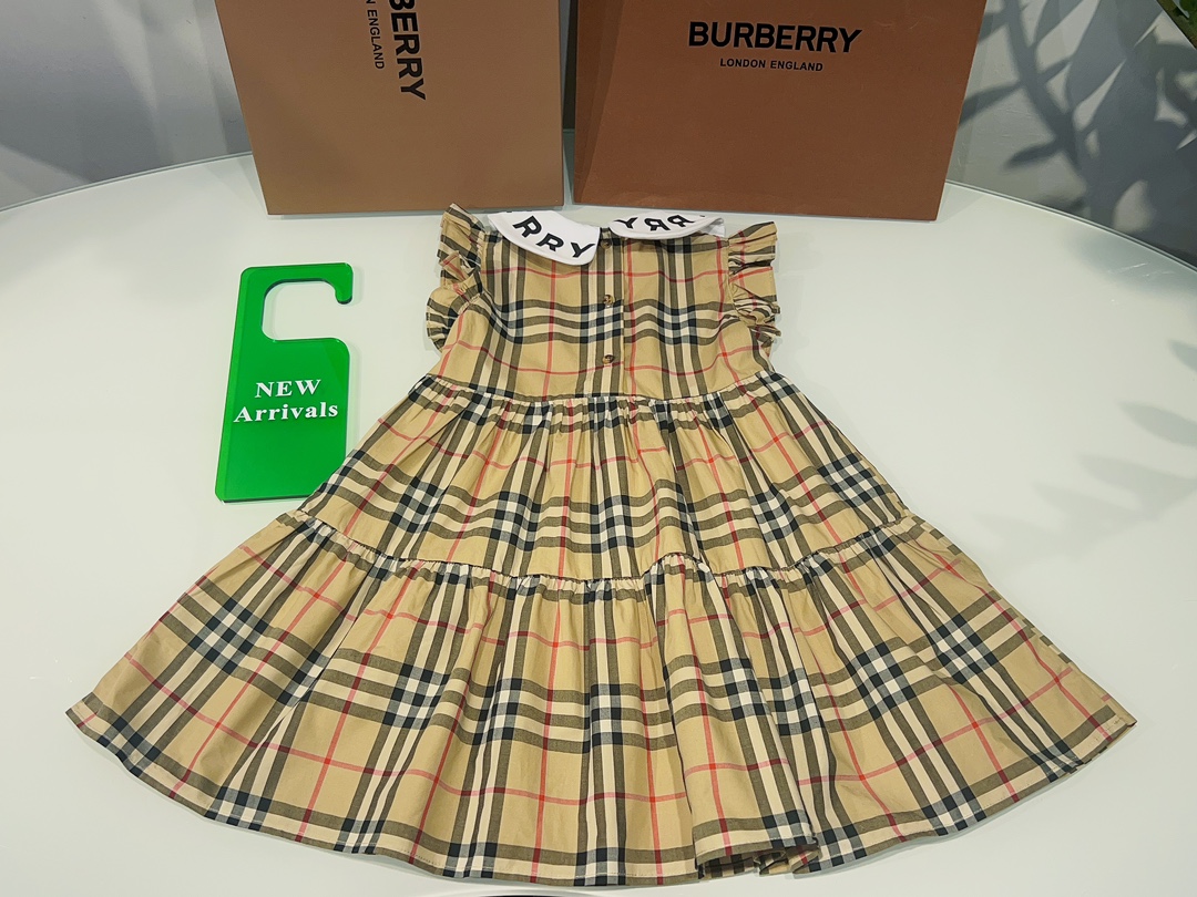 Burberry, Burberry, high-end children's clothes, girls dress, custom coupled to 80 plaid fabrics, spelling a white brand logo printed letters, flouncy sleeves design, to the article, the spot, code number: 100/110/120/130/140/150/160 cm