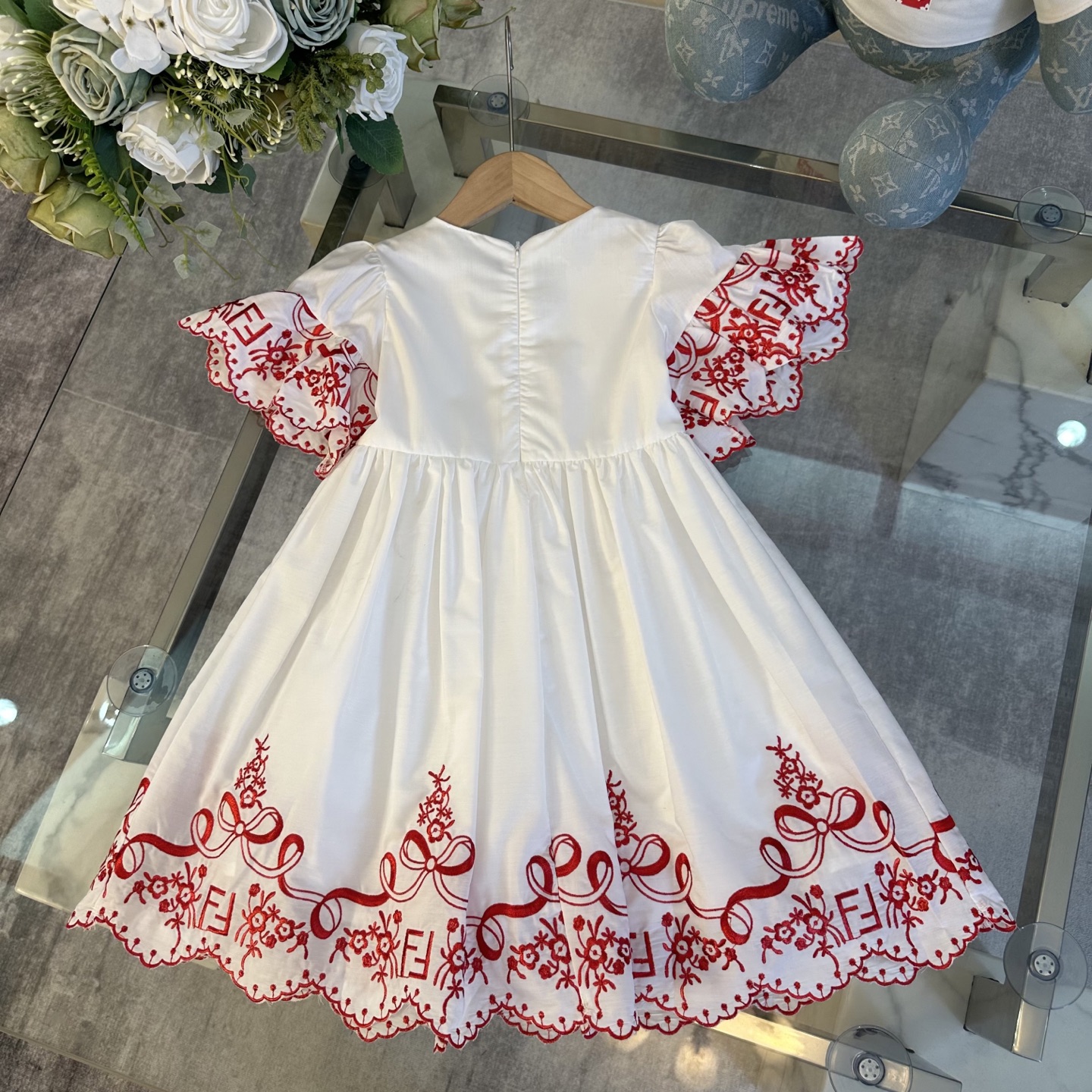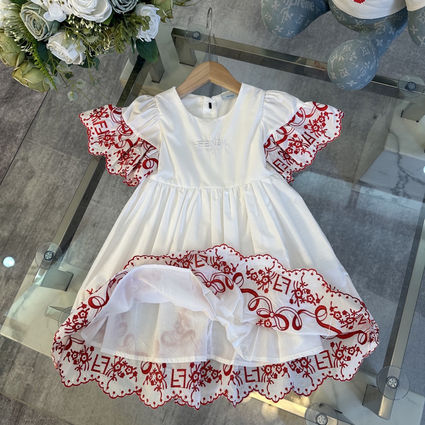 Fendi, high-end children's clothes, girls dress, double layer design, outer woven cotton, cotton, inner outer skirt FF embroidery ?? wine red color, body comfortable, good-looking, code number: 100/110/120/130/140/150 cm