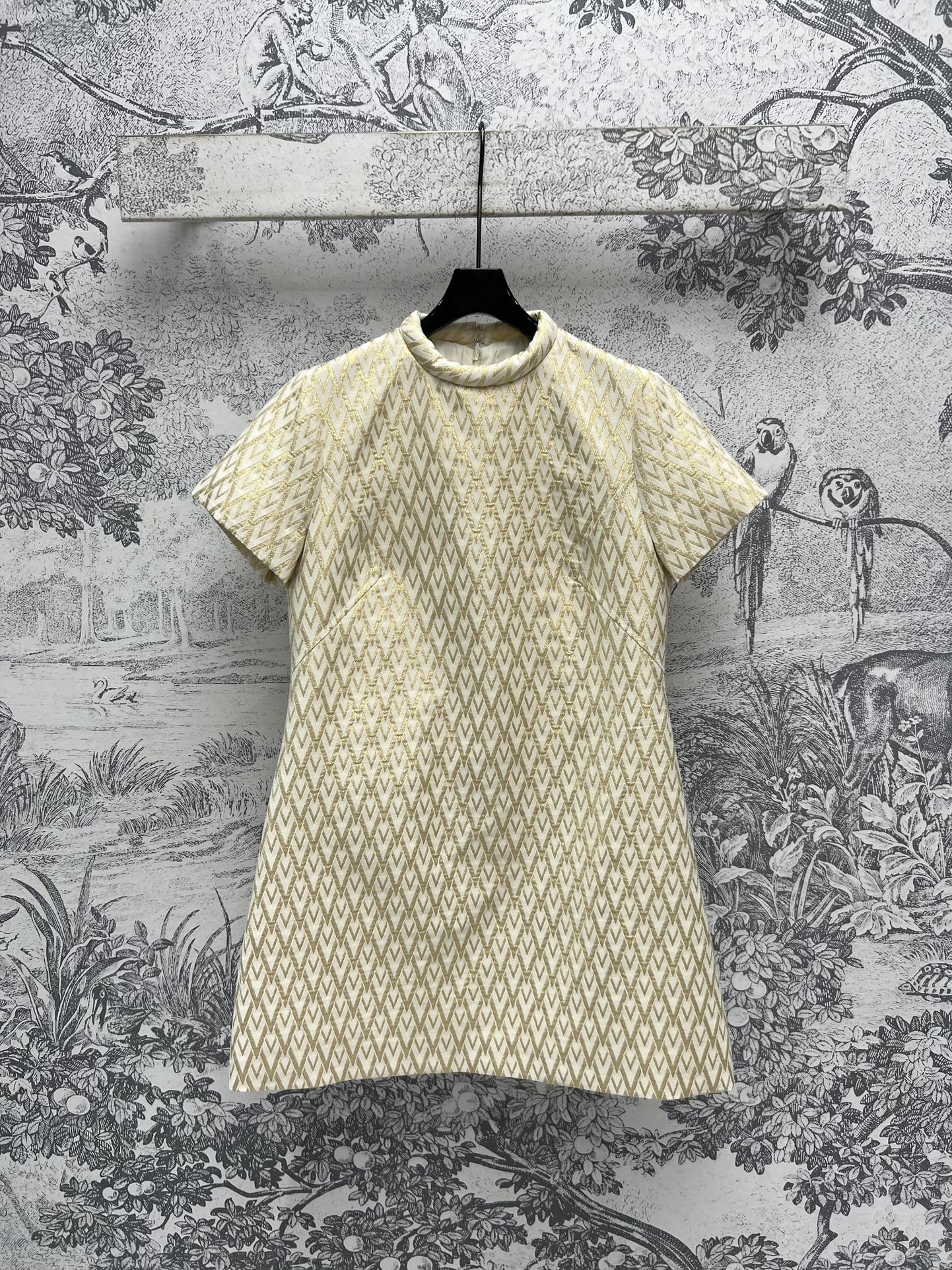 The 24 autumn and winter new V-letter jacquard short-sleeved dress features a three-dimensional and form-fitting cut. It exudes a youthful and fashionable charm when worn. The custom-made gold-embossed V-letter jacquard fabric is a must-have for summer vacations. It comes in two colors and three sizes, SML 9289280