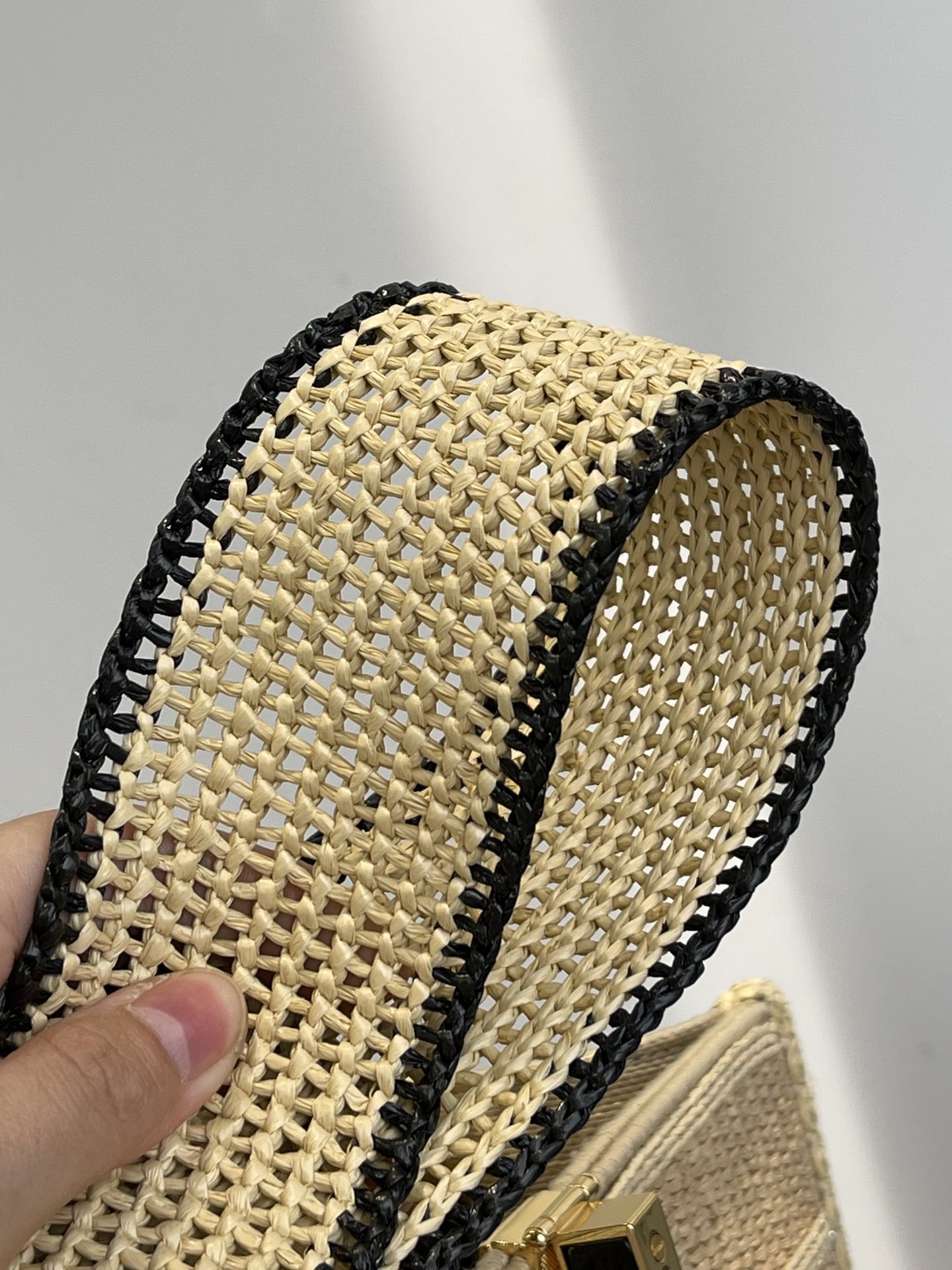 Let's take a look at the surface of the bag. It is hand-woven from tough raffia grass. The woven logo is very smooth. Overall, it is very regular and solid. Every knot and every line is very exquisite and smooth. The texture of the weaving is so extraordinary and refined that it will make your eyes light up at first sight!