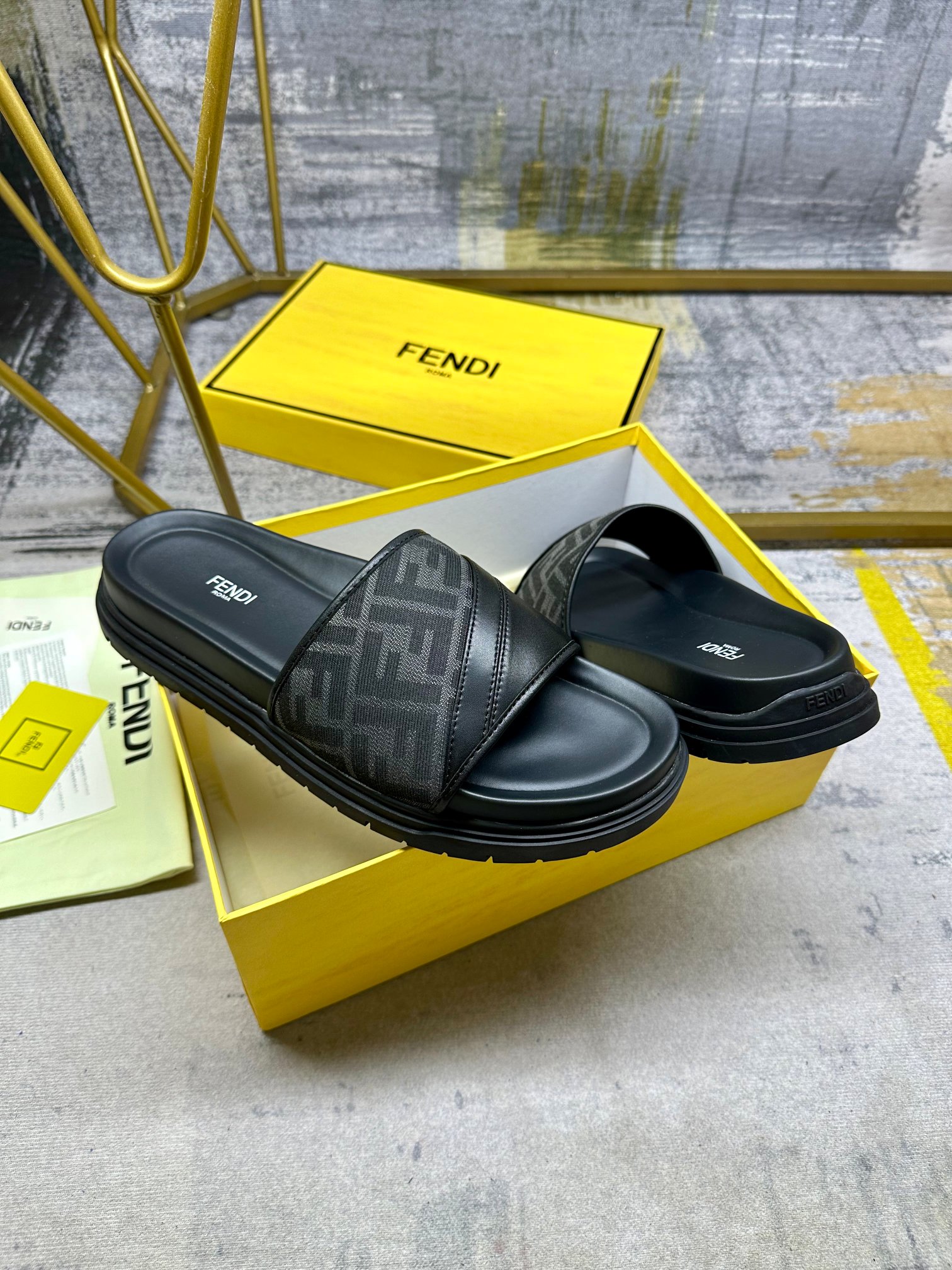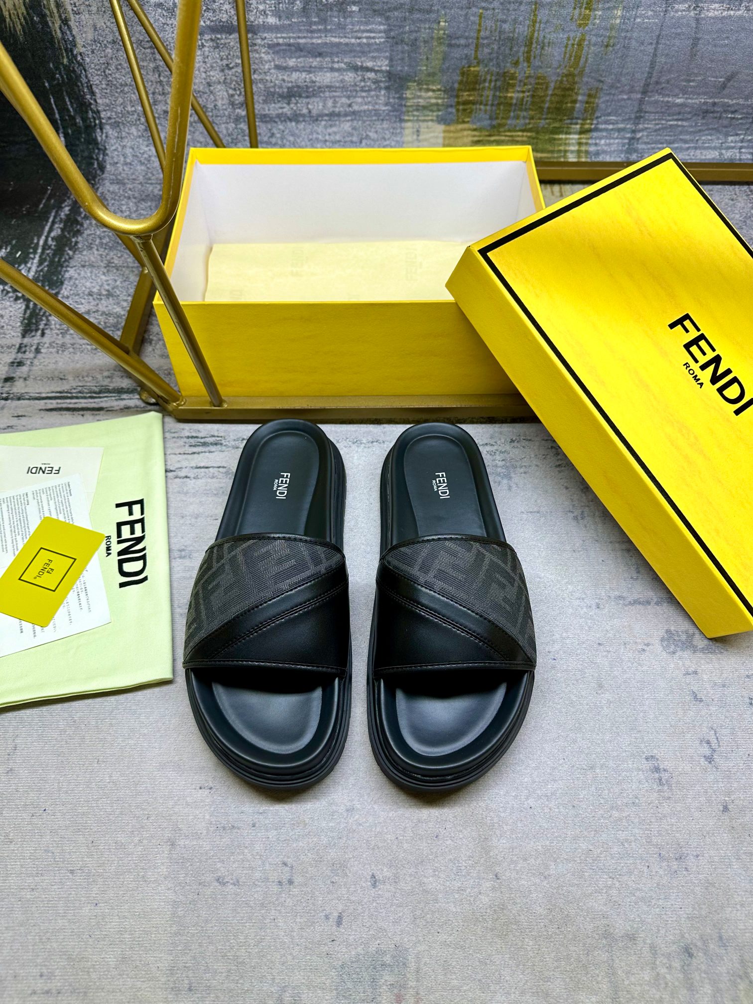 Model No. #2006??????FENDI latest wide padded slipper, grey FF jacquard and black cowhide splicing, black ribbon diagonal setting, anti-slip rubber sole, men 40-45 size