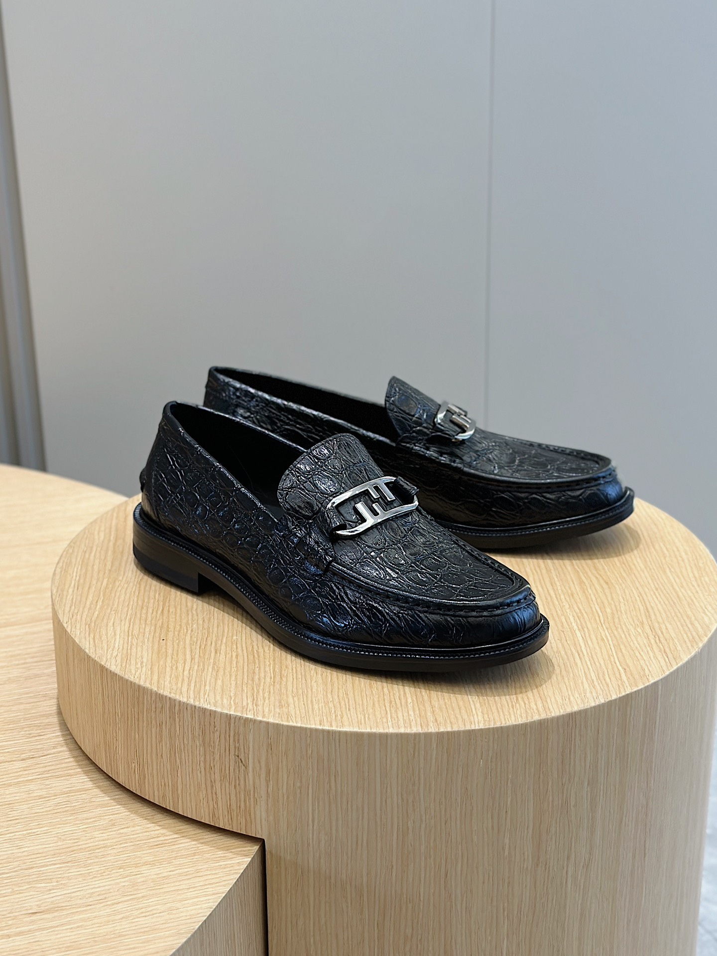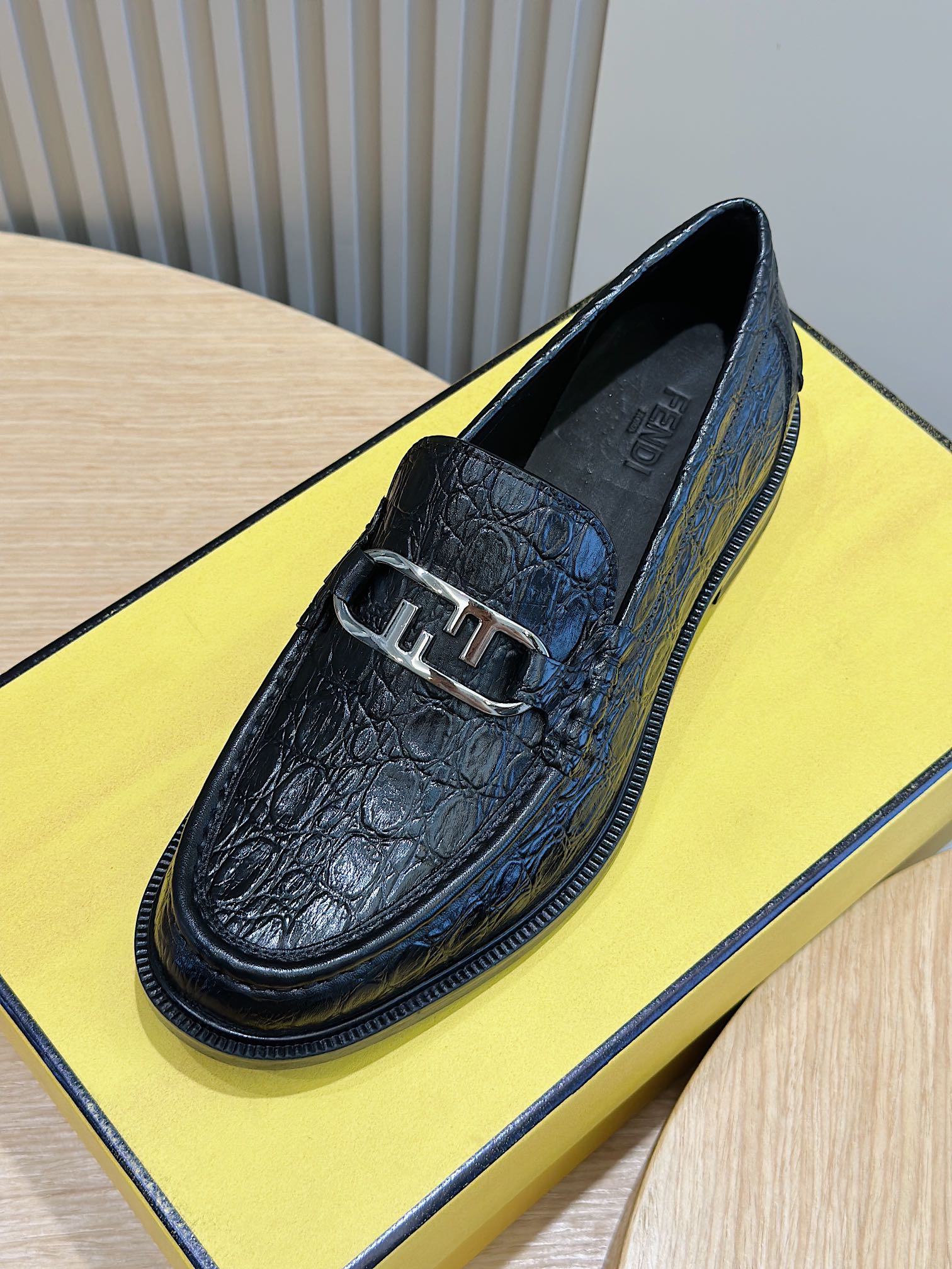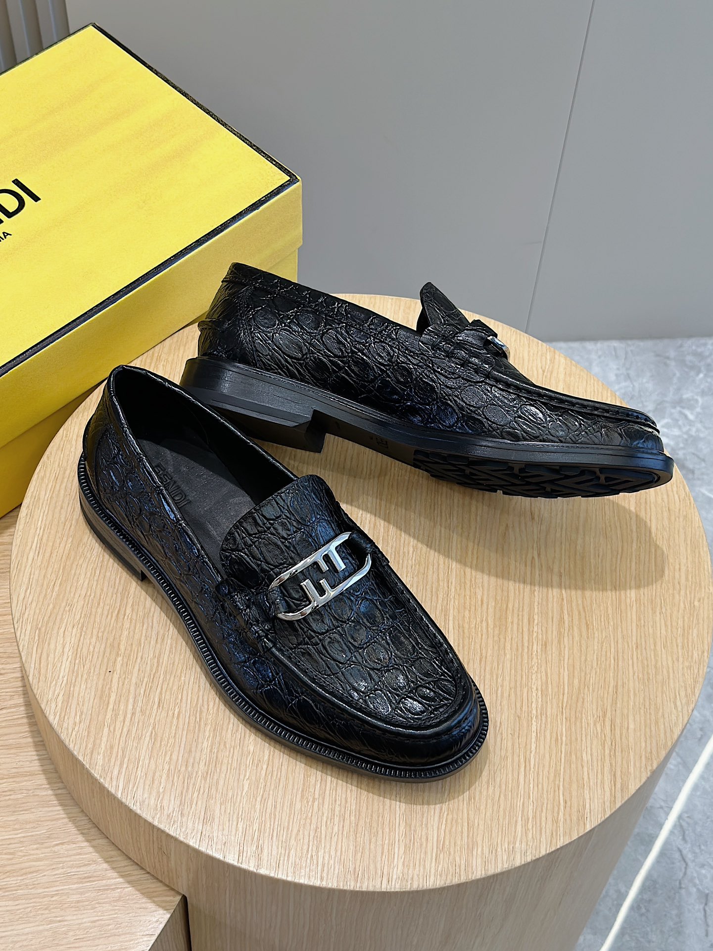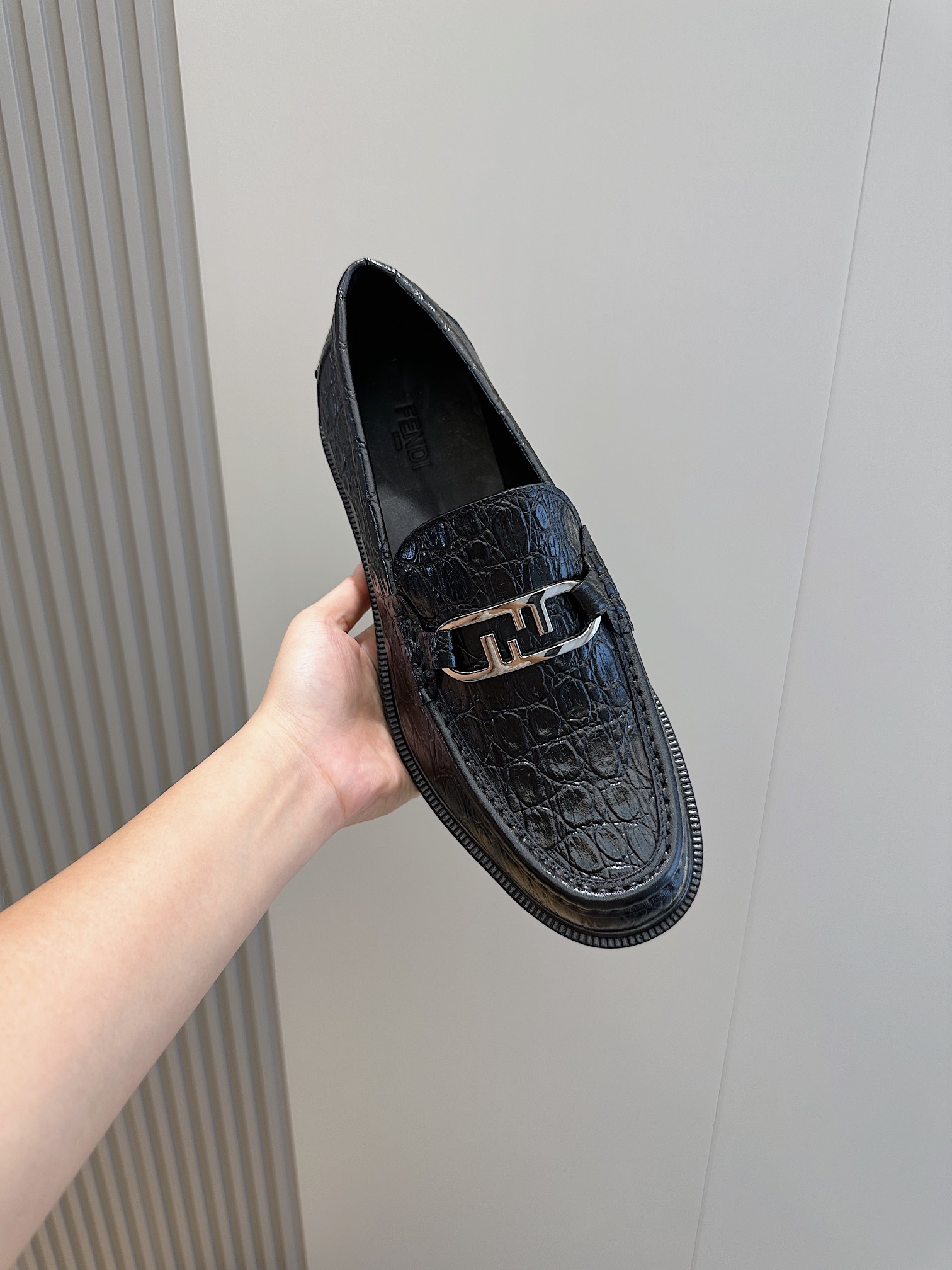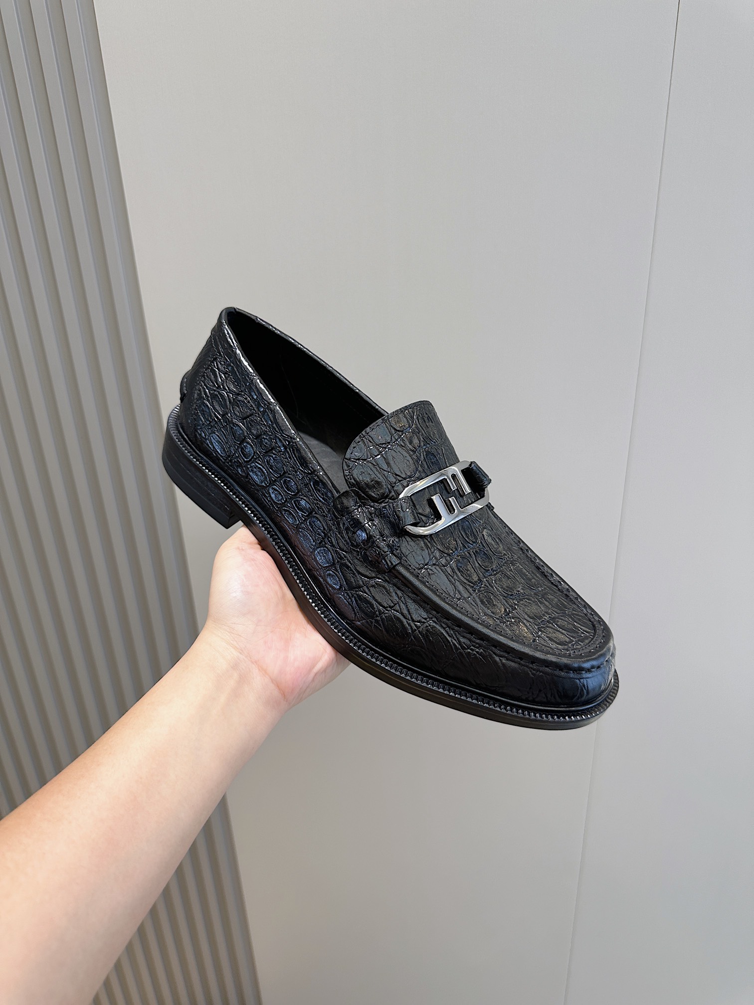 Model #4005??????Fendi black cowhide loafers for men It is decorated with FF pattern and has a silver finish metal. Imported cowhide material, cowhide lining, original factory outsole Size:39-44 (custom-made at 38.45)