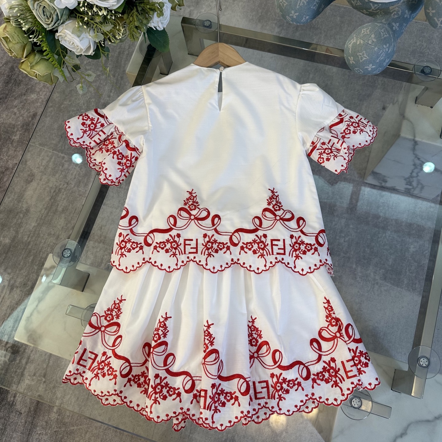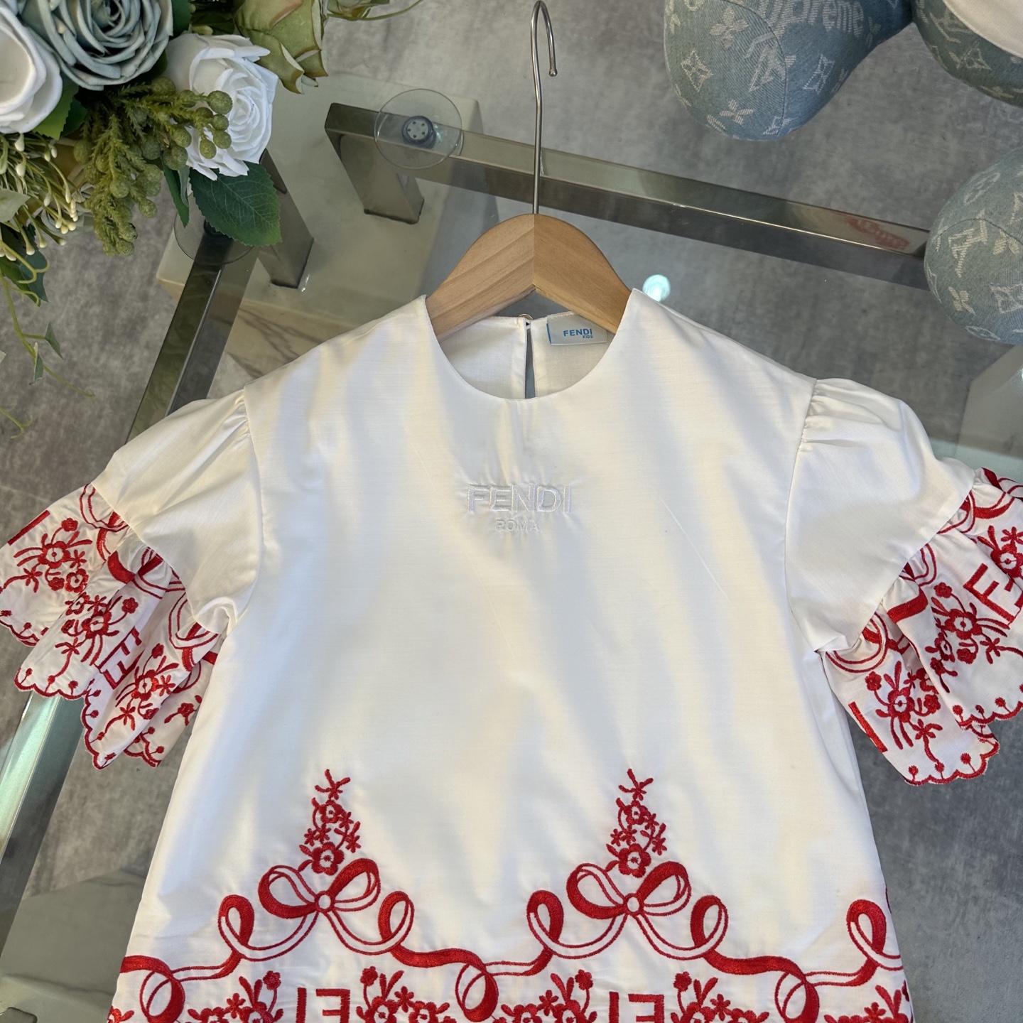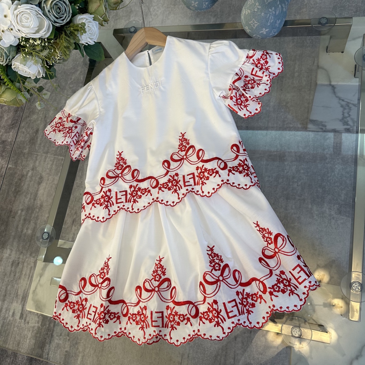 Fendi, high-end children's clothes, girls dress, double layer design, outer woven cotton, cotton, inner outer skirt FF embroidery ?? wine red color, body comfortable, good-looking, code number: 100/110/120/130/140/150 cm