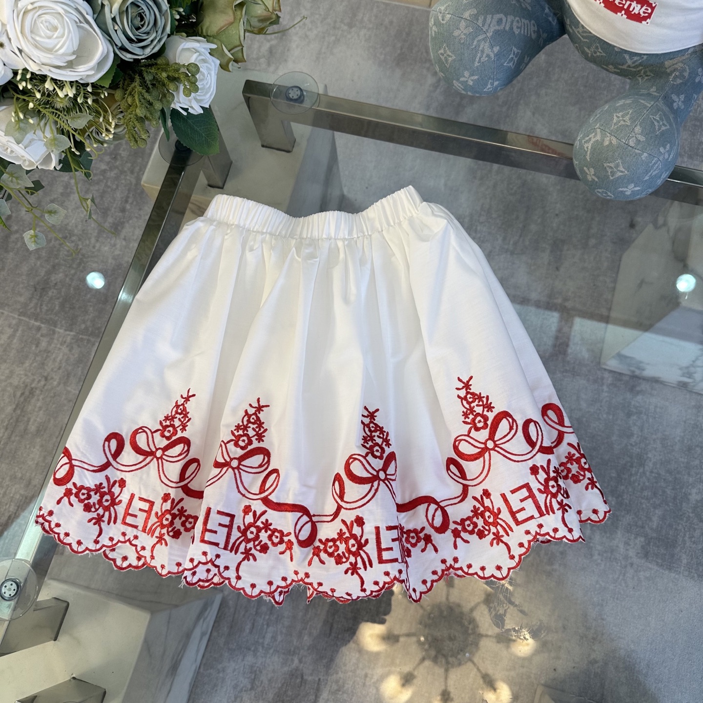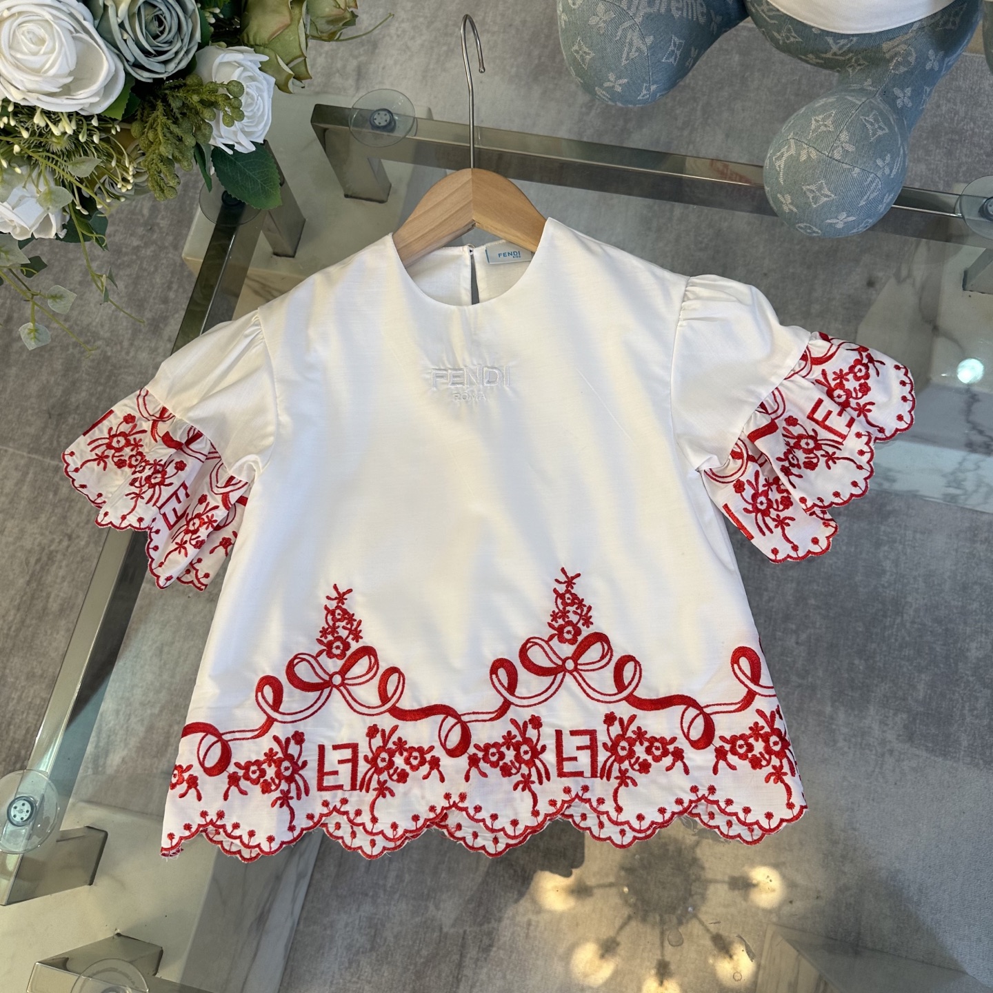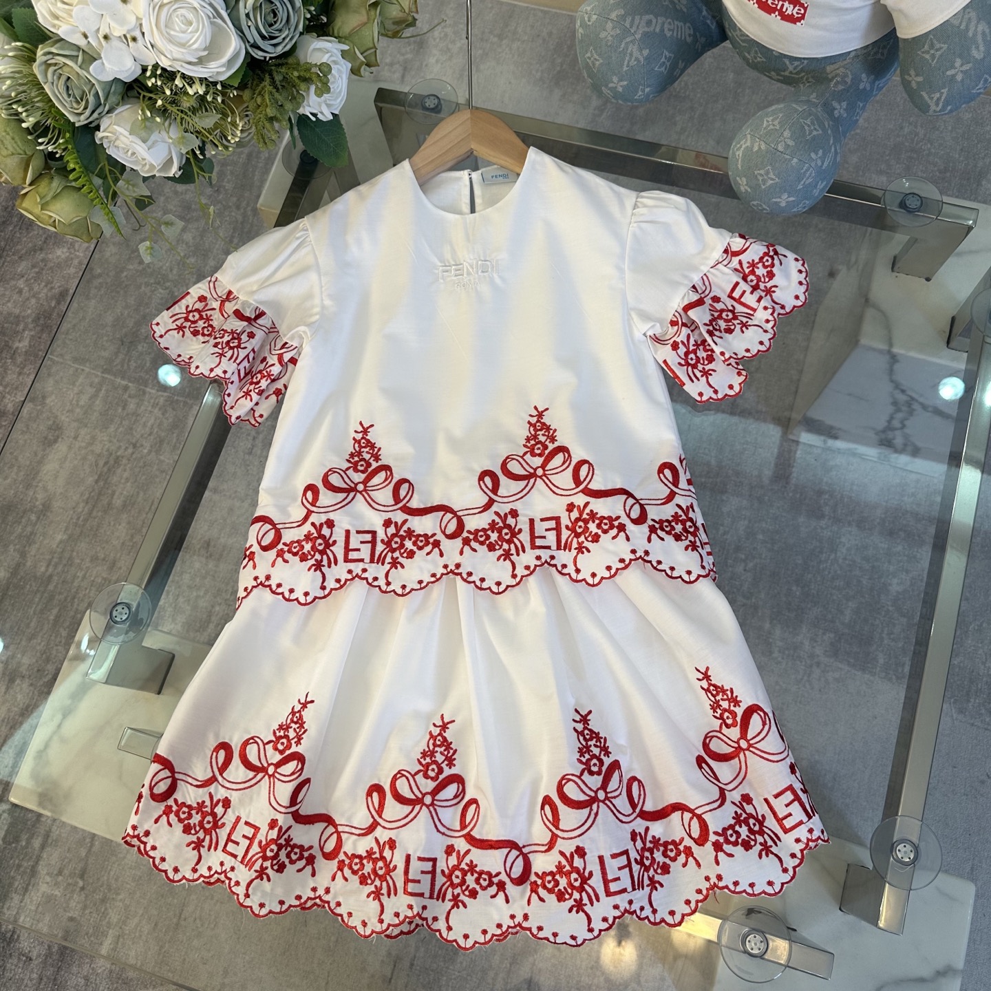 Fendi, high-end children's clothes, girls dress, double layer design, outer woven cotton, cotton, inner outer skirt FF embroidery ?? wine red color, body comfortable, good-looking, code number: 100/110/120/130/140/150 cm