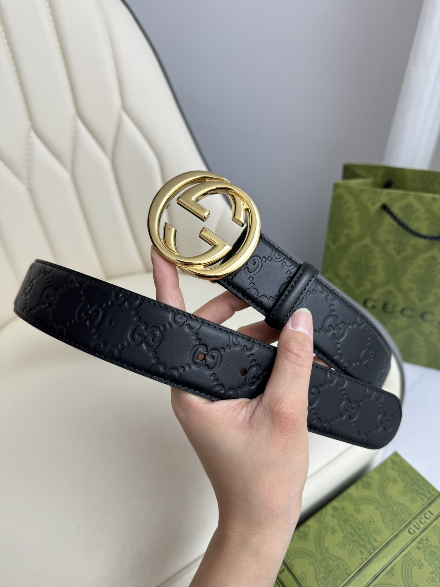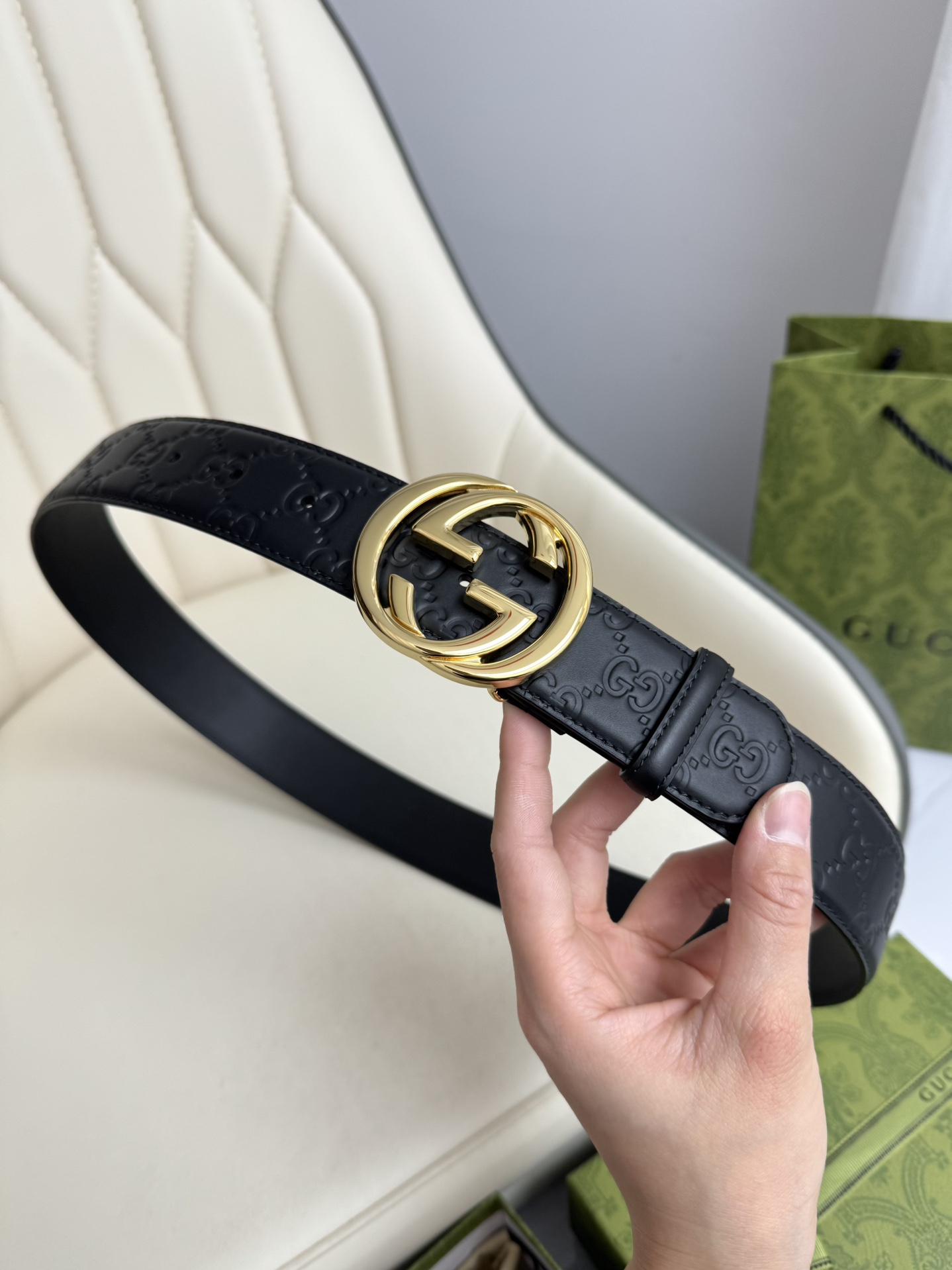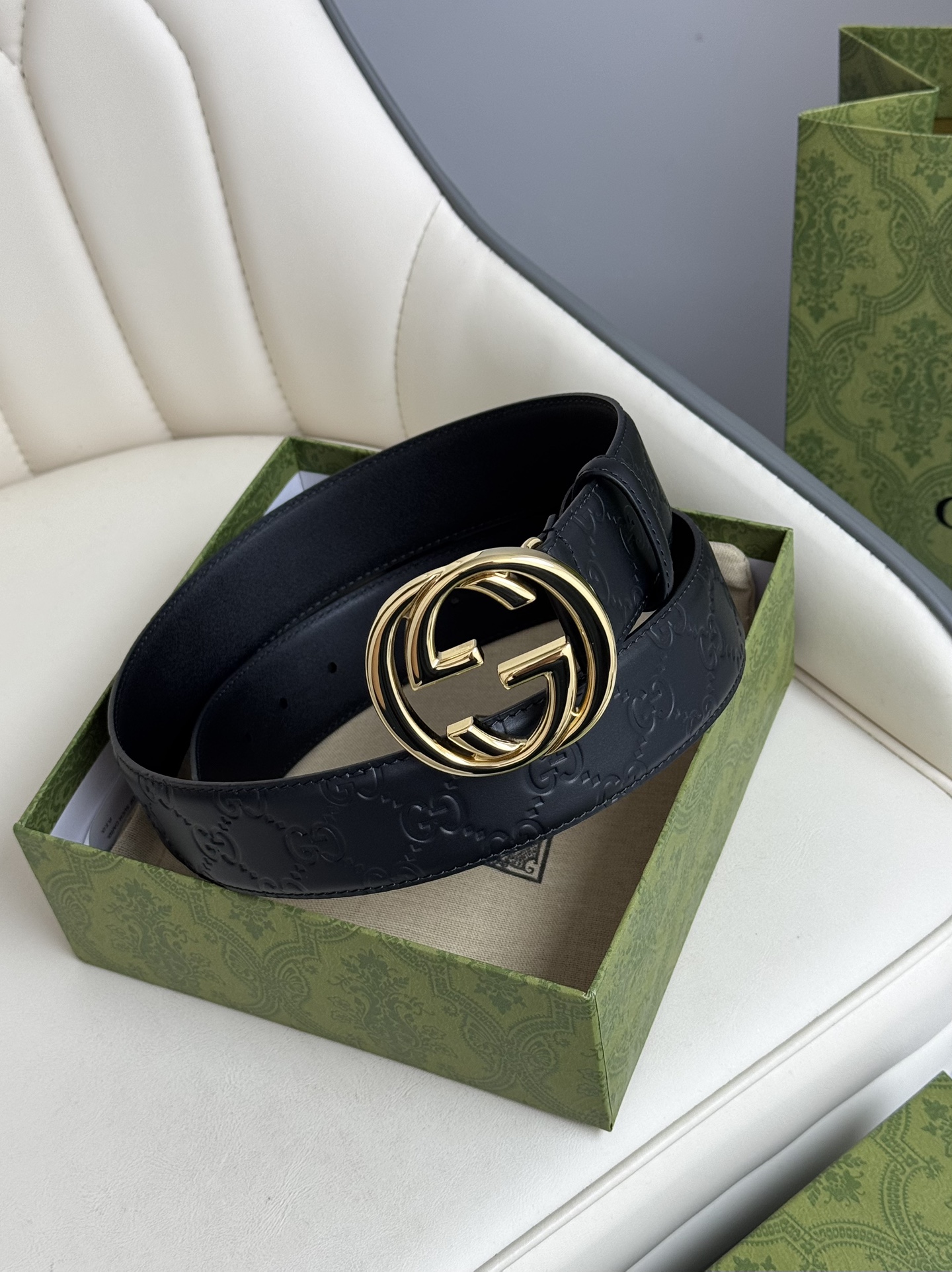 This GUCCI top-grain cowhide 4.0cm wide double-sided dual-purpose interlocking double G-band buckle belt is exquisitely crafted from Gucci's Signature leather with heat embossing technology. It has a thick touch and clear and distinct printed patterns.