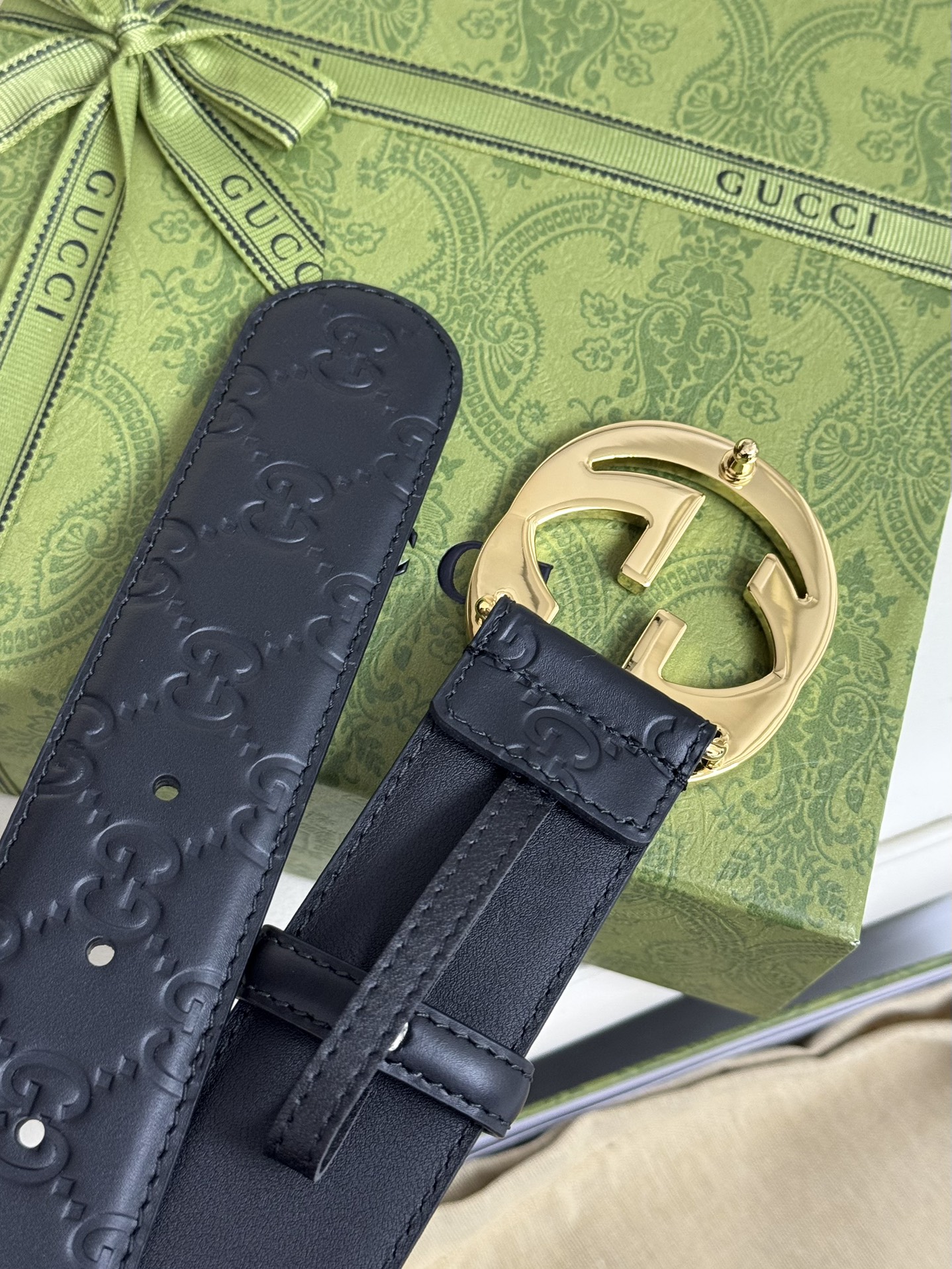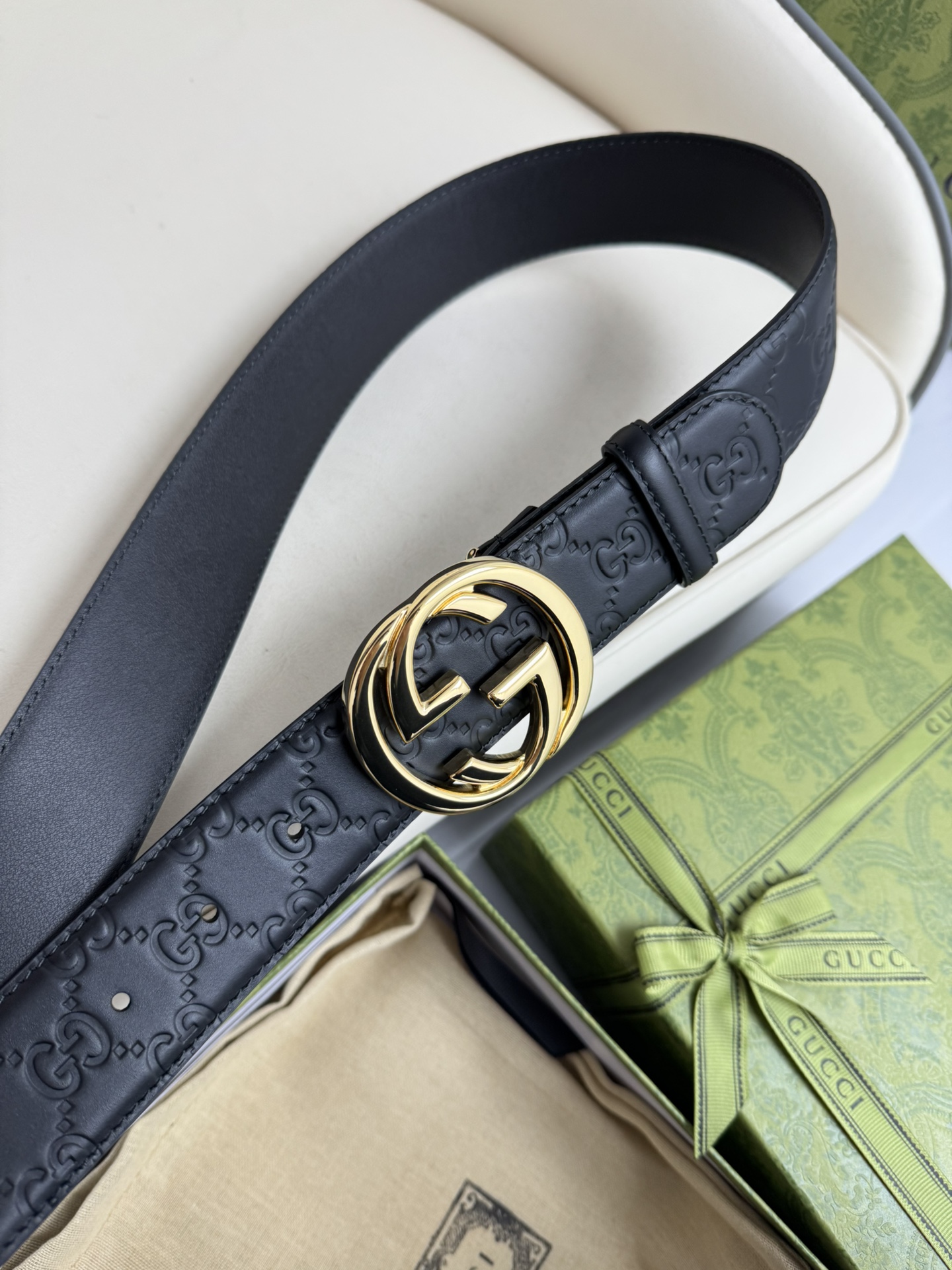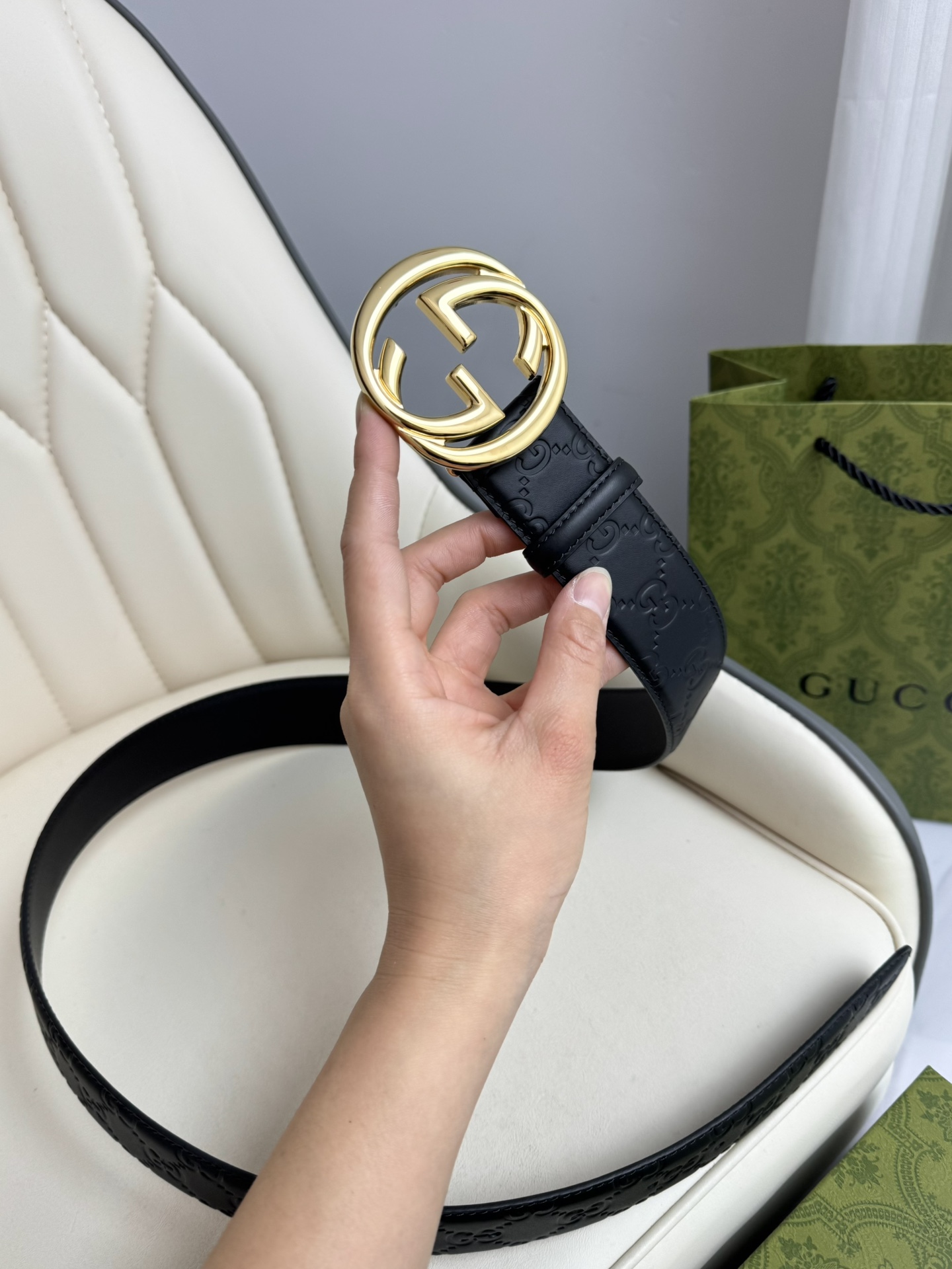 This GUCCI top-grain cowhide 4.0cm wide double-sided dual-purpose interlocking double G-band buckle belt is exquisitely crafted from Gucci's Signature leather with heat embossing technology. It has a thick touch and clear and distinct printed patterns.