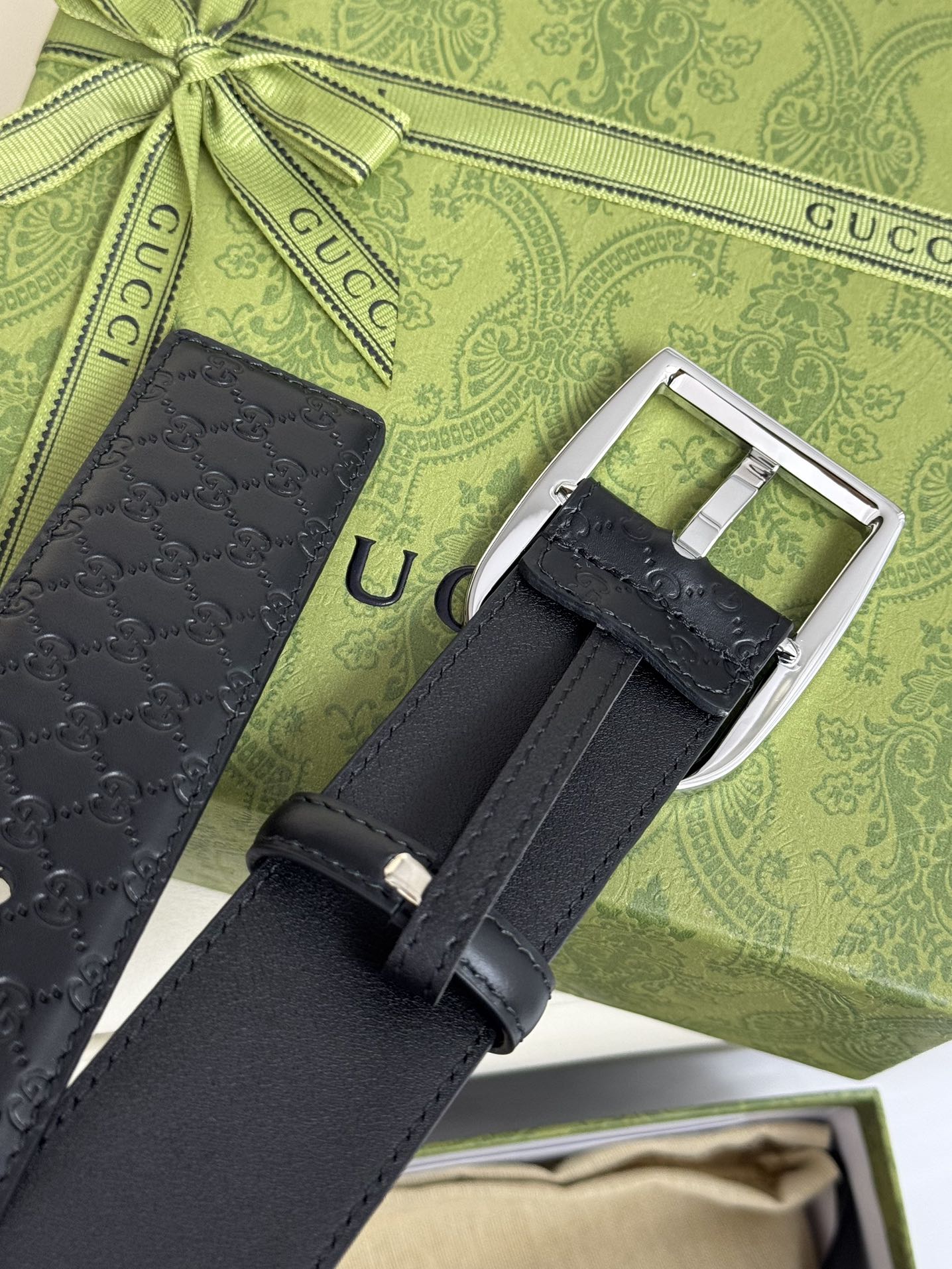 Gucci CCCI size :4.0cm. The belt body is made of black top-grain cowhide with the Gucci logo small G print, and is paired with the new GG interlocking polished copper metal buckle. It is an Italian fashion masterpiece