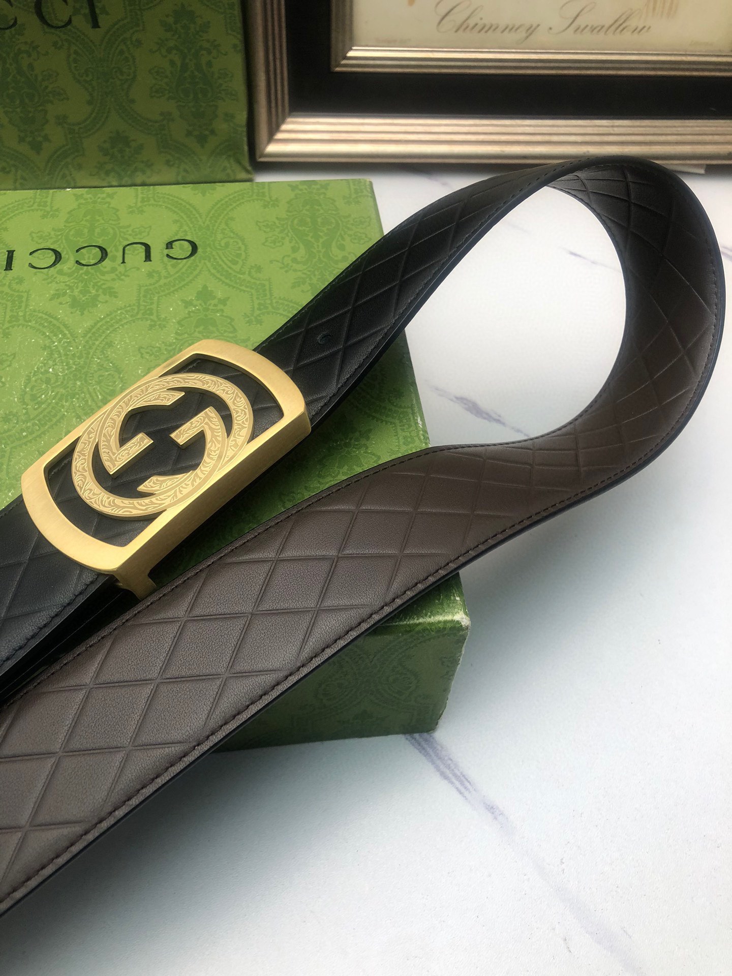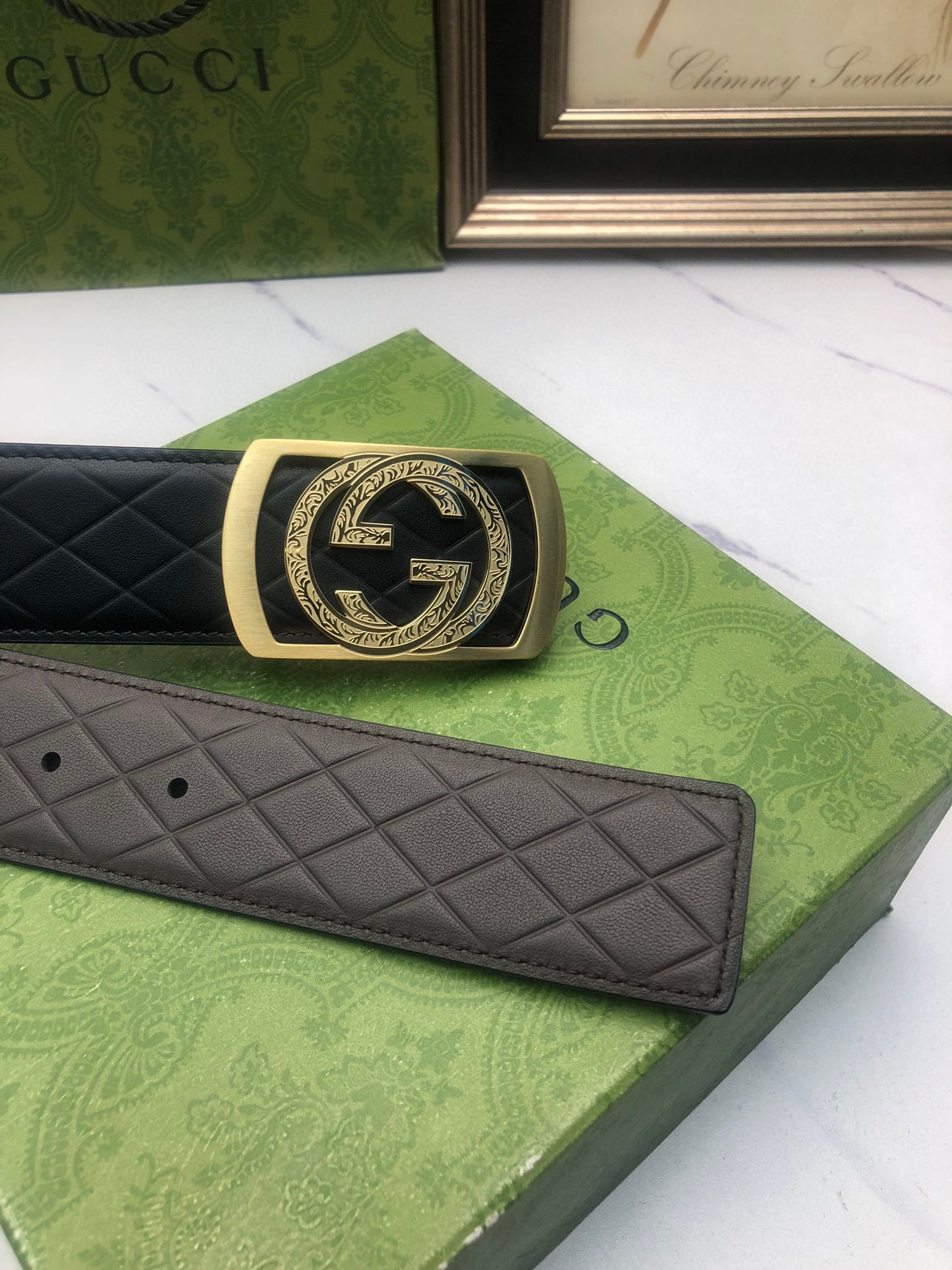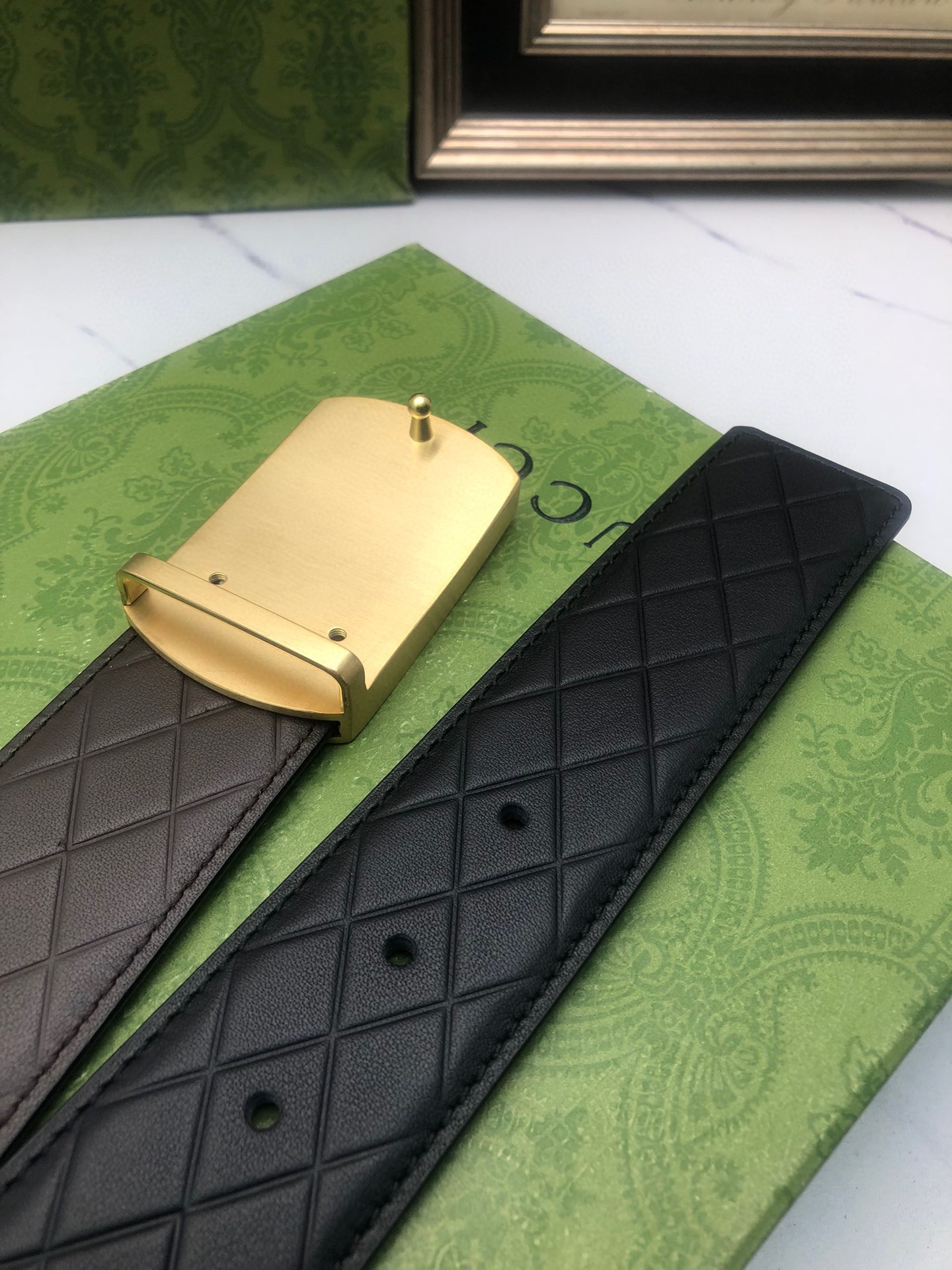 Gucci: Original single-layer calfskin with double-sided embossed patterns, black and brown in one piece, suitable for both sides, decorated with the original single buckle of the logo. The counter width is 4.0