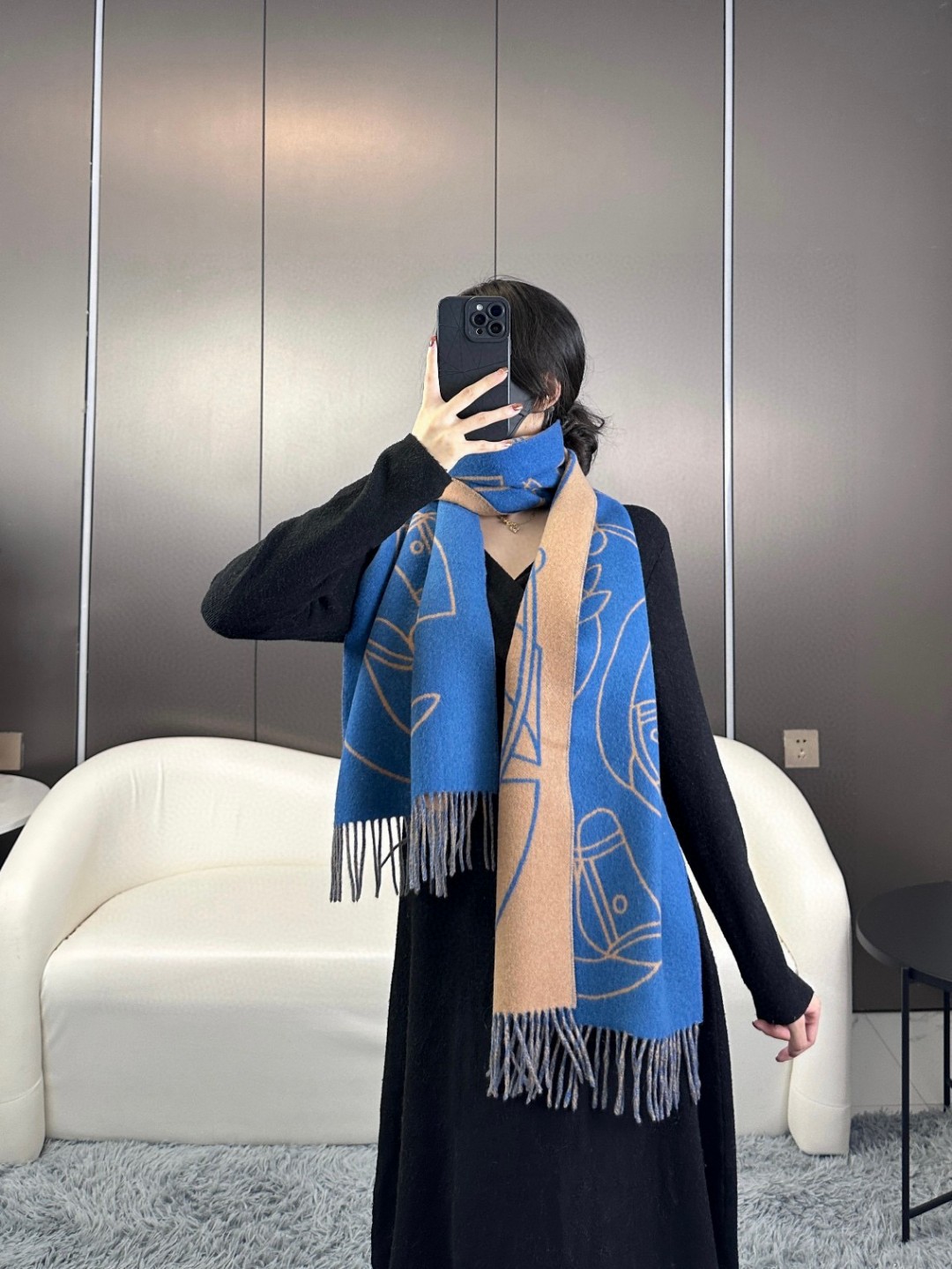 This new Hermes scarf features a delicate color-blocking jacquard weaving, presenting the Entrelacs Equestres horse head pattern designed by Geoff McFetridge. The size is 40*195CM