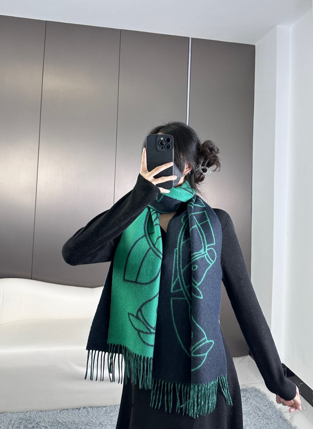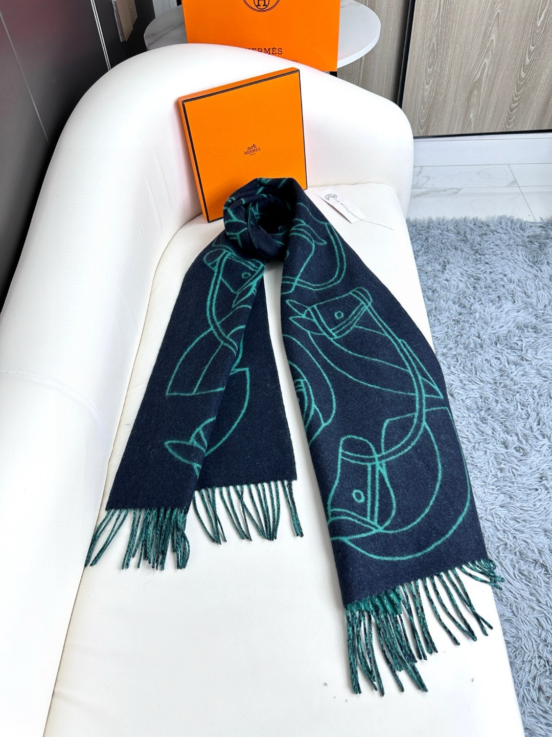 This new Hermes scarf features a delicate color-blocking jacquard weaving, presenting the Entrelacs Equestres horse head pattern designed by Geoff McFetridge. The size is 40*195CM