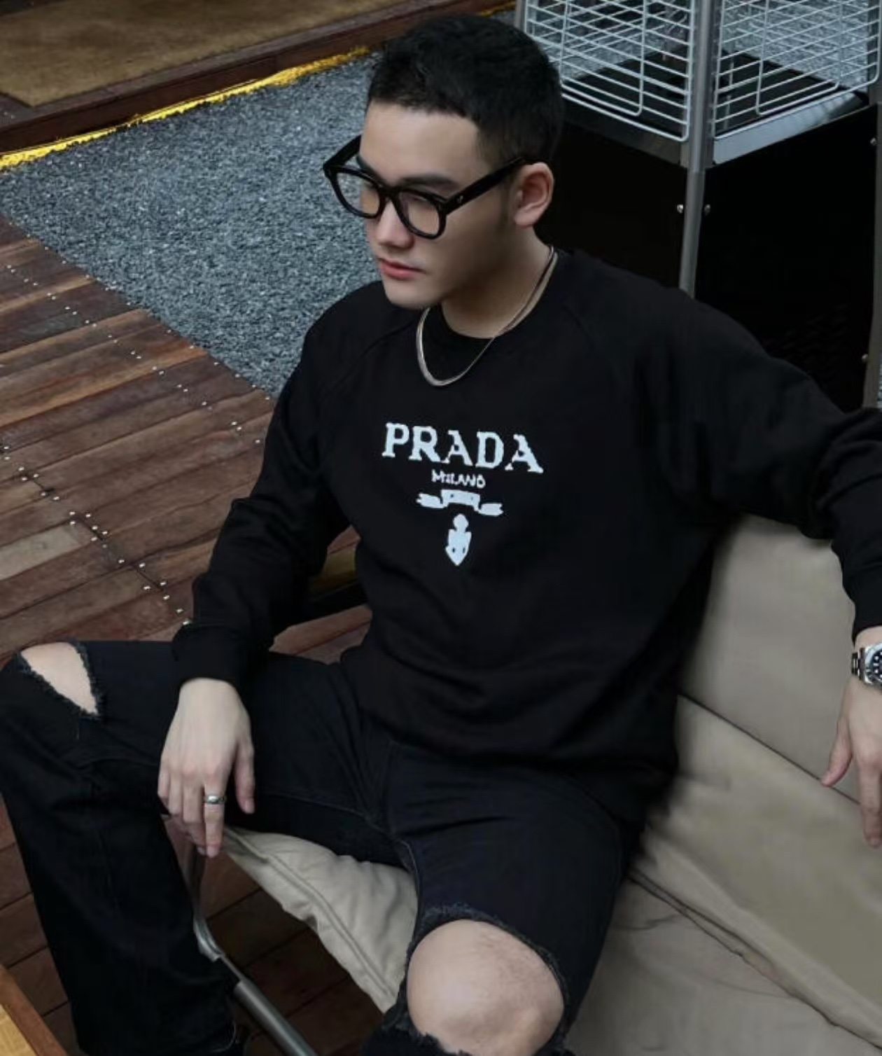 PRADA/ Prada 24Fw toothbrush embroidered logo casual round-neck sweatshirt wearing effect #