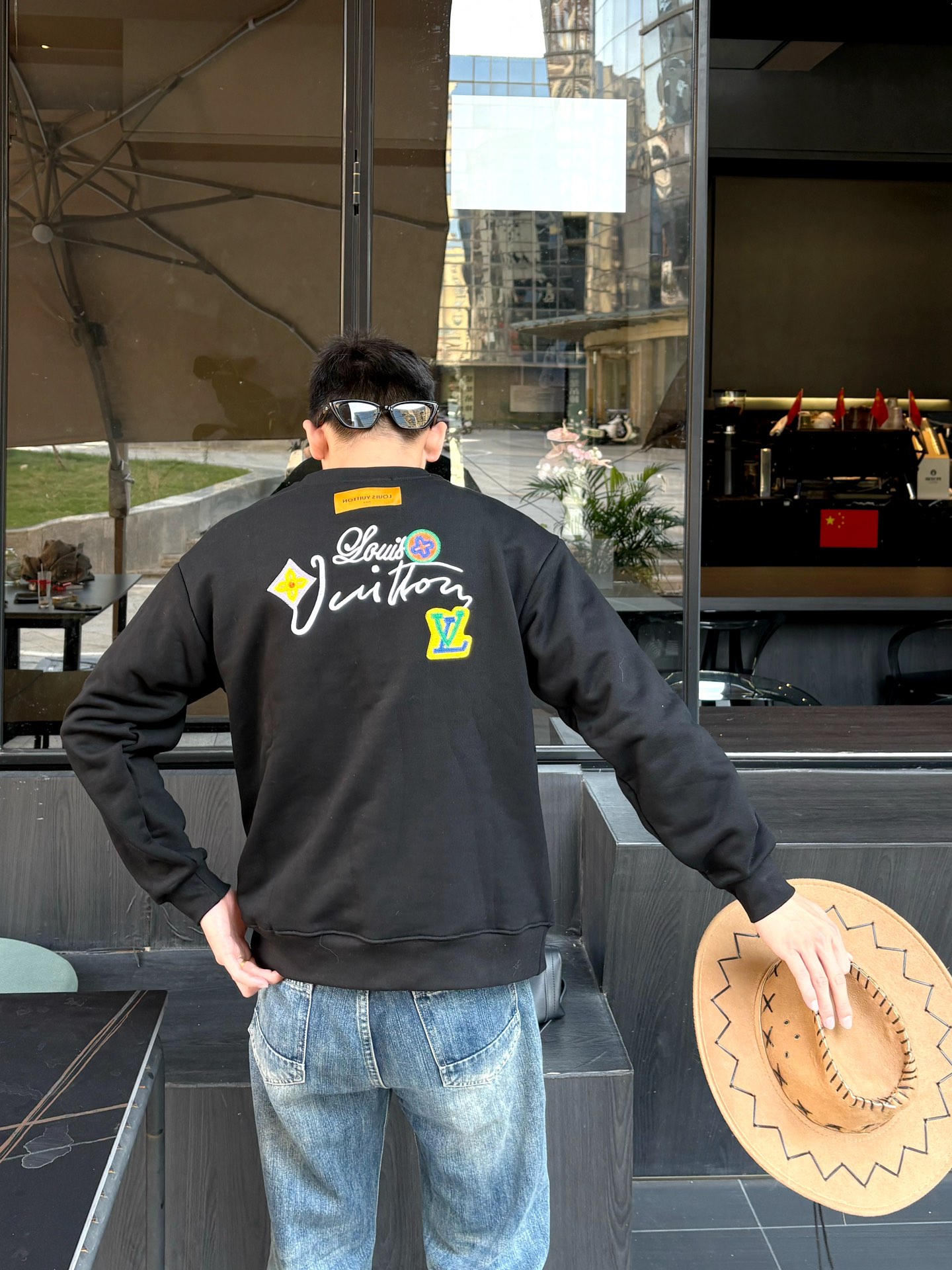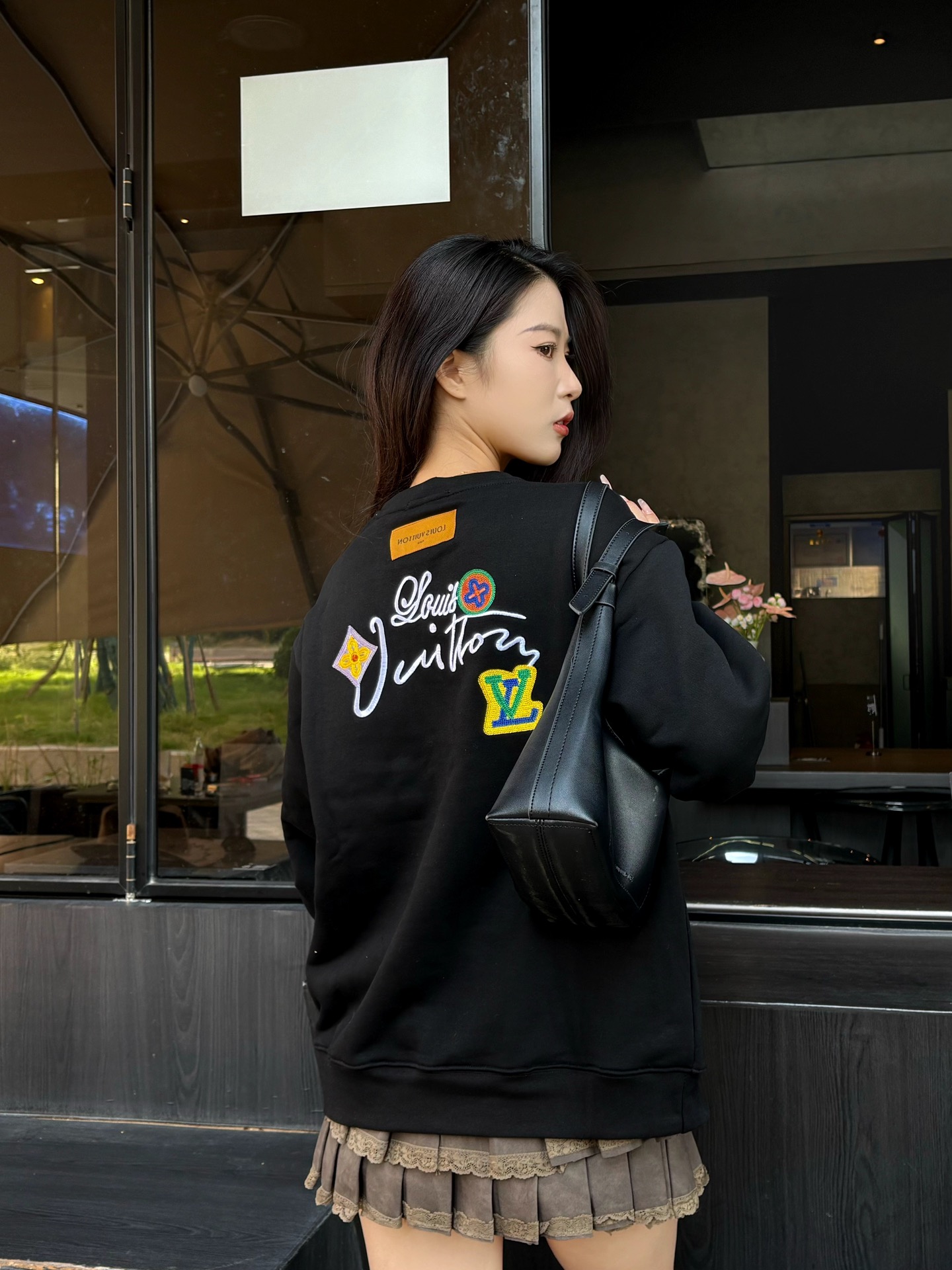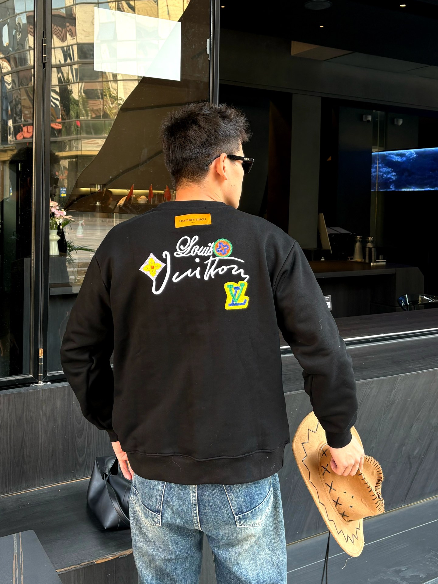 The wearing effect of the Louis Vuitton 24Fw floral letter embroidered round-neck sweatshirt #