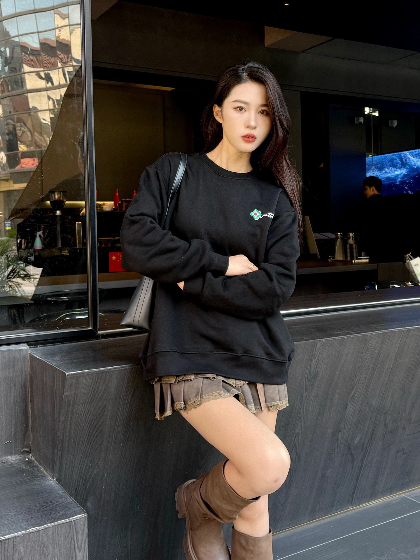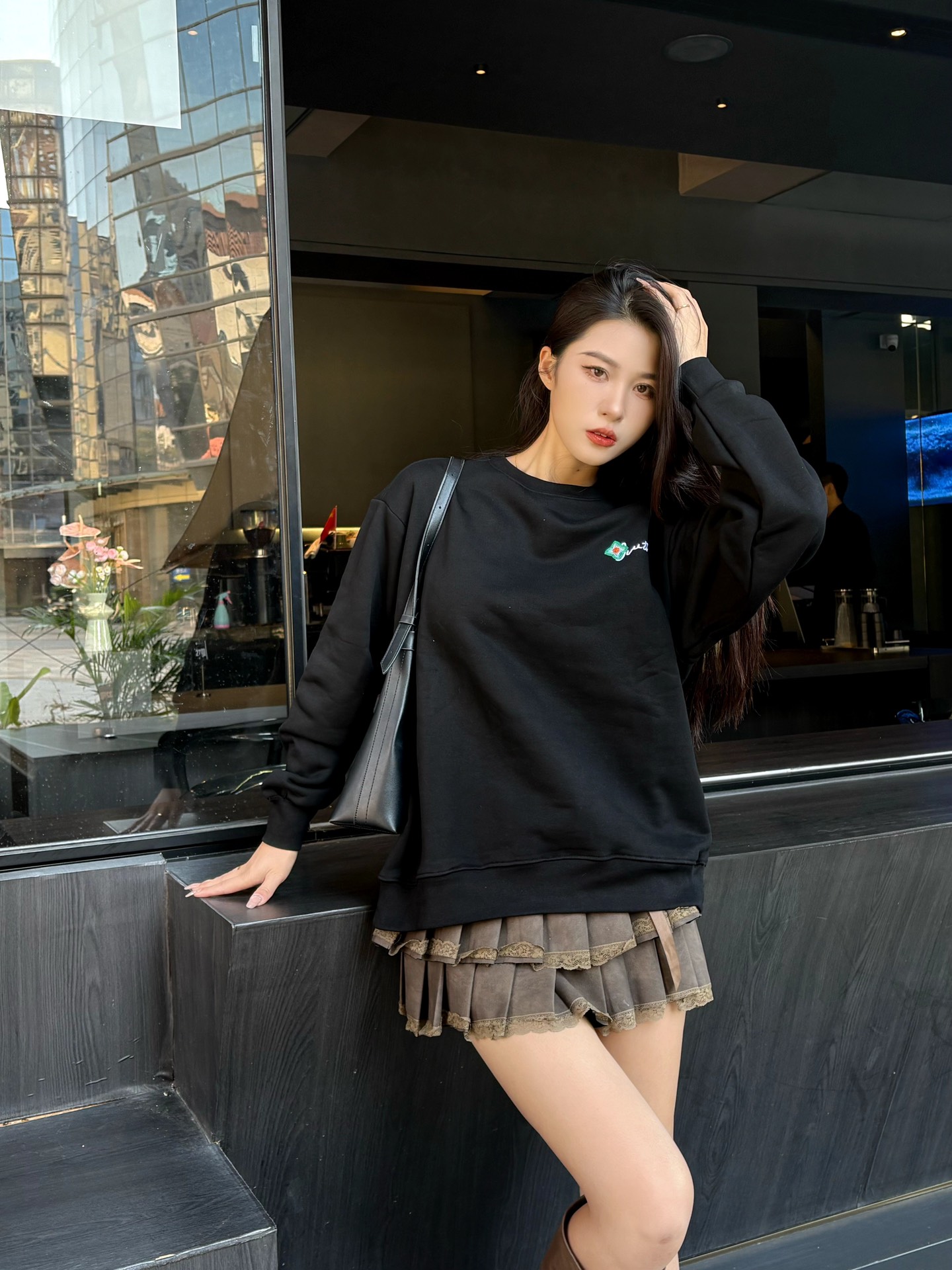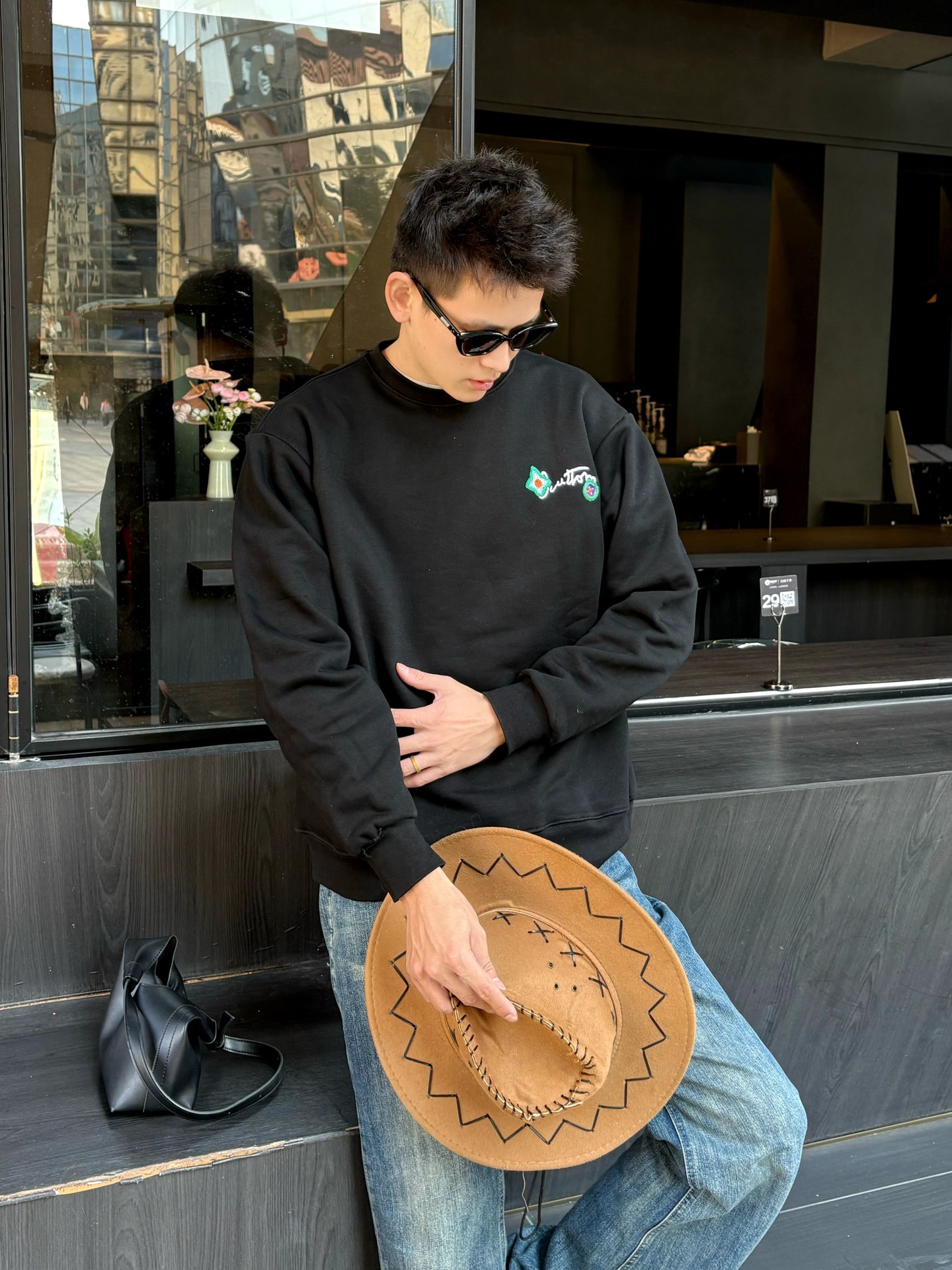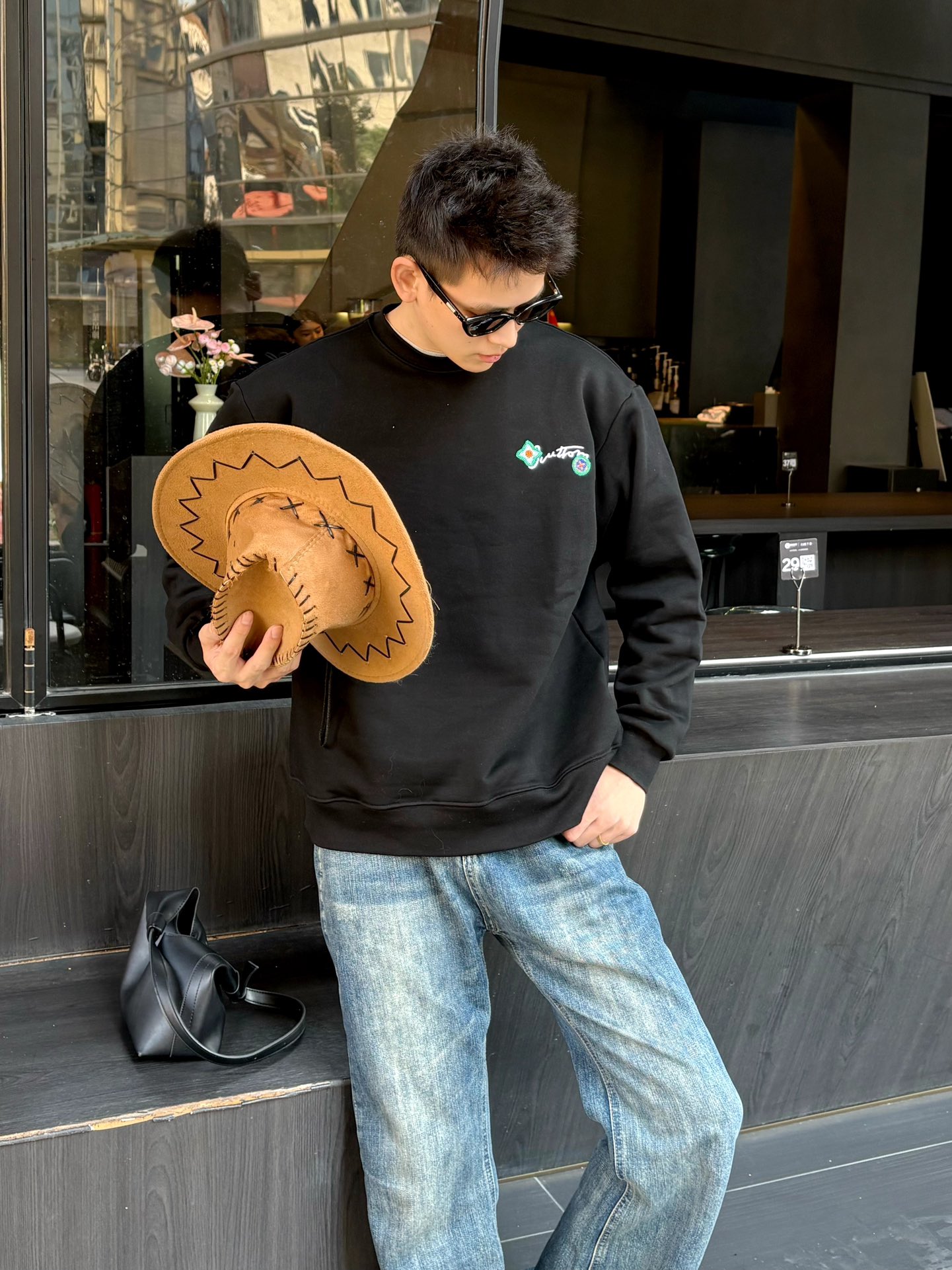 The wearing effect of the Louis Vuitton 24Fw floral letter embroidered round-neck sweatshirt #