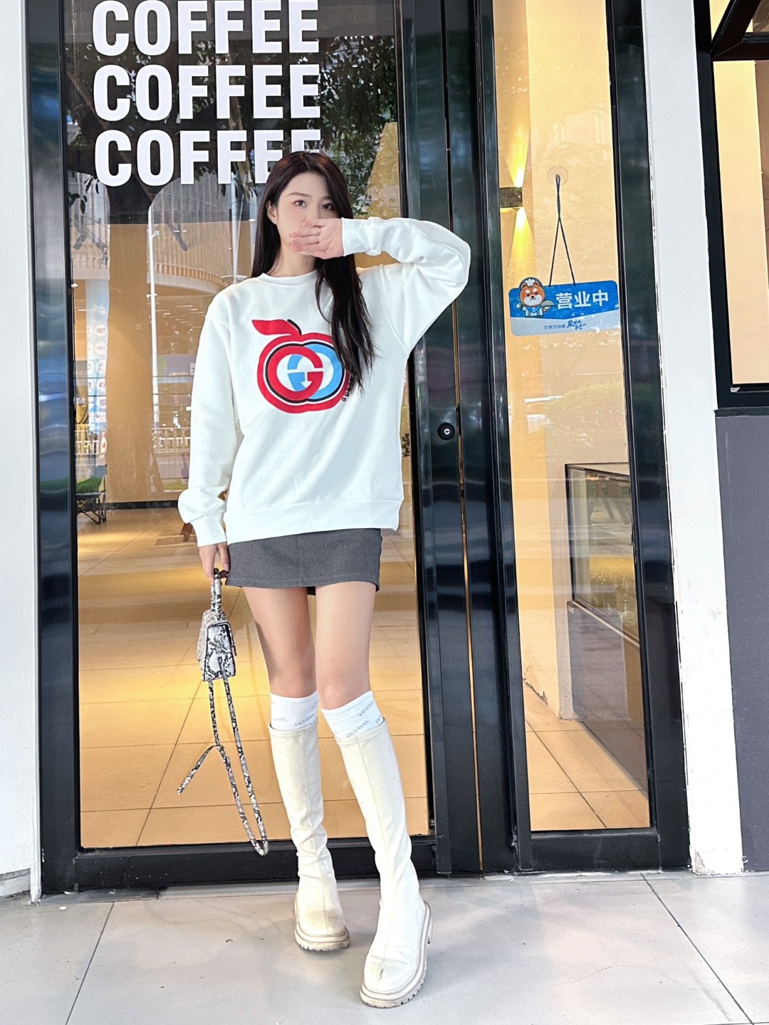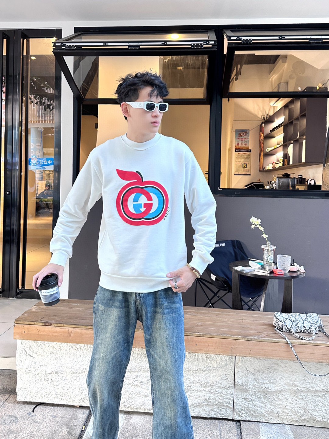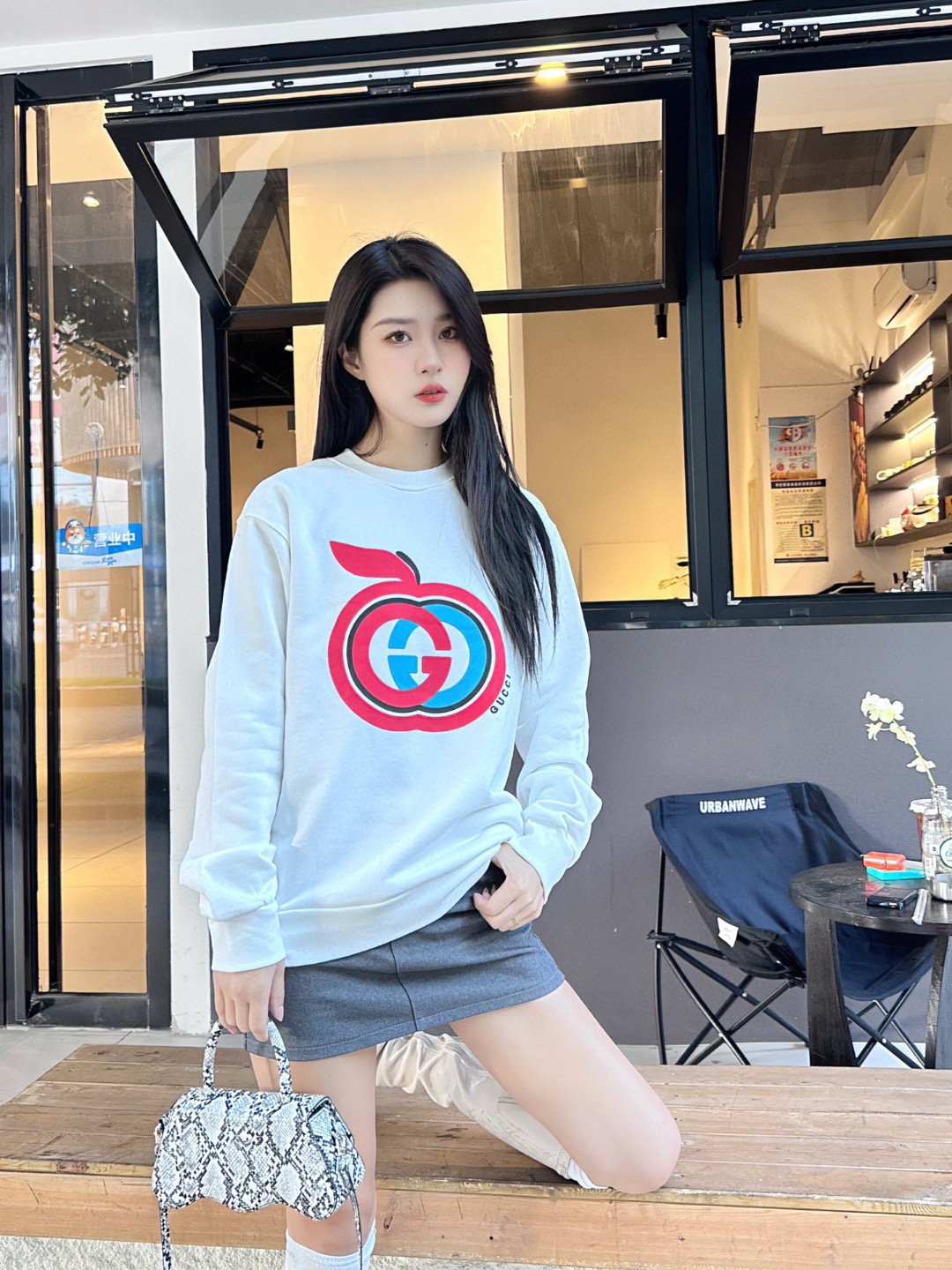 The wearing effect of the Gucci/ Gucci Double G Apple foam print suede round neck sweatshirt #