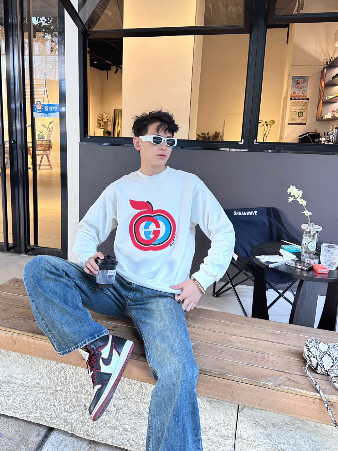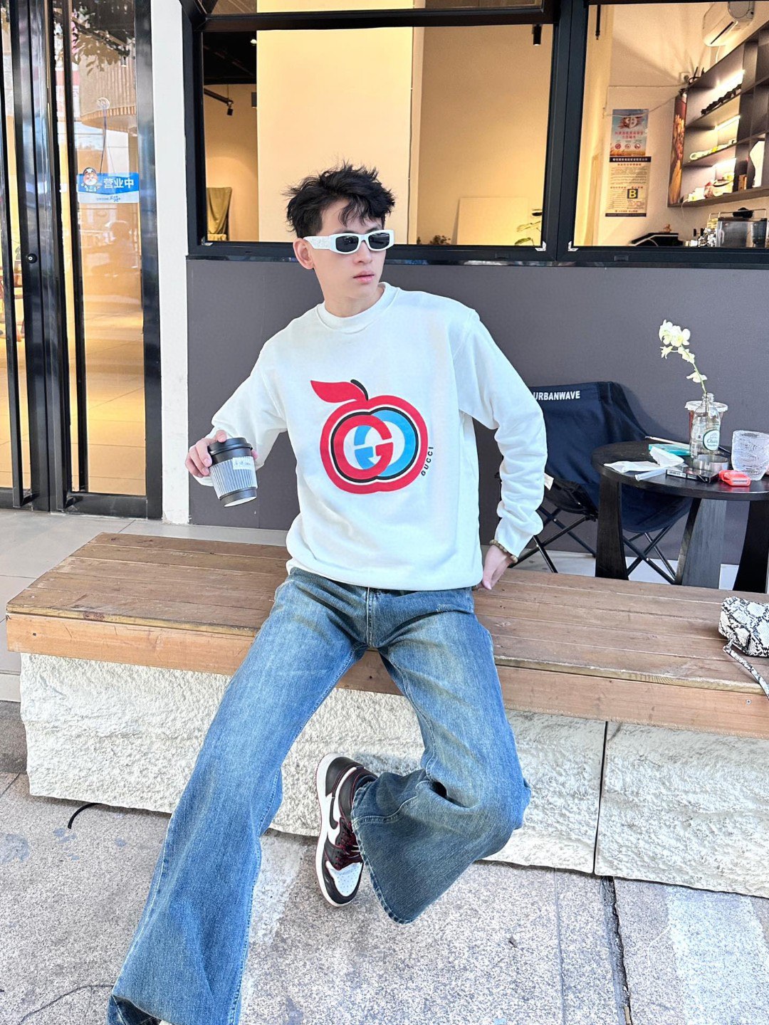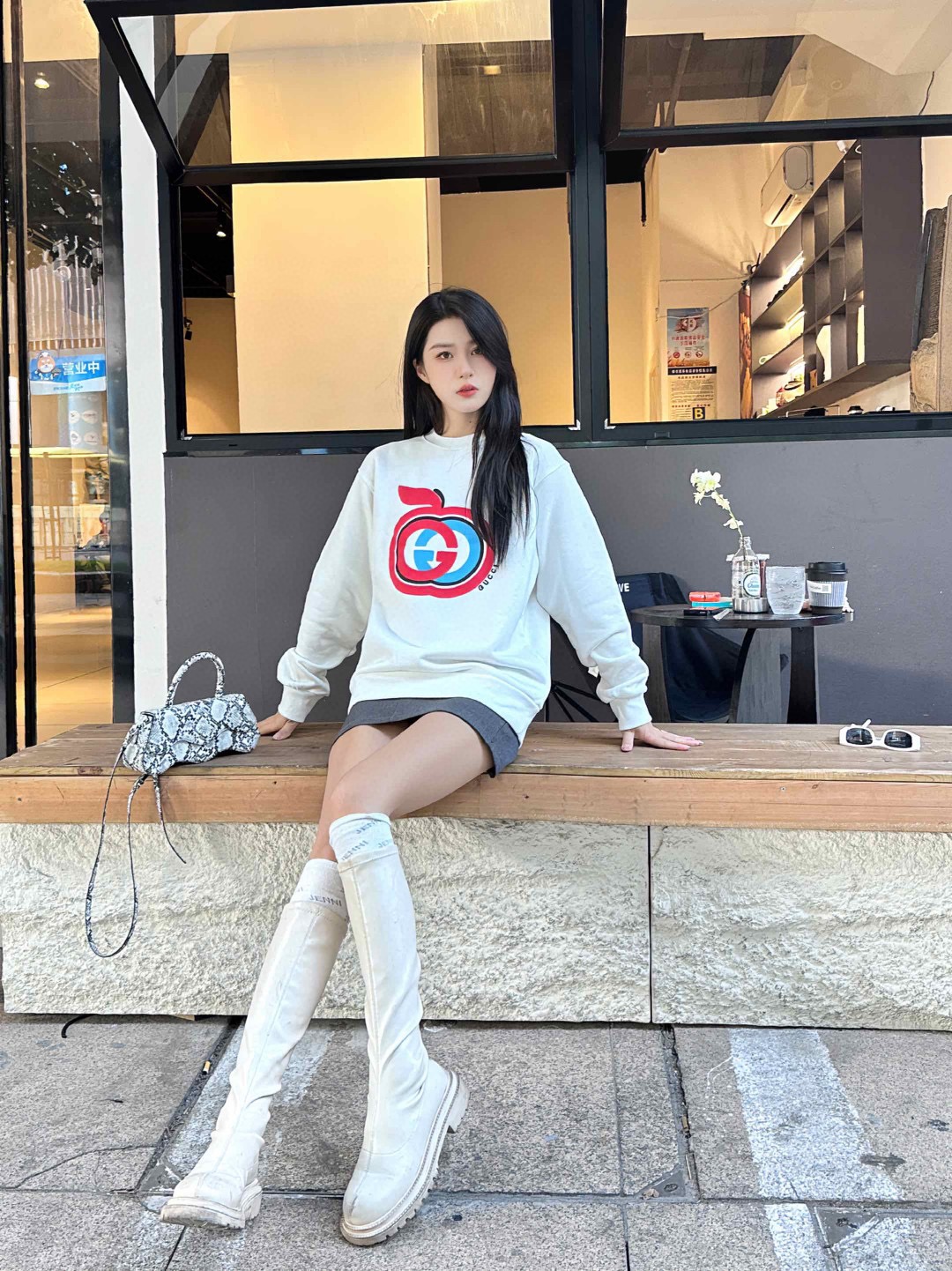 The wearing effect of the Gucci/ Gucci Double G Apple foam print suede round neck sweatshirt #
