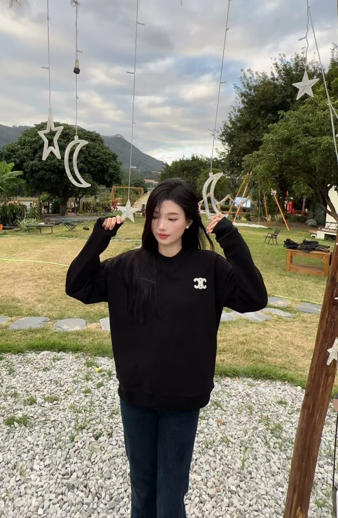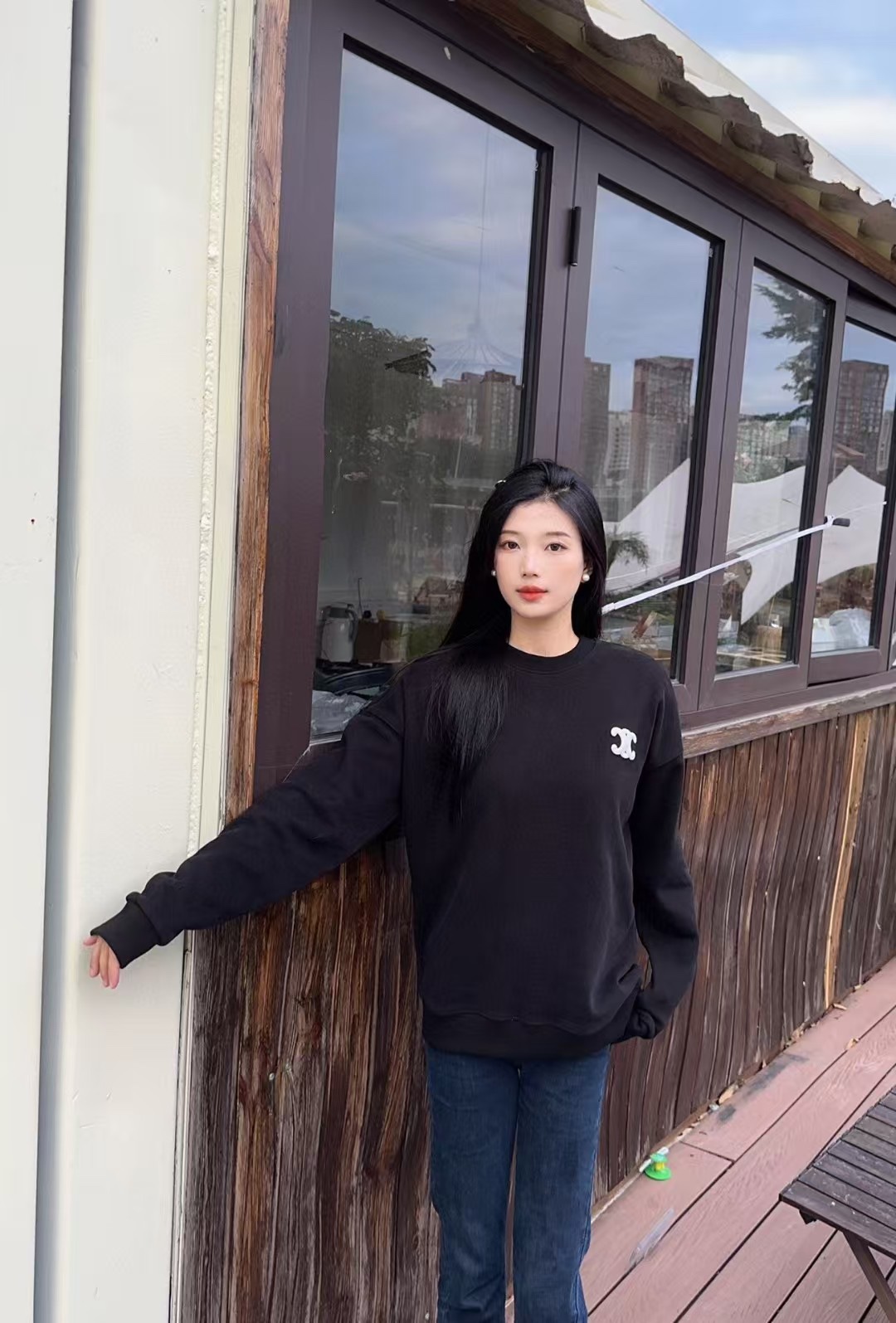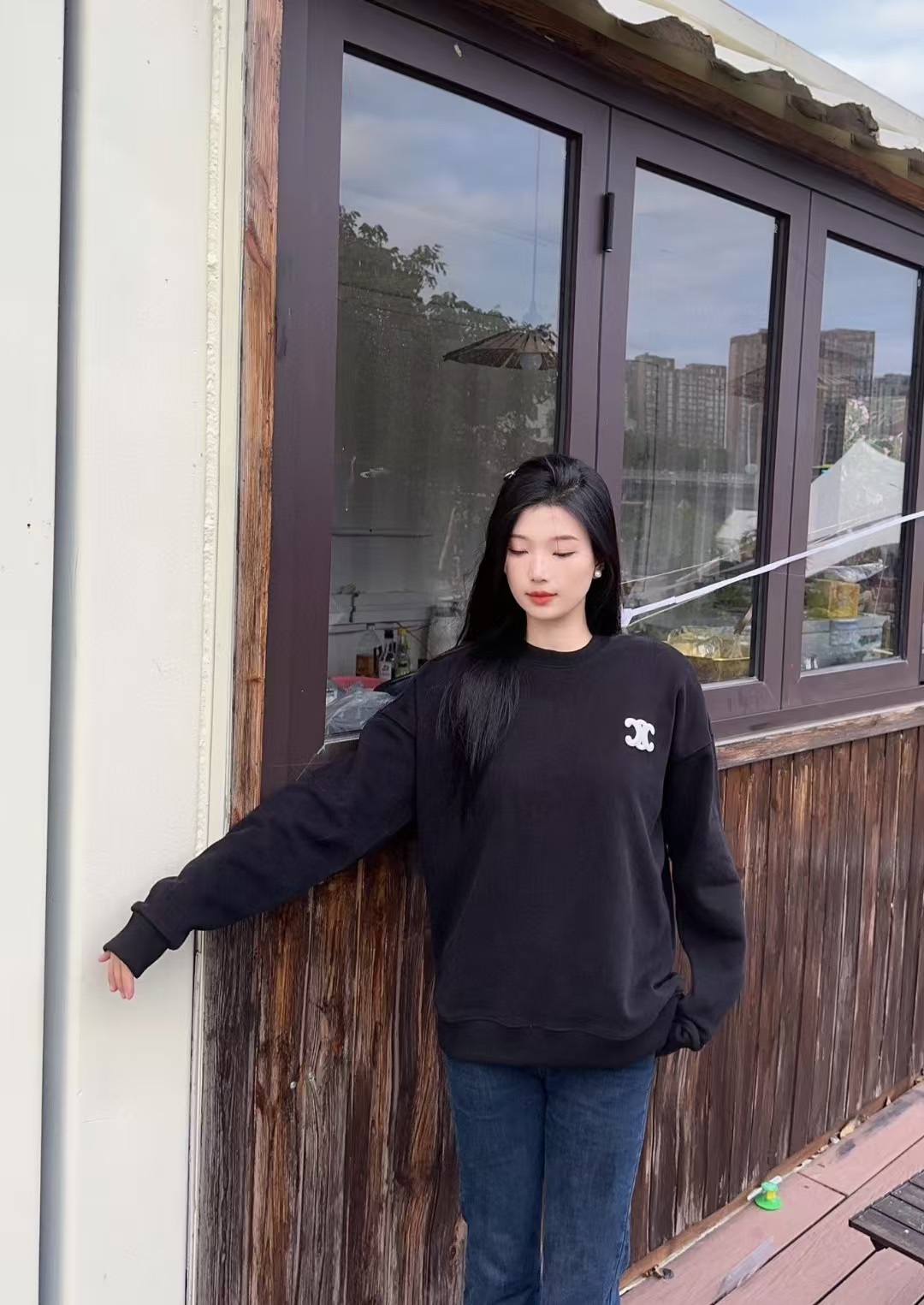 The wearing effect of the CELINE/ Celine Arc de Triomphe small label embroidered round-neck sweatshirt #