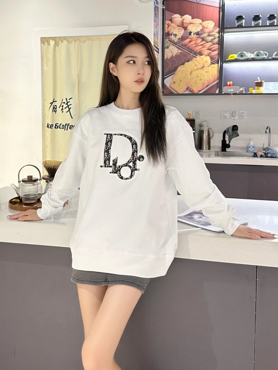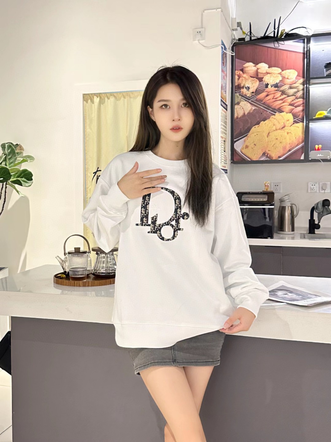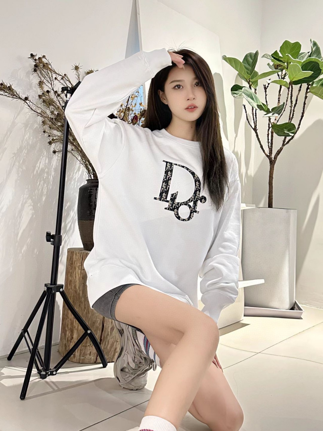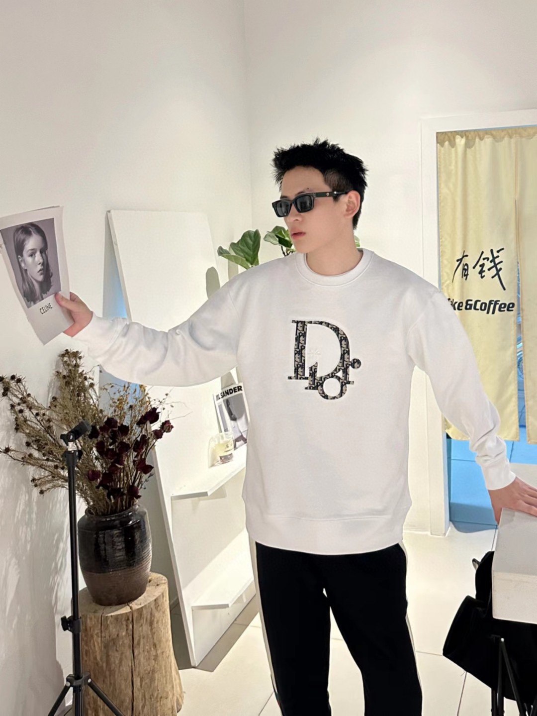 The effect of the model wearing it Dior/ Dior round-neck hoodie with applied-stitch embroidery on the chest