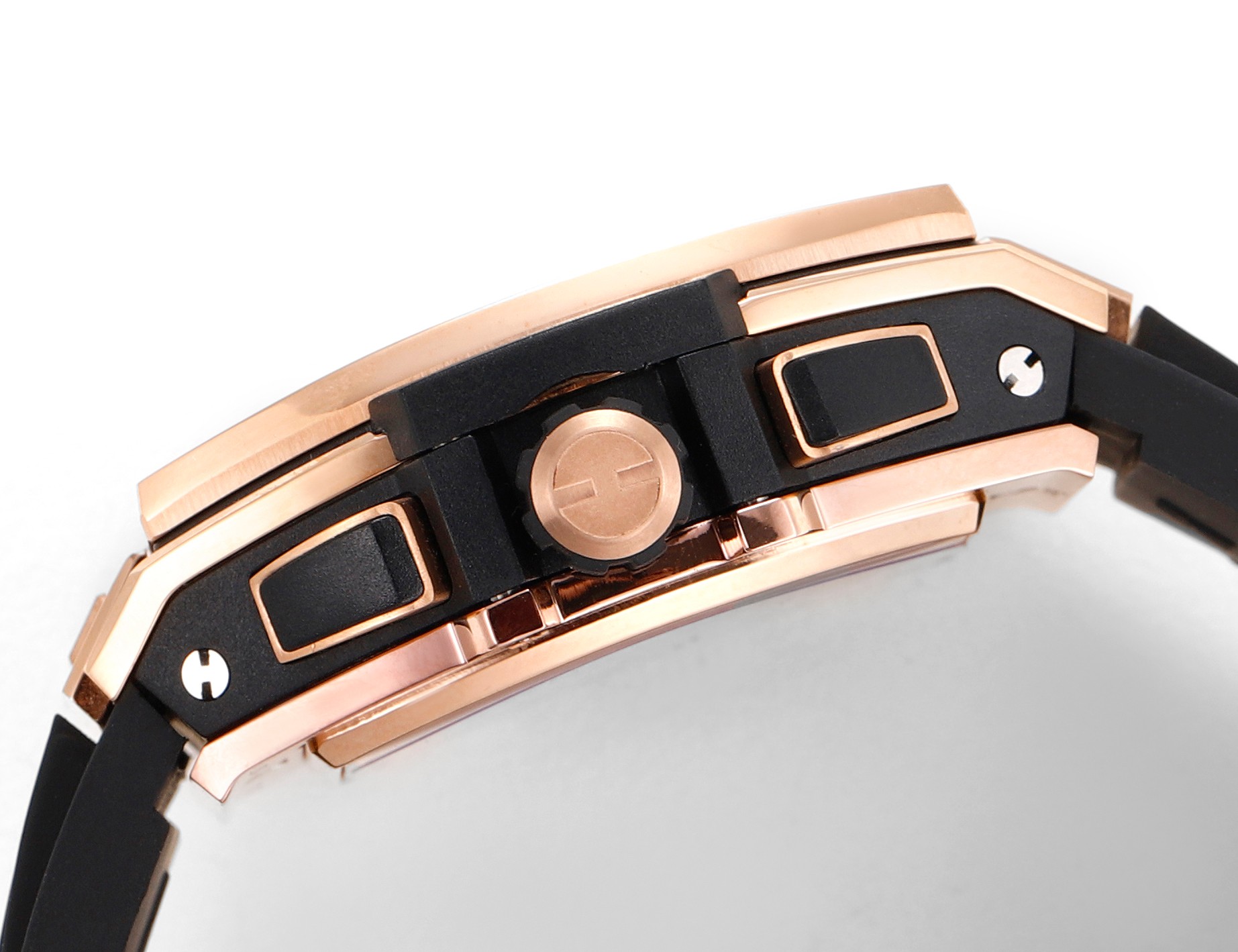 HUBLOT The Soul BIG BANG series. Model 642.NX.0170.RX Inspired by racing cars, a brand-new limited edition Spirit of Big Bang wristwatch is launched! The wristwatch combines all the iconic elements of the Spirit of Big Bang series with a brand-new barrel-shaped case. The case is made of titanium and resin materials, and a "sandwich" structure is constructed with six H-shaped screws, conveying the concept of "integrated technology". It perfectly replicates the exclusive custom HUB4700 movement, with an original folding clasp and a custom fluororubber strap. The watch is equipped with a "one-click" quick-change strap system. The wearer can easily and quickly change the strap with just a light press!!