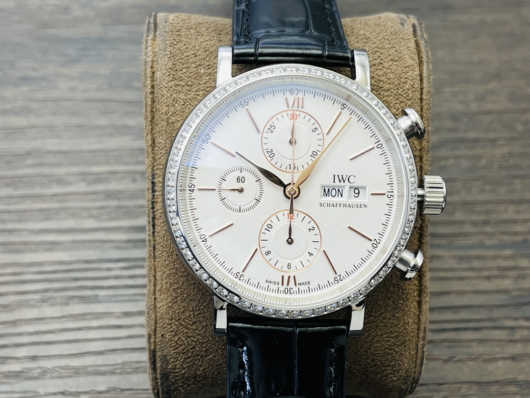 IWC Portofino Chronograph Men's watch! 1 ? The watch is 42MM in size and 13.5MM in thickness! 2 ? The case is made of 904L stainless steel, which has been finely polished to give a fine luster. It is set with 60 Swarovski crystal diamonds. The lugs are naturally curved and blend perfectly with the case. The lines are smooth and the luster is dazzling. 3 ? Equipped with Dandong 7750 modified 4601 automatic mechanical movement, all functions are in line with the original, with a closed case back and the anniversary emblem engraved on the case back! 4 ? Italian calfskin with pin clasps, easy to wear, excellent on the hand! IWS, a masterpiece of craftsmanship, presents the IWC Portofino Chronograph, vividly interpreting the timeless classic of Portofino. Welcome all watch enthusiasts to appreciate it!