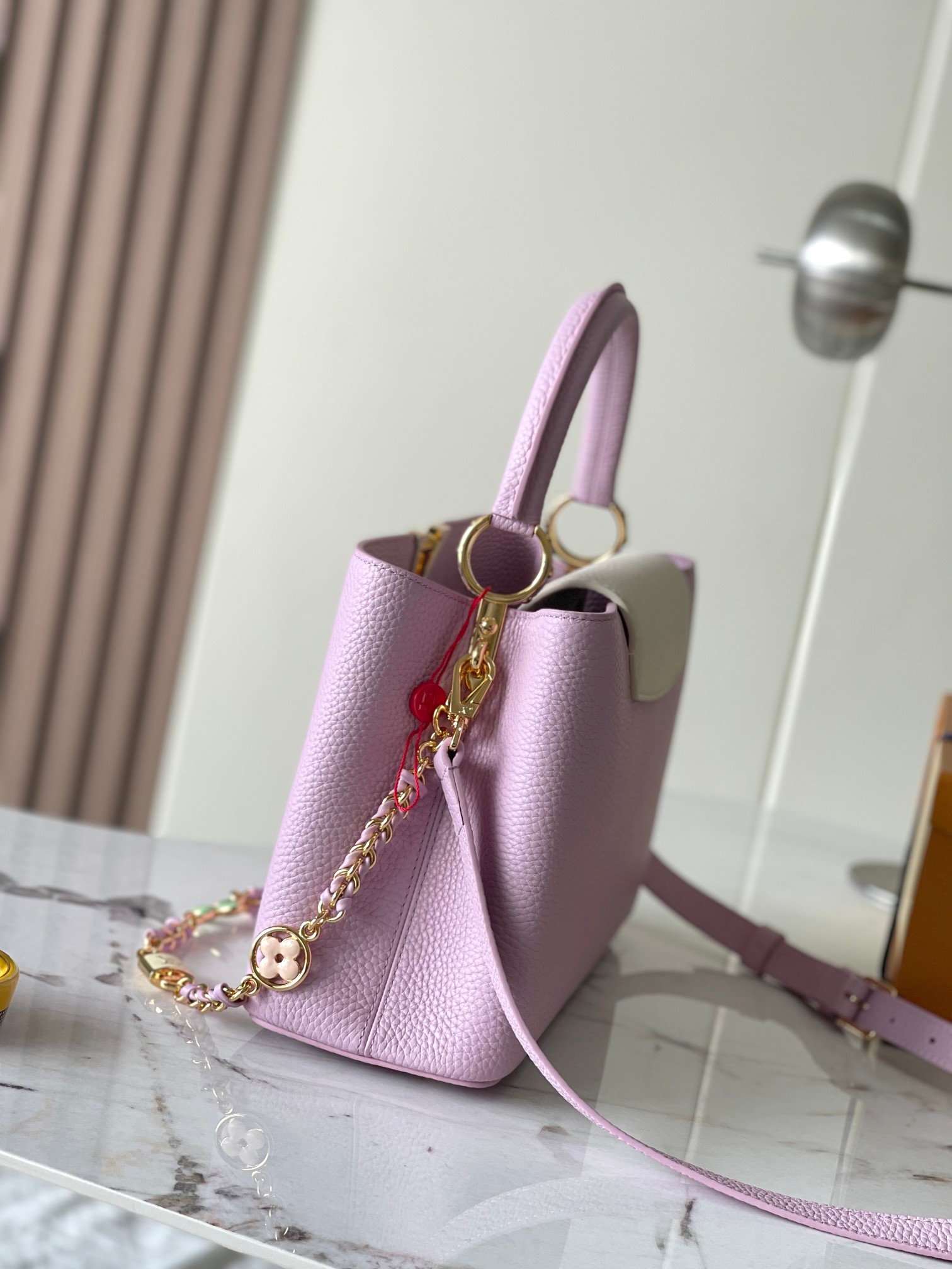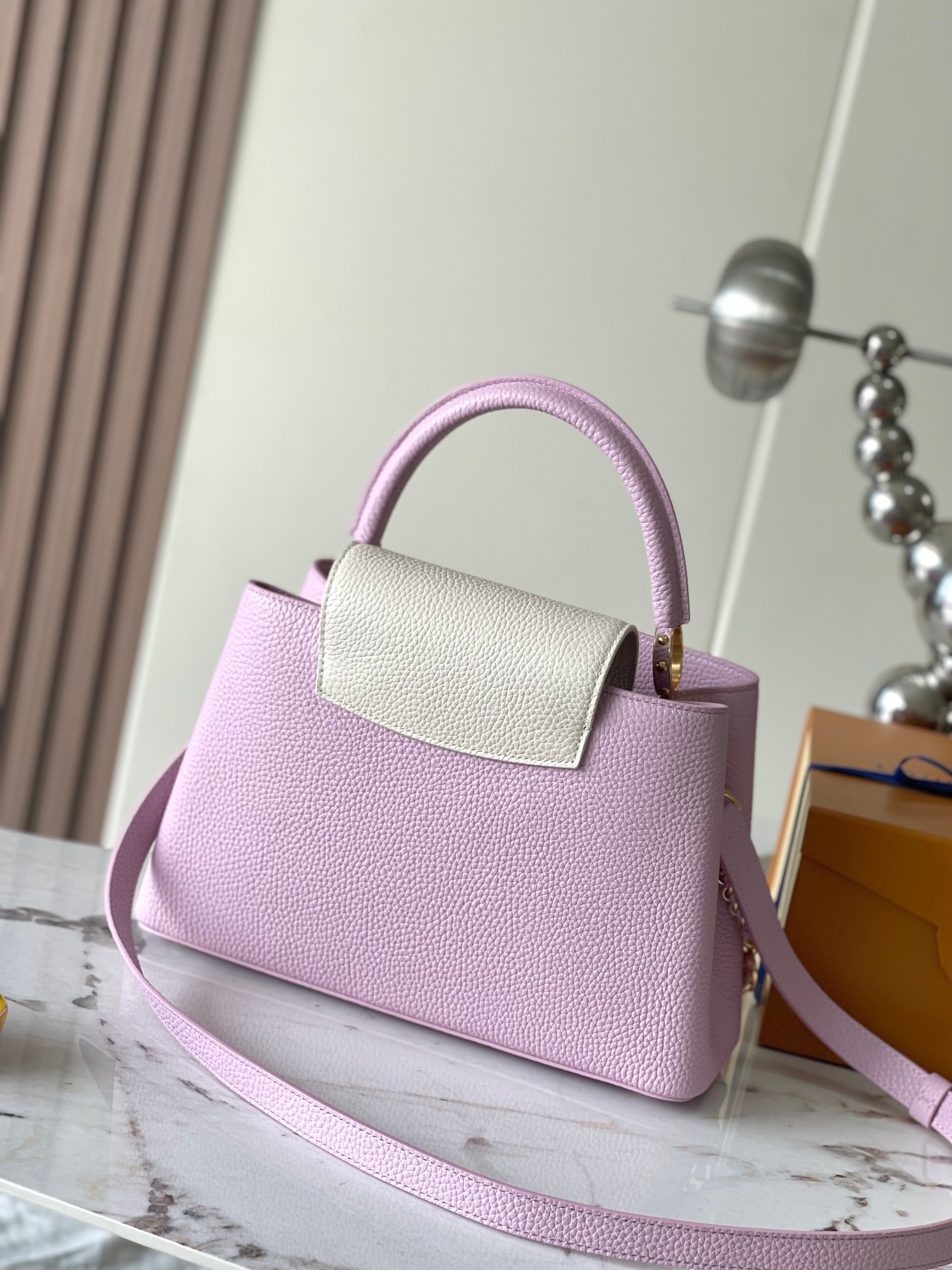 (Dynamic chip version) [Premium ORIGINAL FACTORY leather ?? M24471 deep purple with white gold upgraded version hardware] ?? This Capucines handbag features a beautiful Lovelock woven chain with links connecting hand-painted Monogram elements and LV signature padlock. The contrasting leather creates the iconic LV logo, exuding an elegant charm. Size: 31.5 * 20 * 11 cm