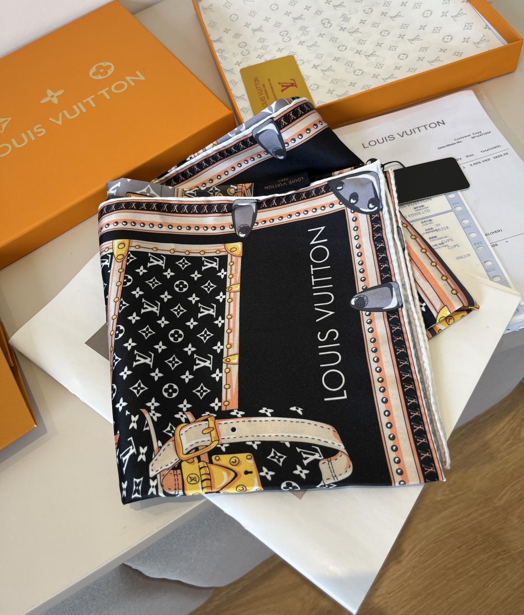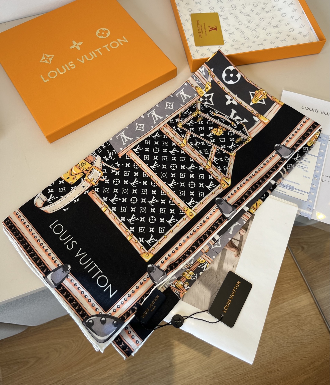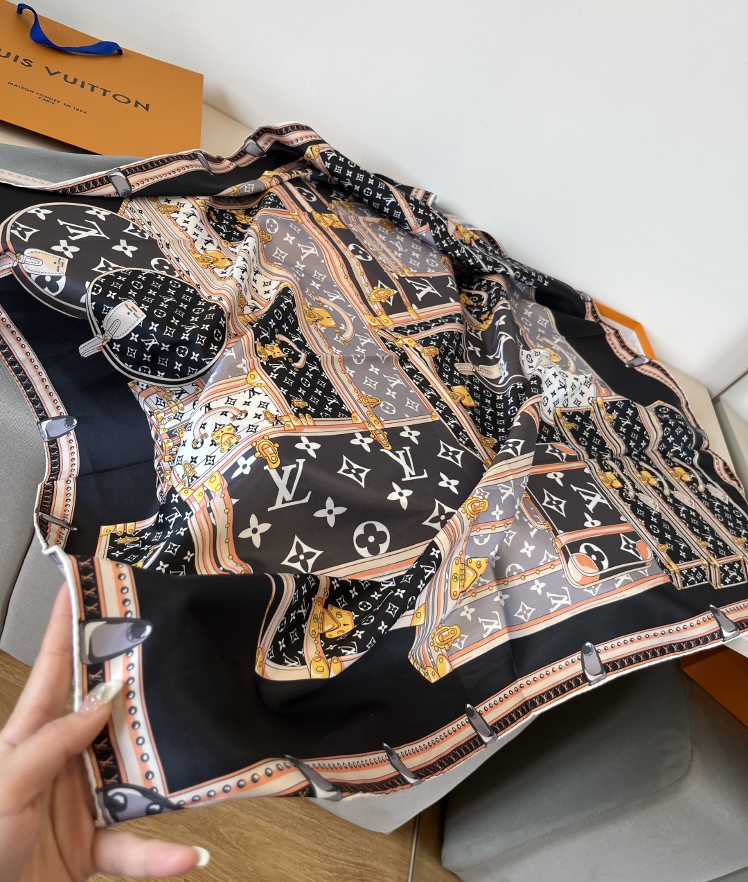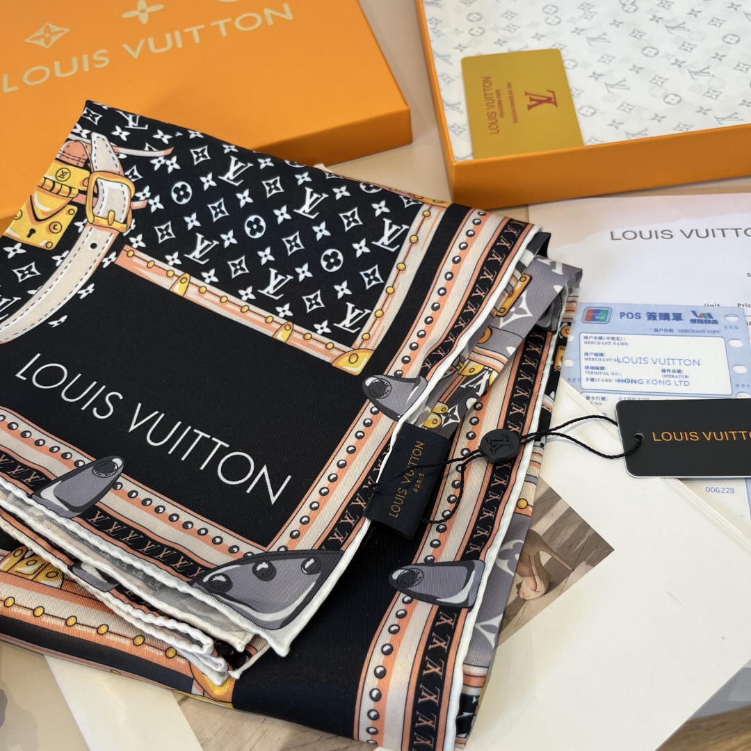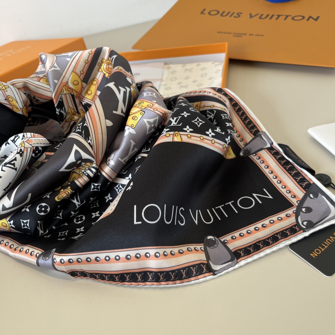 The Let's Go 90 handkerchief, relying on the silk-screen printing technique, depicts hard cases, studs, metal corner patterns and LV letters of various sizes with colorful strokes, highlighting Louis Vuitton's travel heritage. Paired with contrasting color silhouettes and hand-rolled edges, it has been newly added to the brand's accessory collection. 90 x 90 centimeters 100% silk