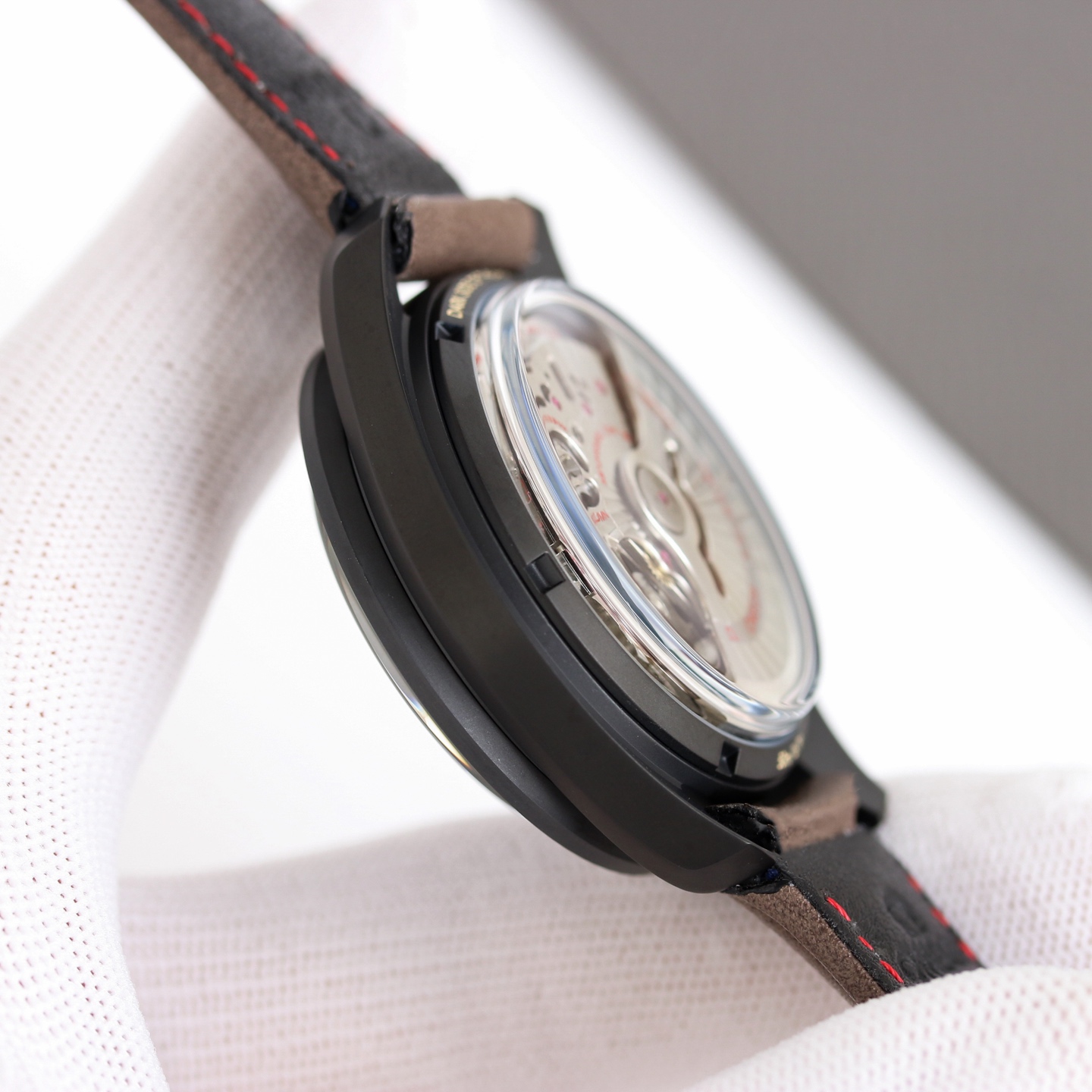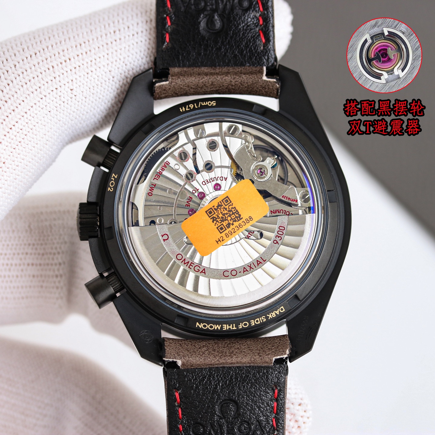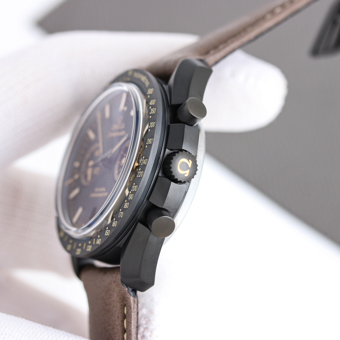 Omega Speedmaster Moon Dark Dial Watch 311.92.44.51.01.006 44.25mm coaxial chronograph, self-developed and self-made 9300 movement. The 3 o 'clock dial is a cumulative chronograph dial for 12 hours and 30 minutes. All functions and appearance are designed in accordance with the original [1-1] version. Movement: 9300 Double T black balance wheel, automatic winding coaxial Master Chronometer chronograph movement. The rhodium-plated surface of the movement is decorated with a special Arabic-style Geneva waves Ring opening: Frosted ceramic brown luminous coating + super luminous Dial: Matte ceramic dial, with brown lacquered hands on the small dials at 3 o 'clock and 9 o 'clock Case: Matte black Watch strap: Brown leather strap Mirror surface: The double-pot lid glass mirror surface is wear-resistant Function: Date display timing